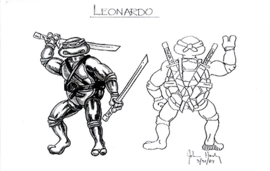 Il fallait aussi que les tortues soient moins complexes tout en restant plus réalistes. L’un des croquis préparatoires finaux de Leonardo est daté du 31 mars 1987. Peter Laird était de cet avis également. Il fallait faire un jouet de petite taille, un peu comme un G.I. Joe, avec 9 centimètres de hauteur. Cela faciliterait par ailleurs la réalisation des véhicules mieux adaptés avec ce type d’échelle ainsi que la production qui faisait ainsi de grandes économies. Chaque véhicule devait avoir la marque de fabrique des tortues, avec des références à leur visage, leur couleur de peau ou leur carapace, comme c’est le cas du Turtlecopter, ou du Party Wagon. Les personnages devaient avoir une posture dynamique, avec les jambes et les bras fléchis pour ne pas donner l’impression de jouets mal articulés et droits comme des branches sèches.