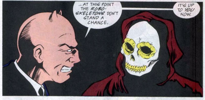 Le squelette partit pour un désert qu’il avait lui-même créé en éradiquant la vie dans une région entière et se lança à la poursuite de Juntarra, la mère de Jagwar. Celle-ci essaya de lui échapper, en vain (Mighty Mutanimals #1). Après l’avoir conduite dans son antre, la créature vit que son fils approchait plus rapidement que prévu et commença à élaborer un stratagème. Préparant une mixture dans un chaudron, il envoya des crânes ailés retarder le groupe de Mutanimals. À son réveil, Juntarra chercha à s’enfuir et fut arrêtée par Null (Mighty mutanimals #3).