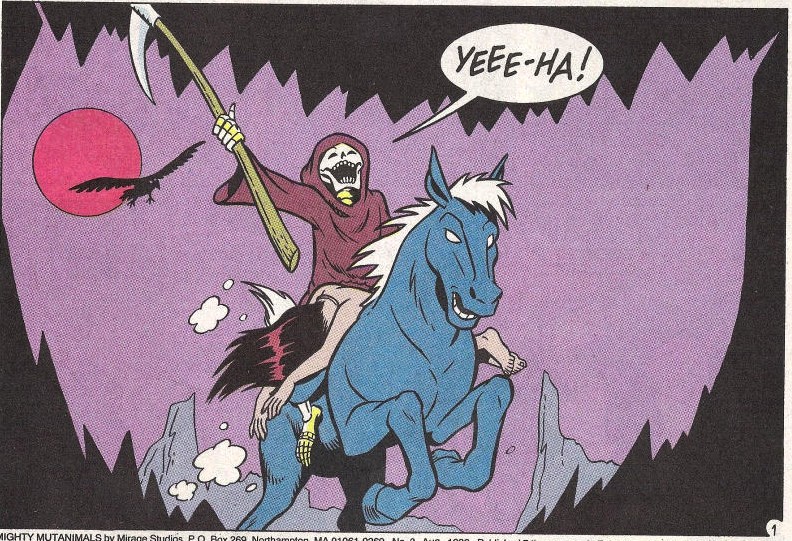 Finalement, après bien des épreuves, les Mutanimals, conduits par Jagwar, arrivèrent à proximité de l’antre de Null et de Death. Une armée de robot arriva pour les neutraliser (Mighty mutanimals #5) mais les héros mutants purent compter sur l’intervention des tortues. Ensemble, ils réussirent à repousser l’assaut des machines. Death lui aussi voyait les renforts arriver en la présence de ses compagnons Pestilence, Famine et War (TMNT A. #38). Il manipula l’esprit de ses adversaires, les plongeant dans des illusions en lien avec les caractéristiques de ses compagnons, la maladie, la faim et la guerre pour en venir à bout (Mighty mutanimals #6). Neutralisés, les mutants furent attachés à des piquets pour être tués. Azrael parvint à s’échapper de la prison de Null et libéra ses compagnons pour affronter les