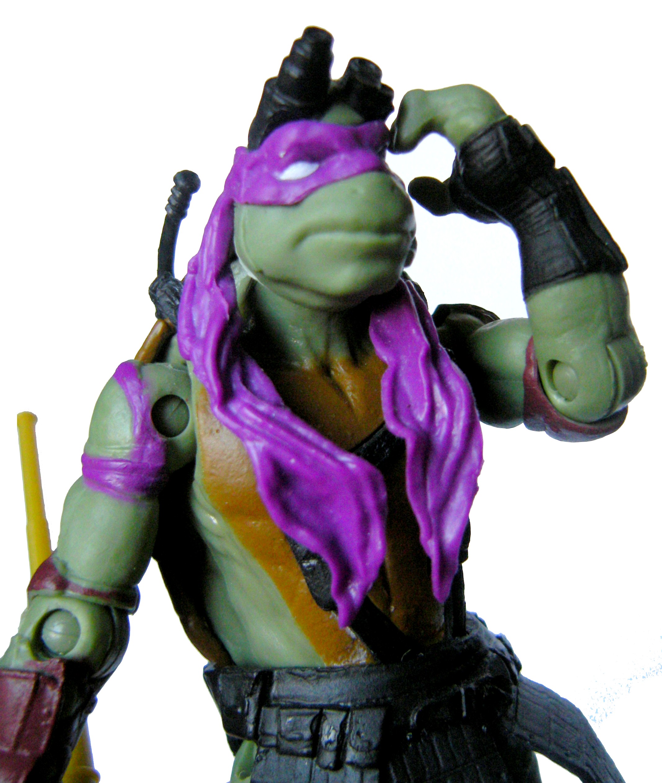 La figurine de Donatello semble aux premiers abords excellente. Elle ne possède pas ses ridicules lunettes de rat de laboratoire, si souvent moquées, et sa panoplie, bien qu’incomplète, est plutôt détaillée. Son pack dorsal est extrêmement bien réalisé. On pourrait regretter l’absence de plus de détails peints, mais l’ajout de ces lunettes sur sa tête permet d’avoir une figurine plutôt originale et unique dans l’ensemble des figurines TMNT. Ses articulations sont malheureusement très rares, et la l’allure générale de la figurine n’est pas idéale pour lui faire avoir une position dynamique. Finalement la position idéale pour Donatello est droite, bâton en main, soit s’appuyant dessus, soit le gardant de côté et réfléchissant.