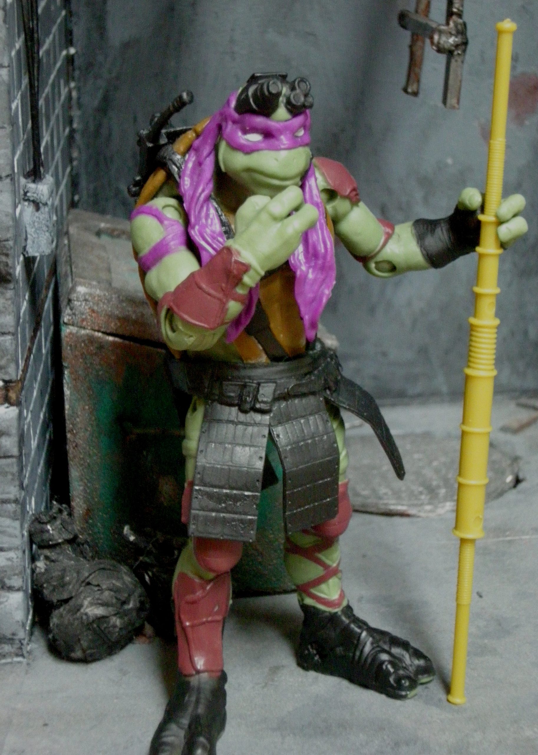 Donatello est le génie du groupe, comme dans la plupart des univers. As du bricolage et des inventions, il s’est confectionné une panoplie rappelant une armure samurai au sommet de la technologie. Muni de ses lunettes nocturnes, de son pack dorsal, et de son cerveau, Donatello peut résoudre à peu près n’importe quel problème, de n’importe où.
