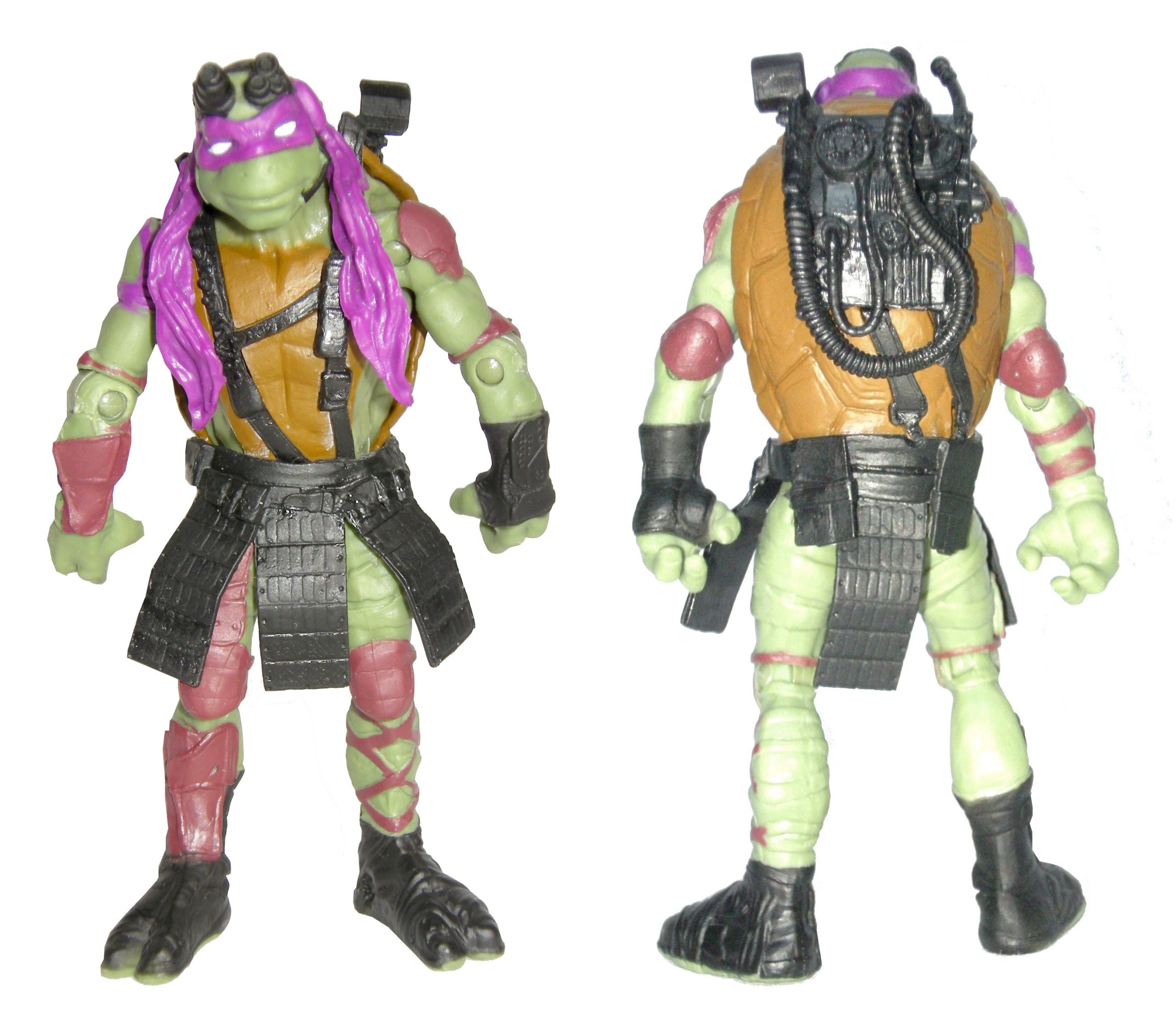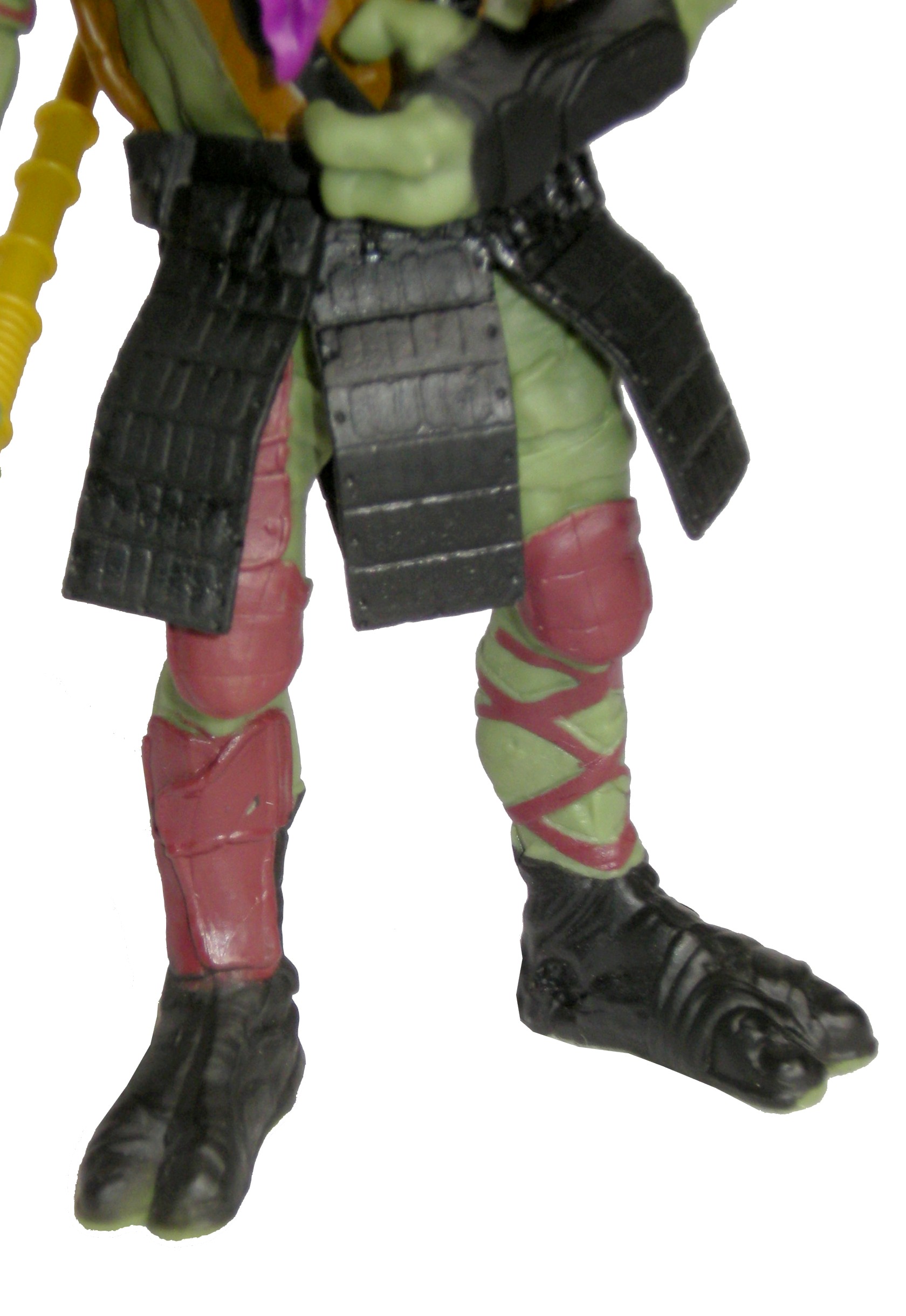A première vue, la figurine de Donatello semble plutôt complète au niveau de la peinture. Mais finalement les teintes sont très restreintes. Sa peau est d’un vert pâle, identique à celui de sa figurine de la série animée. Son bandeau est entièrement violet, et très plissé. Autre détail de cette couleur, des bandes sur son bras droit. Son plastron est jaune, et sa carapace brune claire. Il possède encore deux couleurs, du brun qui tend vers le bordeaux pour ses nombreuses protections, aux jambes comme aux bras, et du noir pour ses lunettes, son pack dorsal, son pagne de panneaux solaires et ses bottes.