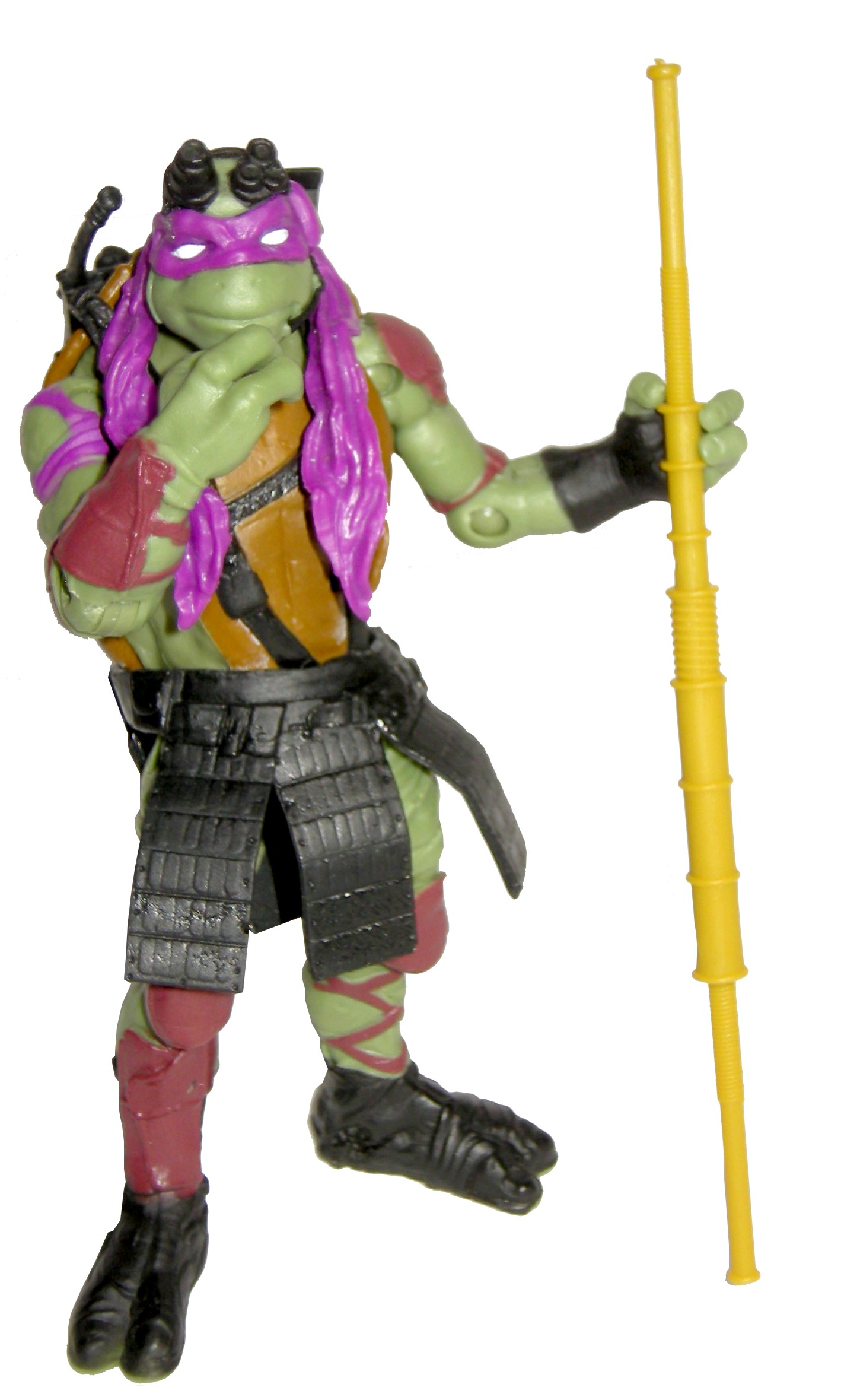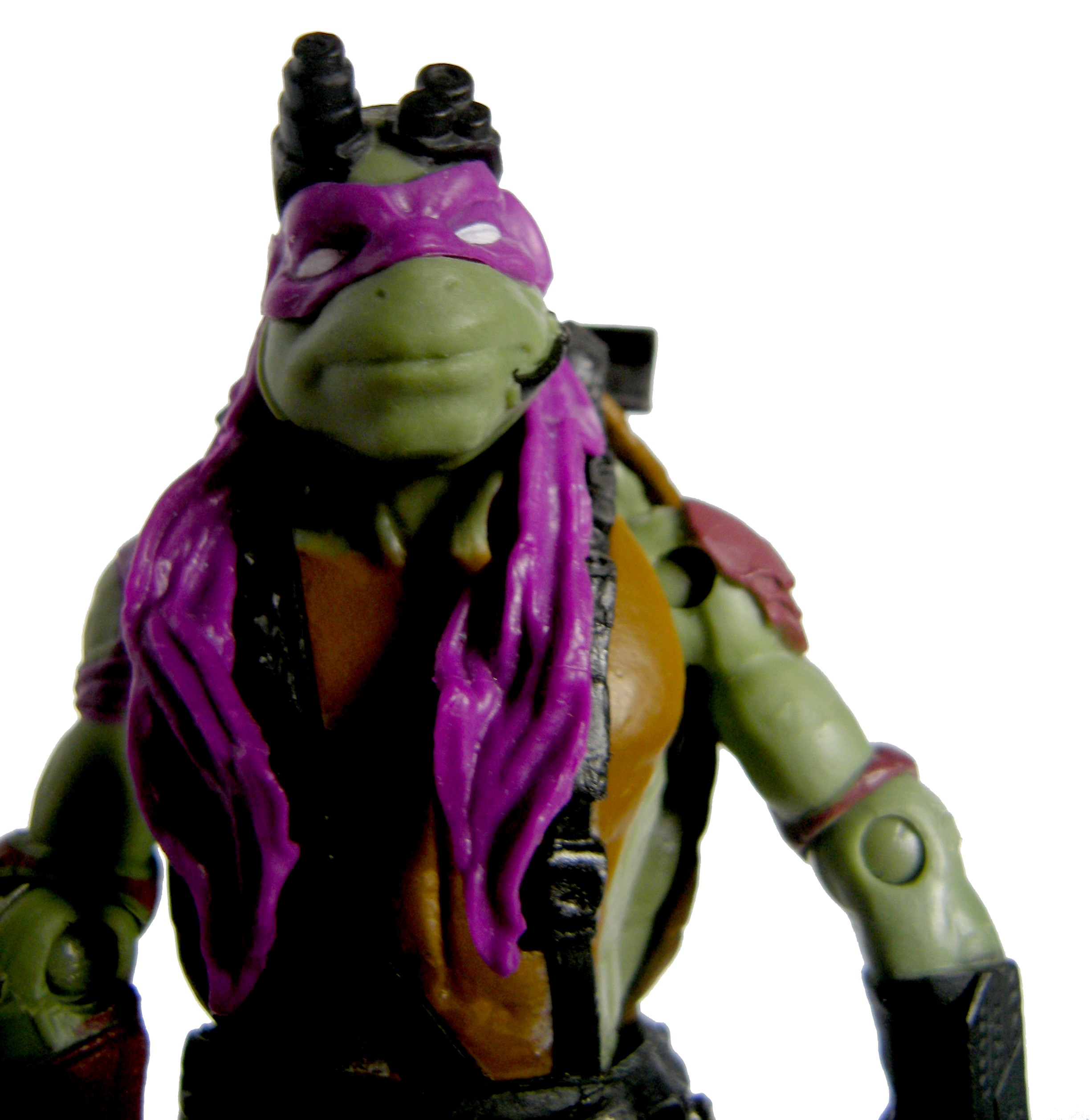 Le visage de Donatello est relativement simple, arrondi, et muni d’un long bandeau, qui retombe jusqu’à la moitié de son buste. Des lunettes hi-tech sont placées sur son front, et il possède une oreillette, avec micro placée à la gauche de sa bouche. A noter qu’à l’inverse du personnage du film, Donatello ici ne possède pas de lunettes.