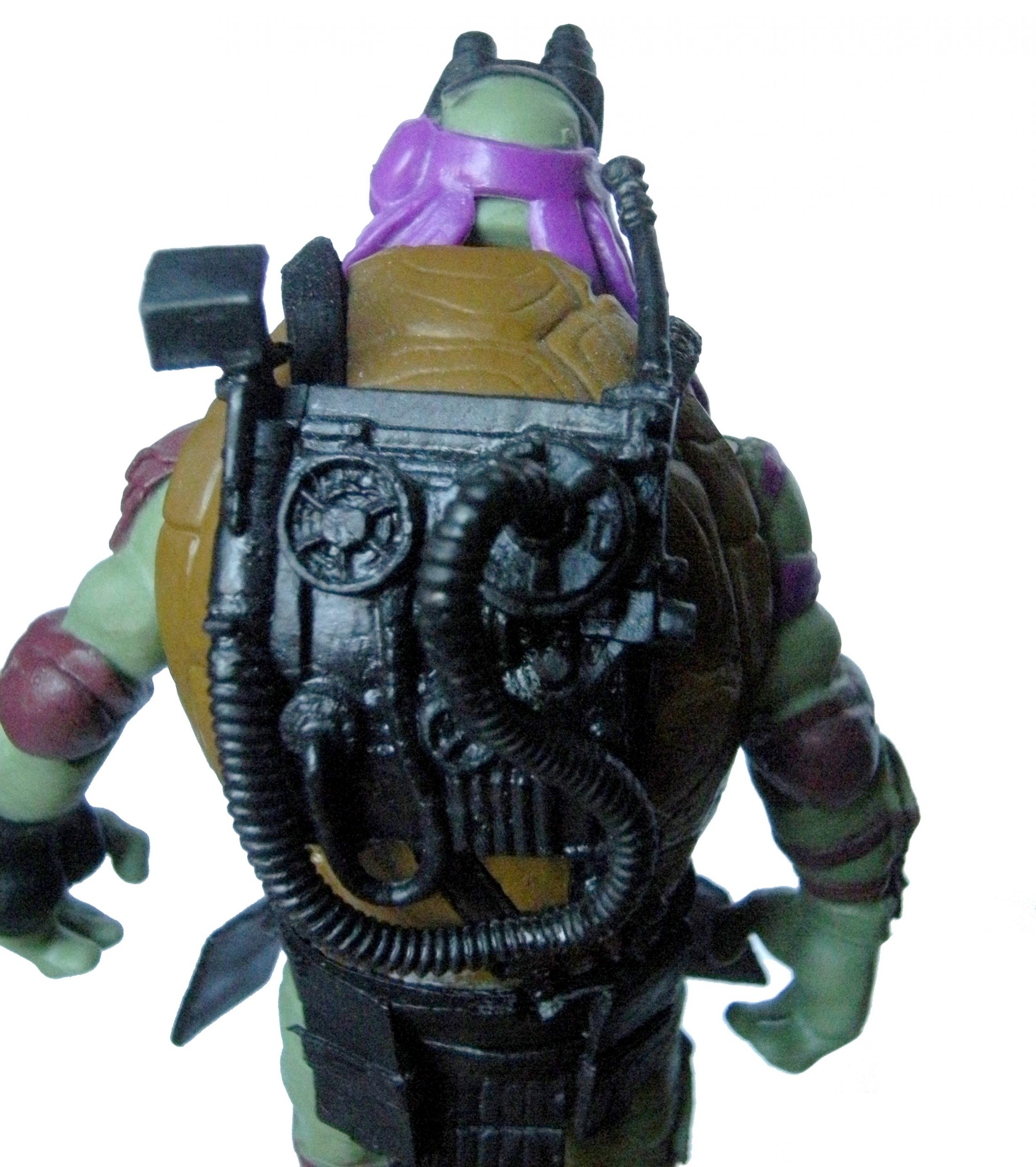 Le buste de la tortue est relativement simple, muni de plusieurs ceintures qui servent à retenir son étrange pack dorsal, rappelant beaucoup ceux des Ghostbusters, accroché à sa carapace. Il est très complexe, avec plusieurs tuyaux et des détails très précis. a sa taille se trouvent des plaques, visiblement dans