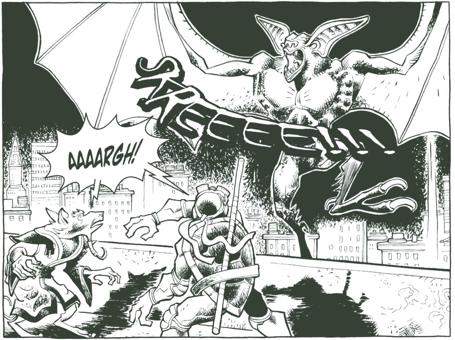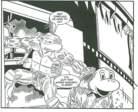 perfectionner son invention et l’étendre à l’ensemble de l’île. Il pouvait ainsi détecter aussi bien ce qui se trouvait dans le repaire, que Raphael qui se trouvait à cet instant à Harlem. Splinter lui montra une forme étrange qui se déplaçait à proximité du repaire, et qui semblait pouvoir voler. Les deux mutants montèrent sur une tour de la ville pour essayer de repérer l’intrus dans les airs. La créature commença à les attaquer. Il s’agissait d’une chauve-souris géante, qui emmena avec elle Donatello. Splinter demanda l’aide à Michelangelo. Ils partirent tous deux dans les docks, grâce à la détection de la machine que Donatello avait mise au point.