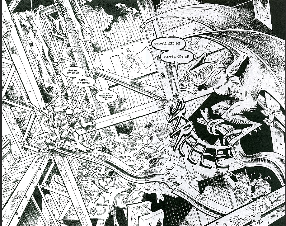 La tortue avait tenté de comprendre la créature : il pensait qu’elle cherche à rentrer chez elle. Sa famille lui vint en aide. De retour dans le repaire, Donatello apporta quelques modifications sur son invention pour savoir si d’autres de ces créatures étaient en ville. Il en repéra treize. Soudain, l’ordinateur surchauffa et se mit à brûler (TMNT Movie Prequel #3: Donatello).