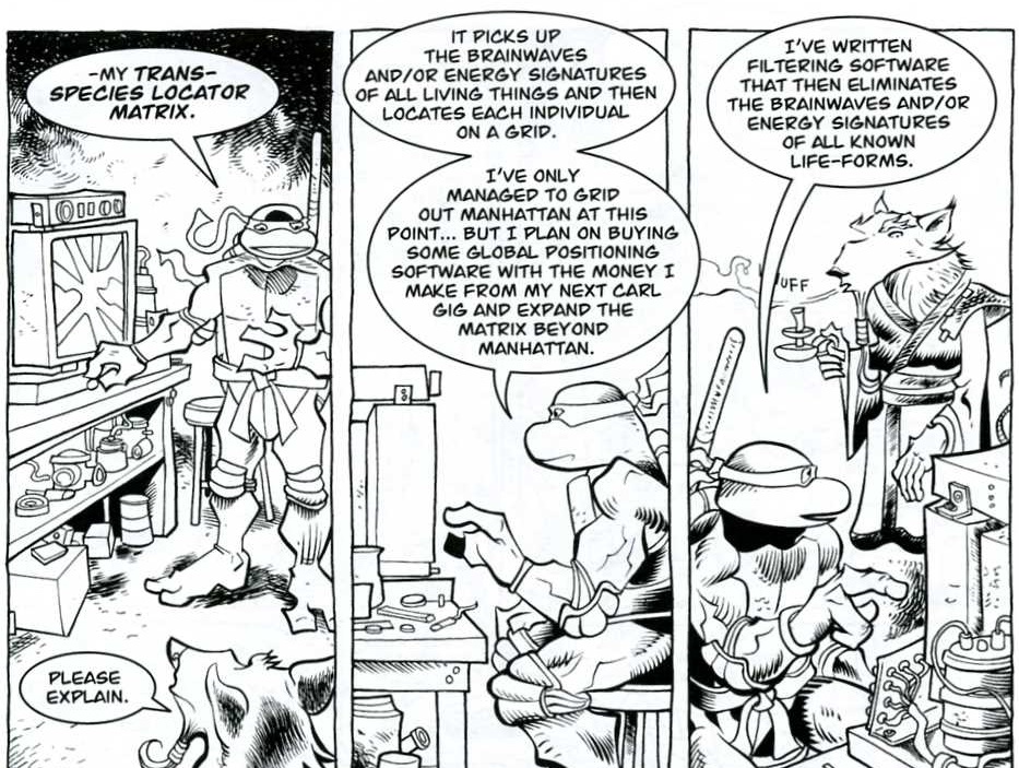 Un jour, Splinter se montra très intrigué par la dernière invention de son fils, une matrice de localisation d’espèces. Ce logiciel permettait à Donatello de détecter toutes formes d’espèces vivantes étrangères, mutantes ou autres, sur Manhattan. Il travaillait parallèlement avec Michelangelo pour gagner un petit peu d’argent pour pouvoir