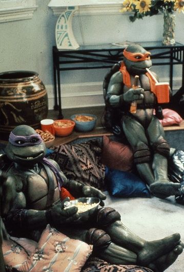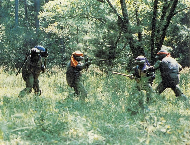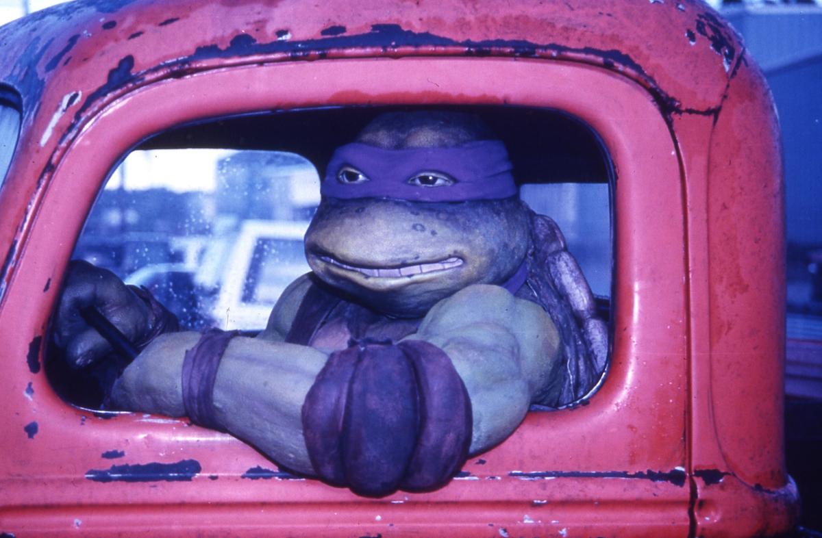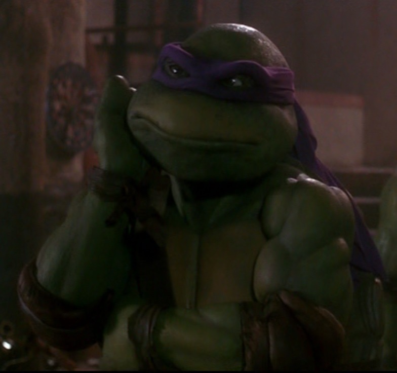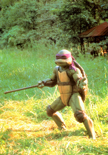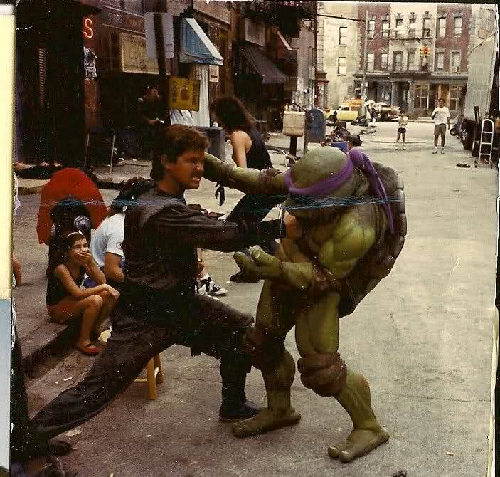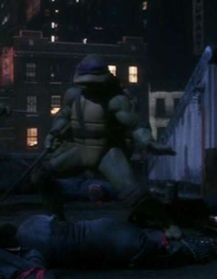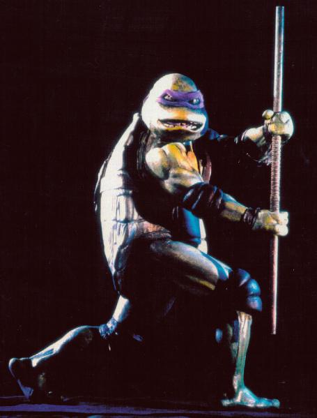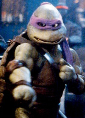 - Chaque tortue avait une doublure attitrée pour réaliser les cascades dans les films. Pour Donatello, c’était le jeune Ernie Reyes Jr. qui endossa le costume dans le premier film. Initialement, ce rôle était attribué à un cascadeur de l’équipe de Hong Kong, comme pour toutes les tortues et Shredder. Malheureusement, l’homme se blessa, certainement lors des répétitions, avant le début du tournage. Son nom est totalement inconnu et fut remplacé sur le pied levé par la jeune star montante des arts martiaux, alors âgé de 17 ans. Grand adepte des sports de combat à un niveau quasi-professionnel, il s’était fait remarquer sur le tournage.