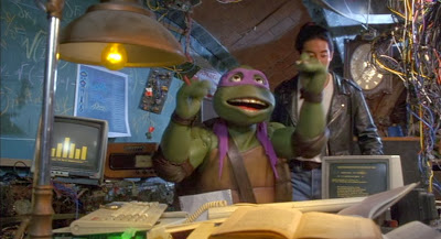 Le côté geek et scientifique de Donatello est mis en avant dans ce film. Il portait un très grand intérêt pour le discours du professeur Perry sur les enfouissements illégaux du T.G.R.I. Lorsque les tortues partirent chercher des réponses à leurs questions dans les locaux de l’entreprise sans remords, l’amateur d’informatique essaya d’en savoir plus sur les bases de données. Hélas pour lui, elle était cryptée et l’ordinateur s’éteignit.