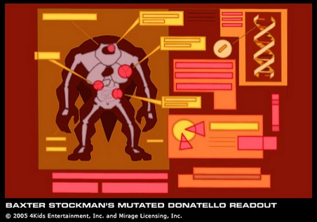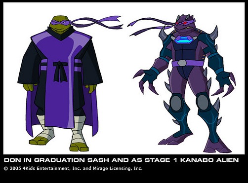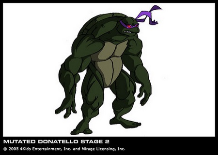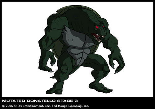 A la fin de la saison 4, les tortues tentent de mette fin à l’invasion de mutants créés malencontreusement par Bishop. Au cours d’un combat dans les égouts, il se fait infecter par un insecte humanoïde (L’épidémie, S4 E17). Pendant plusieurs épisodes, on retrouve Donatello avec un bandage sur la cuisse, avant de tomber malade, avec une très forte fièvre. Il reste chez Casey et April pendant que ses frères partent chasser des mutants, et c’est à cet instant qu’il commence à se transformer en une créature hideuse et très dangereuse (Problèmes familiaux, S4 E23)1. Les tortues doivent trouver une solution, et font un marché avec Bishop pour tenter de lui rendre son apparence physique. Ce dernier a les ordres de retrouver un artefact dans la tour des Foot, il profite de ce marché pour le réclamer aux tortues, qui partent le voler. L’artefact en main de Bishop celui-ci respecte sa promesse et soigne Donatello (Un pacte inattendu, part.2, S4 E25).