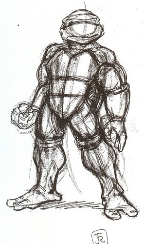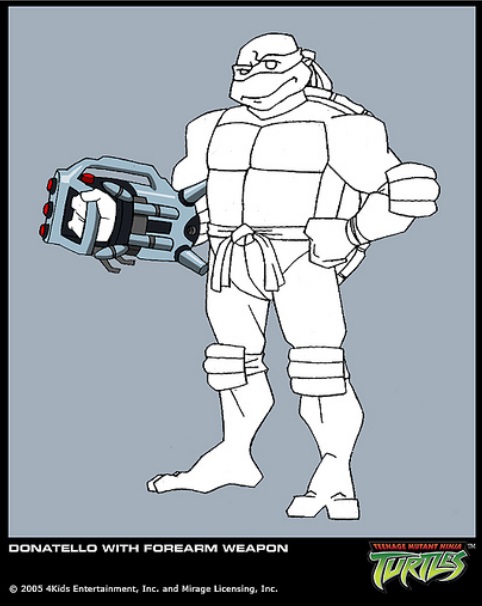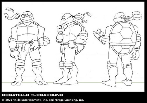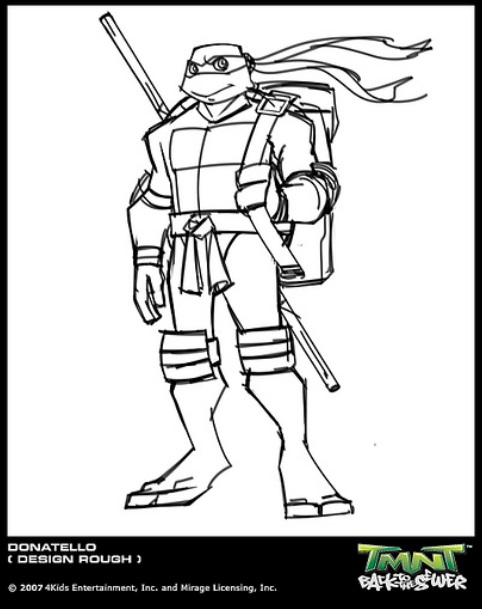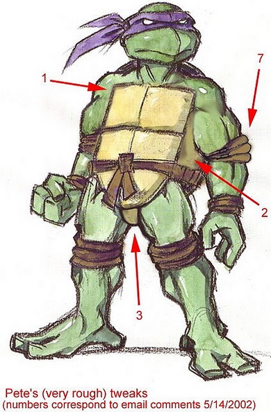 Nous avons la chance d’avoir un croquis, que Peter Laird a publié sur son blog1, expliquant la création de Donatello, dès le début du projet de la série en mai 2002. Il explique que la production lui avait envoyé quelques croquis sur lesquels il devait retravailler les tortues à partir du design original. Il devait conserver l’essentiel de leur aspect, tout en leur donnant un design unique et s’éloignant de ce qui s’était vu dans le dessin-animé précédent. On voit ici quelques croquis au crayons, avec des recherches de couleurs. Les numéros sur l’un des croquis correspondent aux changements principaux qui sont effectués.
