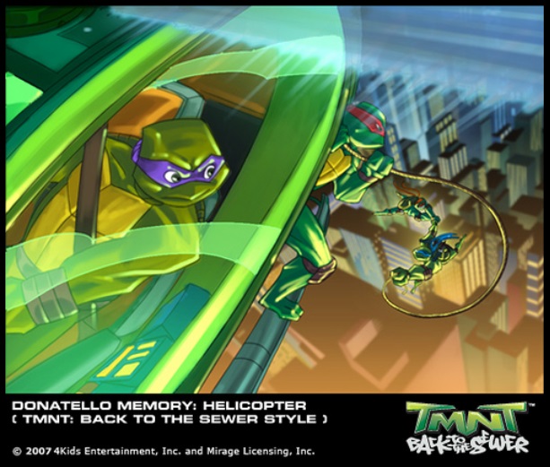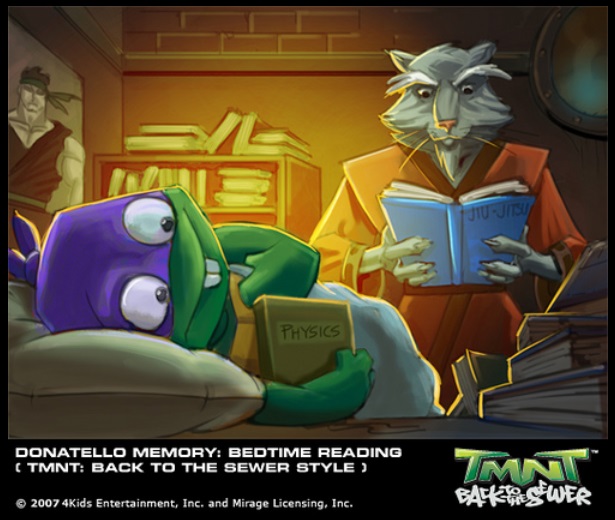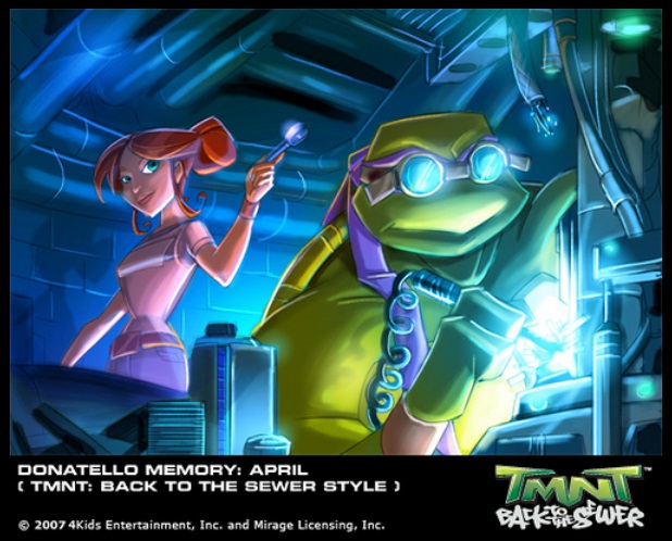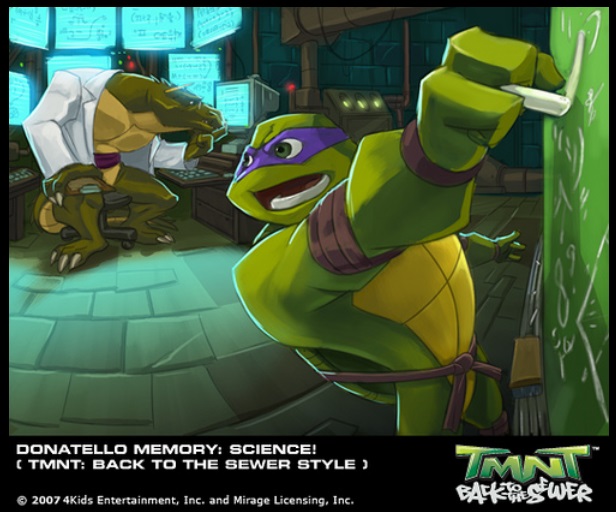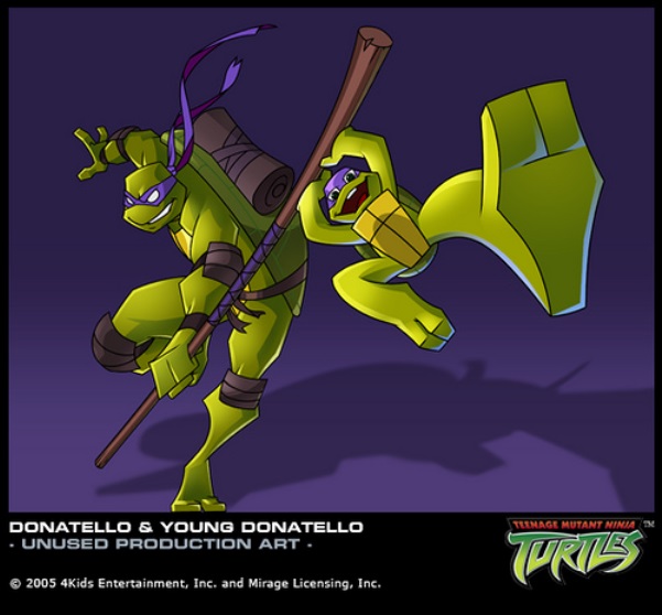 Dès sa plus jeune enfance, il développe une intelligence supérieure à celle des autres tortues, et se construit même une voiture télécommandée. Celle-ci tombe dans le courant des égouts, et il tente de la récupérer au péril de sa vie. Il est entrainé à son tour par le courant, et Leonardo qui se trouvait là part à sa rescousse (Souvenirs , S1 E19).