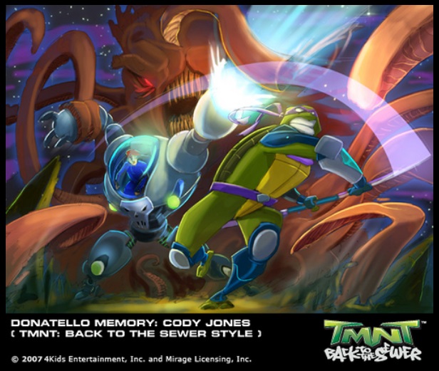 Cody et lui concentrent leurs esprits pour créer un portail temporel et ainsi permettre aux cinq voyageurs temporels de retourner à leur époque. Une fois la machine terminée, les tortues et le rat repartent chez eux. Mais Serling part également, et Viral s’était introduite dans le programme voyageant clandestinement. Dans le tunnel temporel, elle prend possession de Serling, qui tire sur les tortues. Splinter se sacrifie prenant le tir, et est décomposé en des dizaines de données informatiques. Ainsi au cours de la saison, Donatello fabrique une machine permettant aux tortues de partir dans l’univers informatique pour réunir les données de leur maitre pour le faire revenir.