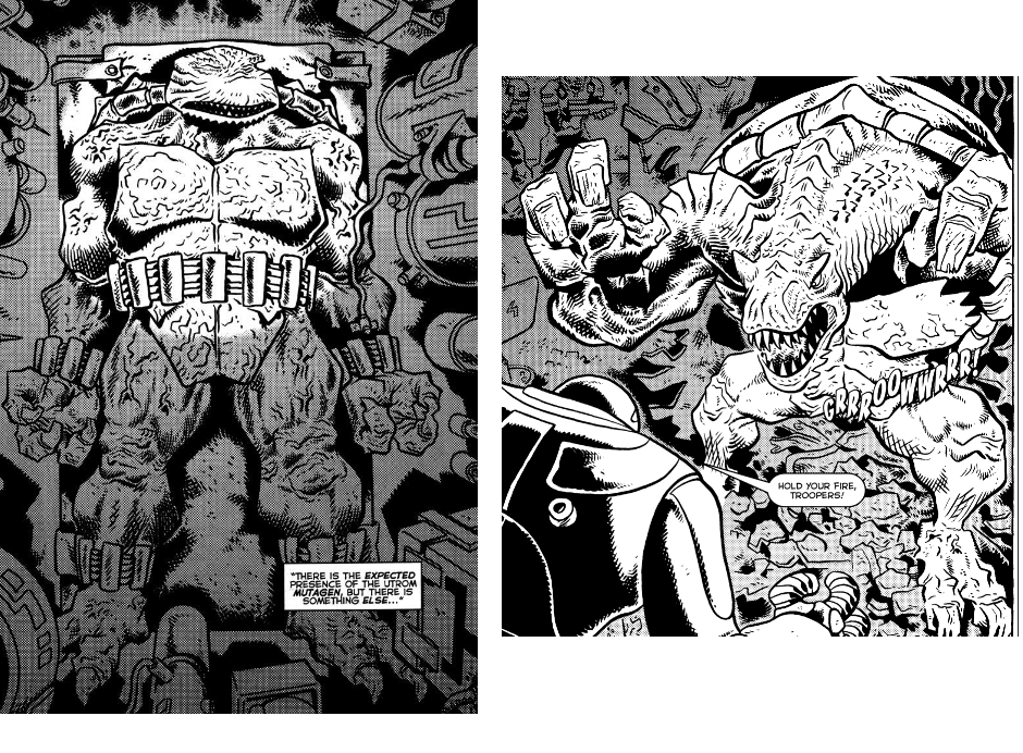 - 1Au cours de la quatrième saison, Donatello se fait infecter par un insecte mutant, et devient à son tour une créature dont la mutation a fortement altéré son esprit et son apparence physique. Il ressemble alors à une sorte d’immense crocodile tortuesque qui détruit tout sur son passage. C’est une référence directe à Raphael dans le volume 4 du comics original, qui se transforme en une créature similaire après avoir été mordu par des vampires. ⇑