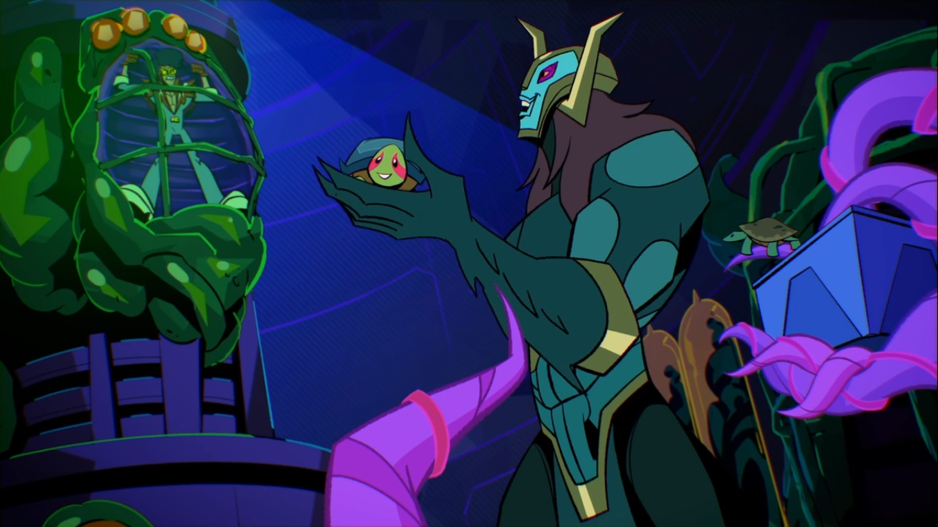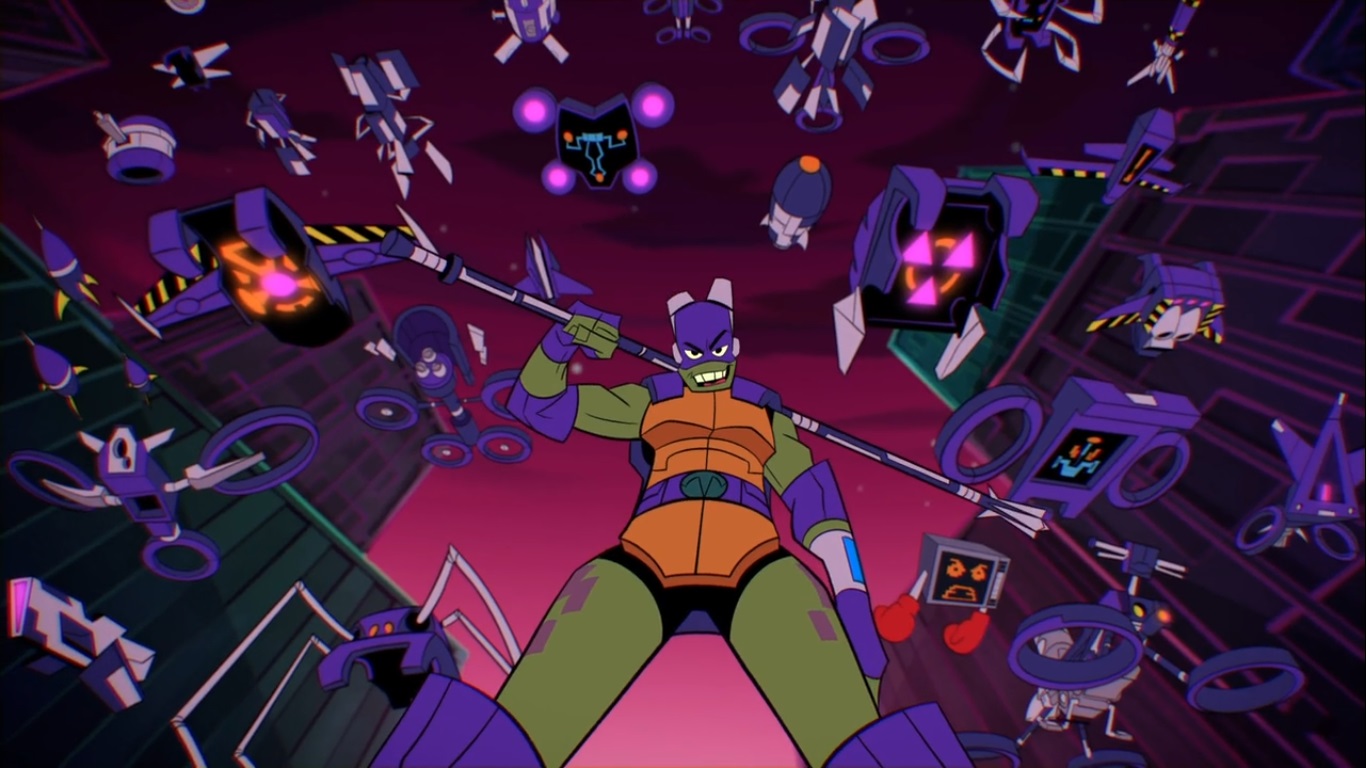 Après être parvenues à ouvrir le portail, les tortues ont fait la rencontre du baron Draxum. April leur avait montré une armurerie, où les mutants purent choisir de nouvelles armes, préférant la magie au maniement rudimentaire. Donatello ne tenait pas à changer d’arme, préférant garder celle qu’il avait mise au point et qu’il savait manier. Cela lui permit d’avoir le dessus sur Draxum lors du combat, contrairement à ses frères, qui découvraient encore les pouvoirs des leurs. Une fois encore, leur faible expérience joua contre les tortues. Mais les armes magiques leur :avaient permis de prendre la fuite, avec le chiot (Mystérieuse Pagaille, S1 E1).