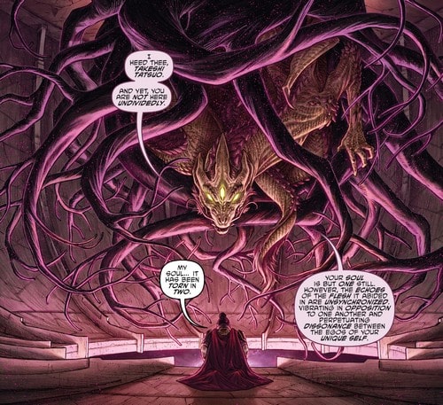 De colère, le Dragon empoisonna les rêves de sa sœur, créant tous les malheurs que l’humanité avait connus. Pour s’assurer qu’il ne représenterait plus aucun danger, Dreamer veilla à enfermer son frère dans l’âme d’un humain, qui vivrait et mourrait, et dont l’âme se réincarnerait éternellement, l’empêchant d’agir (Shredder in hell #4). Ainsi, il fut Takeshi Tatsuo, recueilli par Kitsune qui cherchait à ramener son père (The secret history of the Foot Clan #1).