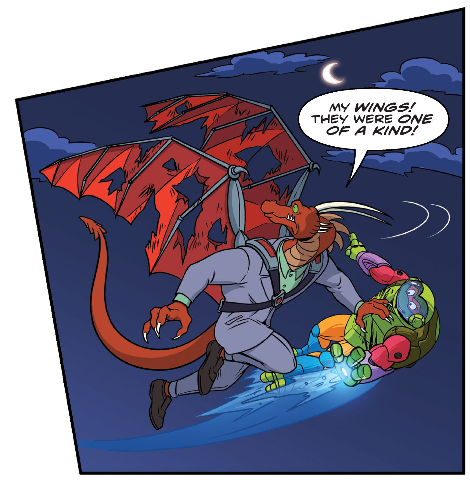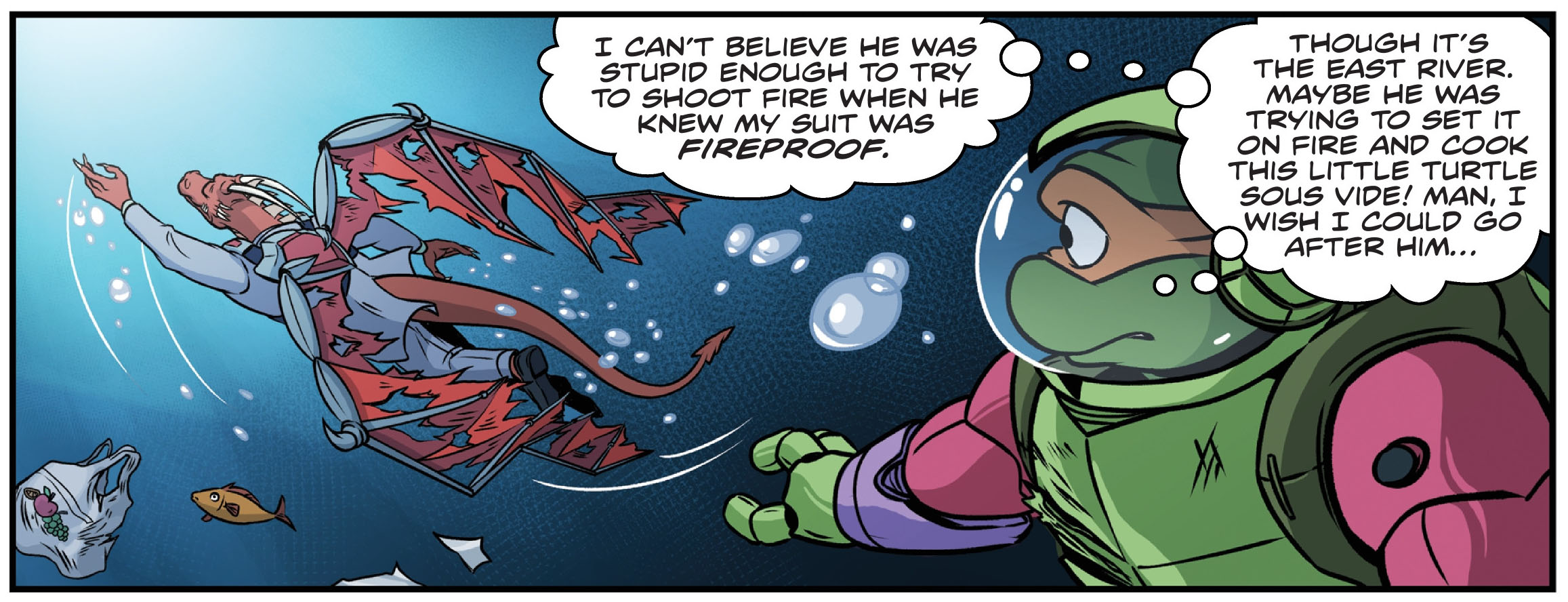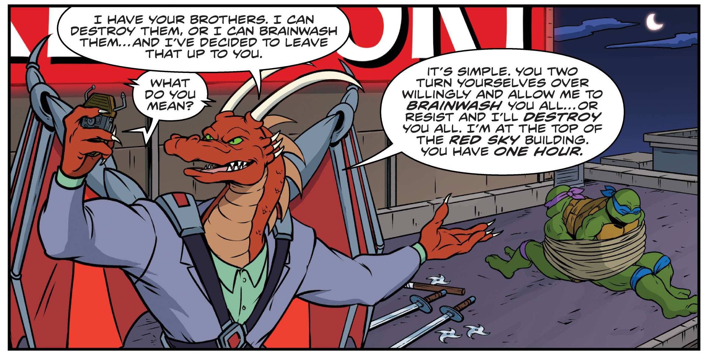 Ainsi, Drako saisit sa chance et partit pour le centre-ville arrêter les ninjas. Face à leur résistance, il décida de les séparer en deux groupes, en capturant Leonardo et Donatello. Il les conduisit au sommet d’une tour et invita les deux autres ninjas à les rejoindre. Il s’agissait d’un piège destiné à tous les capturer et pouvoir leur laver le cerveau. Mais contre toute attente, Michelangelo arriva dans une armure hi-tech et affronta Drako dans les airs. Leurs dispositifs de vols respectifs furent détruits et ils tombèrent dans l’East River. Drako parvint à prendre la fuite (SMA #27).