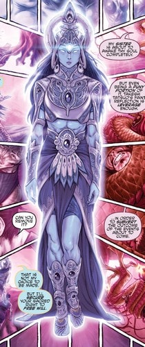 - Vishnou est ici présenté comme une divinité féminine du nom de Dreamer. Dans le panthéon indien, il s’agit plutôt d’une divinité masculine à la peau bleutée et revêtant une parure royale et quatre bras.