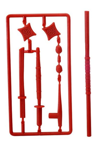 Dans son blister, la figurine possède à sa droite un bâton d’entraînement et à sa gauche, en retrait une grappe de nombreux accessoires.
