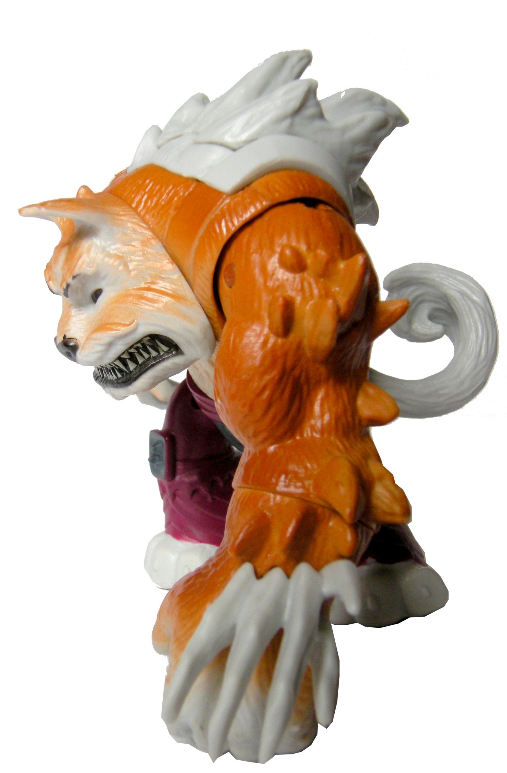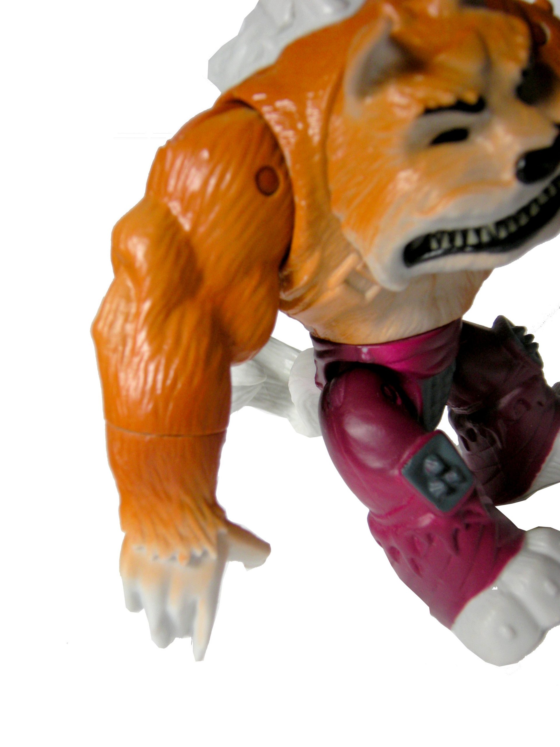 La peinture de la figurine de Dogpound semble totalement inachevée. En effet, deux couleurs dominent, le banc du plastique, et un brun orangé très clair qui semble soufflé ci et là sur le corps du chien. De très nombreux détails ne sont pas peints, ou très grossièrement. Un simple exemple, les lanières de sa ceinture, ou encore les bandelettes de ses jambes, laissées vierges. Les lanières restent en blanc, recouvertes partiellement du roux de sa fourrure. Ses bandelettes sont recouvertes de la peinture violette de son pantalon. Les doigts de ses pattes arrière sont laissés blancs. Ainsi, on ne retrouve que quatre couleurs sur sa figurine, en plus du noir pour ses yeux et le pourtour de sa bouche. Les pics dans son dos étant d’une plaque de pastique blanc rapportée, font penser à un amas unicolore qui pourraient presque avoir une fonction particulière sur le jouet. En réalité le dos étant peint en roux, il fallait bien trouver un système peu couteux pour laisser ces pics blancs. Son pantalon est mauve, dont seuls les genouillères et le pagne ressortent avec une peinture grise foncée.