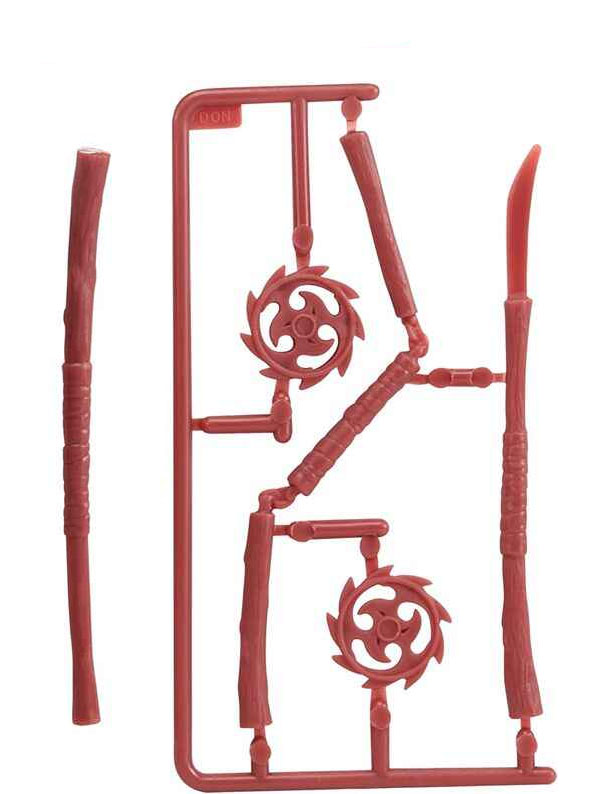 Les autres accessoires sont présentés dans une grappe. Ce n’est pas sans rappeler ce que proposait déjà Playmates Toys en 1988 pour ses premières productions. Vous devrez vous munir d’une pince coupante pour extraire chaque accessoire. Ces grappes sont toutes différentes d’une tortue à l’autre. Pour Donatello, nous retrouvons la naginata, sculptée sur la base du bâton auquel une lame a été rajoutée à l’une des extrémités. Sont également présents un sansetsukon (nunchaku à trois branches, jamais vu dans la série) et deux shurikens au design inédit.