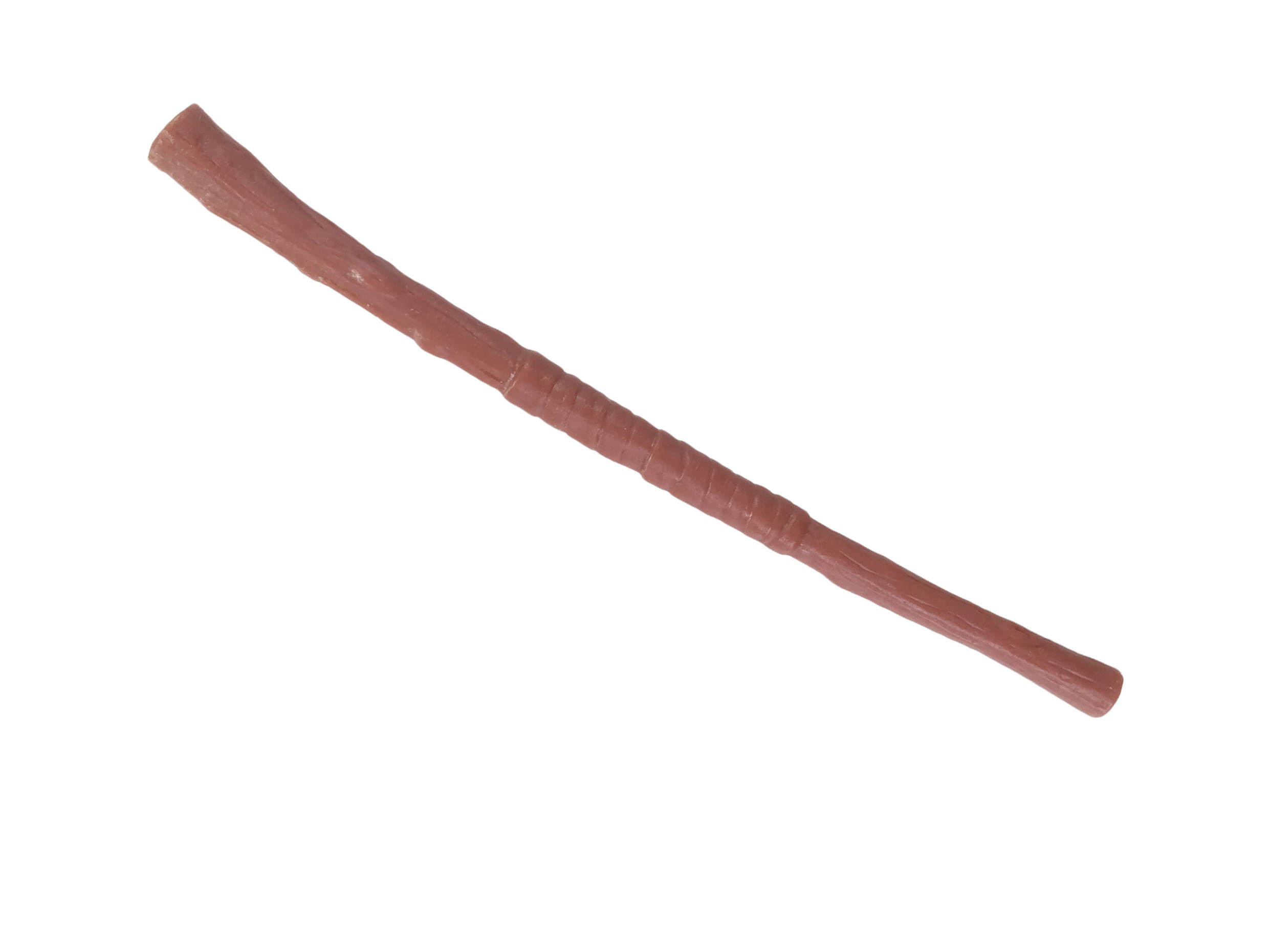 Le bâton est réalisé dans un plastique rigide brun orangé comme les autres accessoires. Celui-ci peut se glisser dans le fourreau de la ceinture pour être rangé. Pour la première fois, l’arme de Donatello n’est pas une simple tige plus ou moins travaillée. Le bâton est difforme, ce qui donne une impression d’authenticité, avec des nœuds dans le bois et deux extrémités de diamètres différents. Les bandelettes, qui ne sont pas peintes sur la version classique sortie en magasin, sont en relief. Hélas, l’arme est relativement courte par rapport à la figurine. Elle aurait bien mérité un ou deux centimètres de plus !