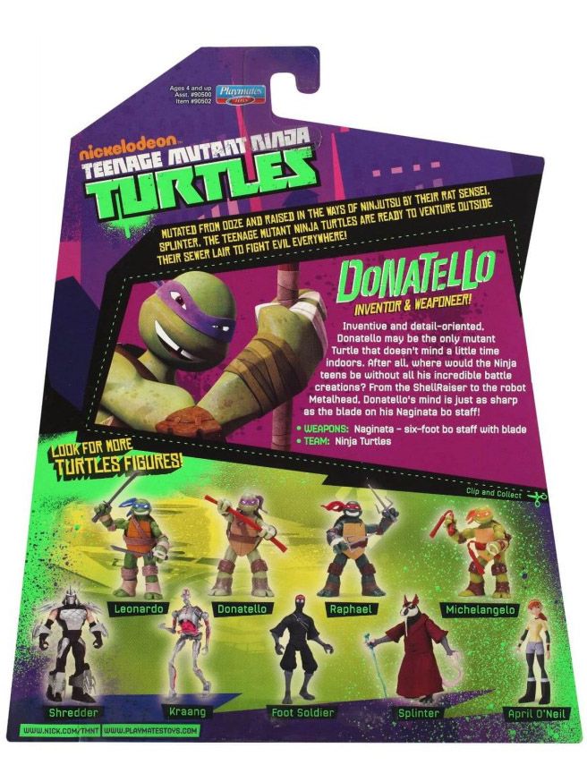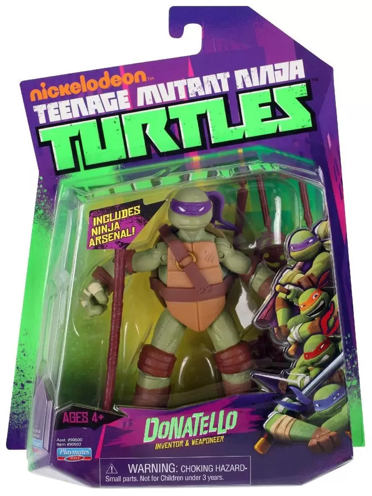 La première édition de Donatello est sortie en septembre 2012 aux États-Unis. Le blister est de forme originale, pas tout à fait rectangulaire. De couleur violette comme le ton général de la série sur ses premières années, la bulle en plastique possède à l’avant un sticker collé qui rappelle que la figurine possède de nombreux accessoires. Du côté arrière, nous retrouvons les neuf figurines de la première wave annoncées.