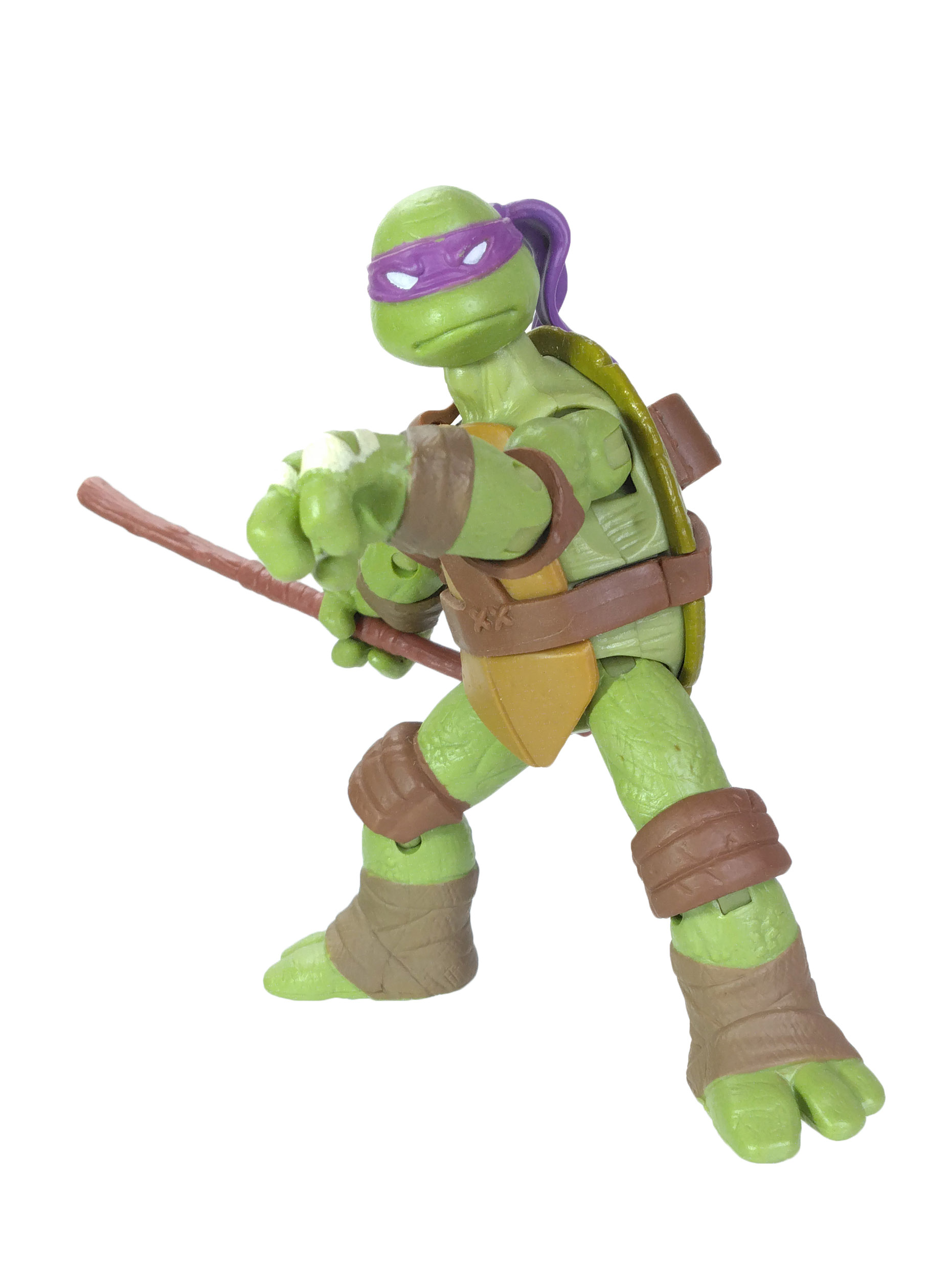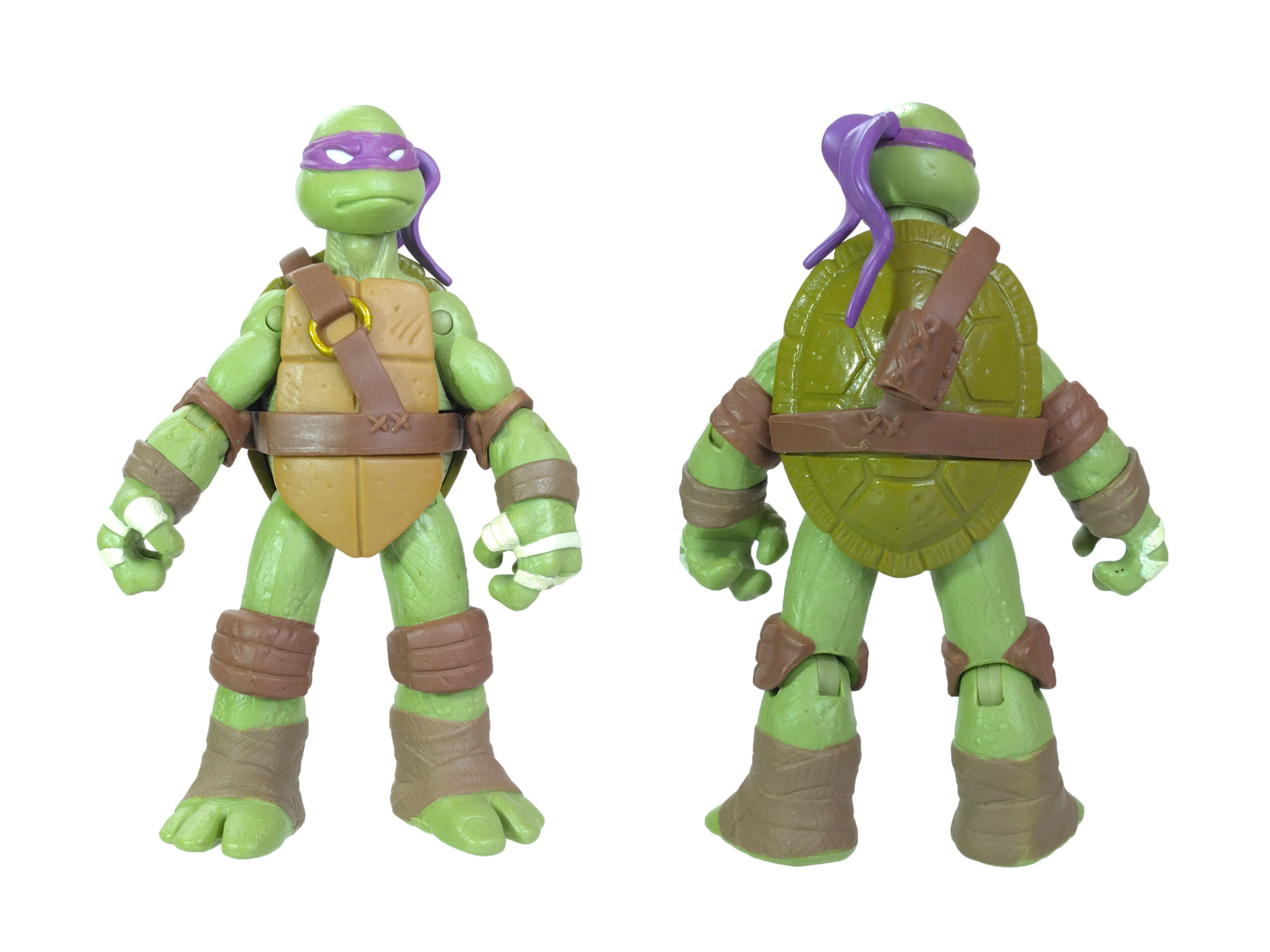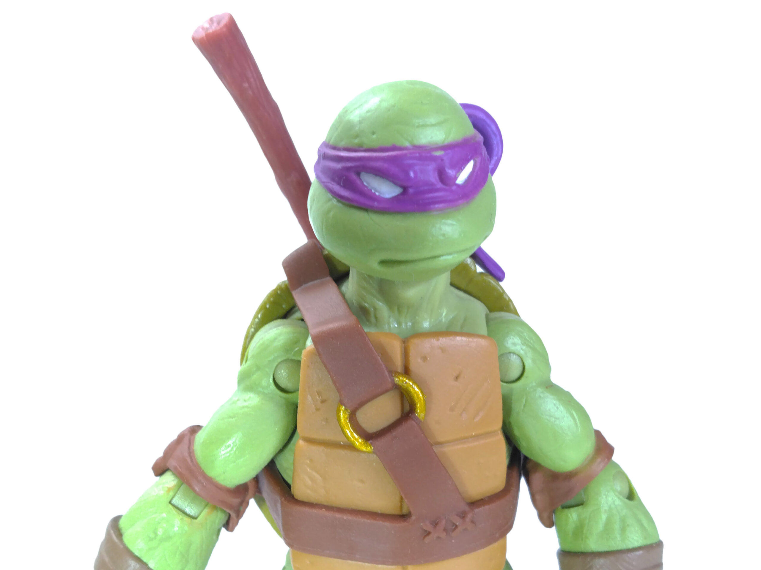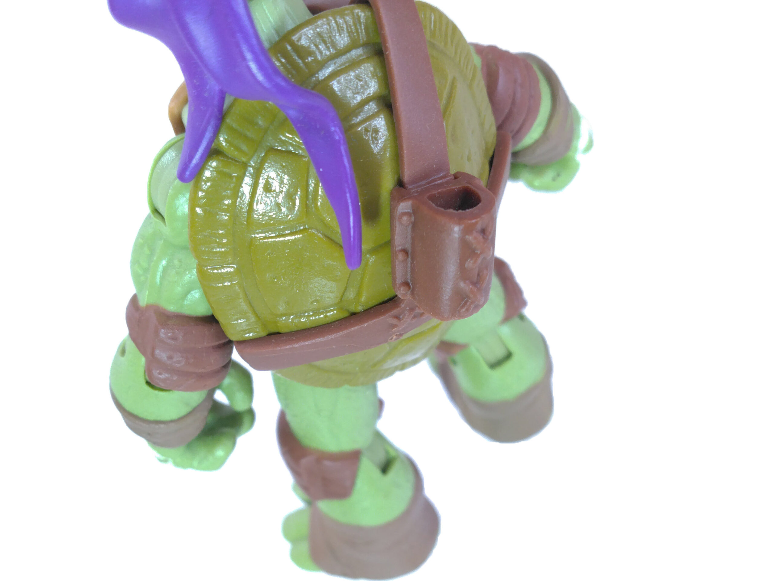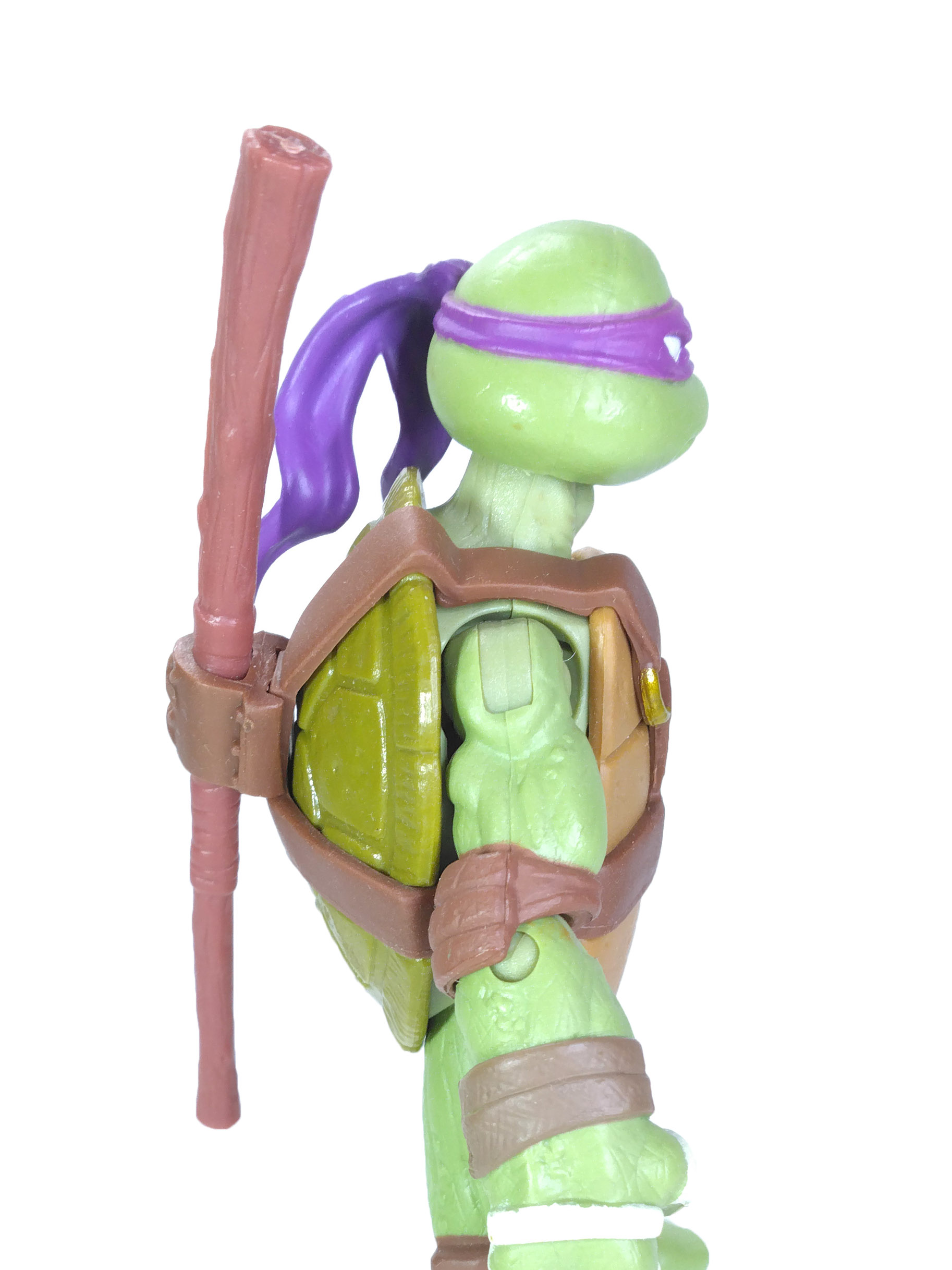 Comme toujours, les quatre tortues possèdent un vert différent. Pour cette gamme, le vert de Donatello est le plus terne. Son bandeau est violet (avec assez souvent des bavures), du blanc pour les yeux, d’un blanc cassé pour les dents et les bandelettes des mains, du brun pour les coudières et les genouillères et un brun plus foncé pour les bandelettes des bras et des pieds. Notez au passage que les couleurs des bandelettes varient en fonction de la tortue.