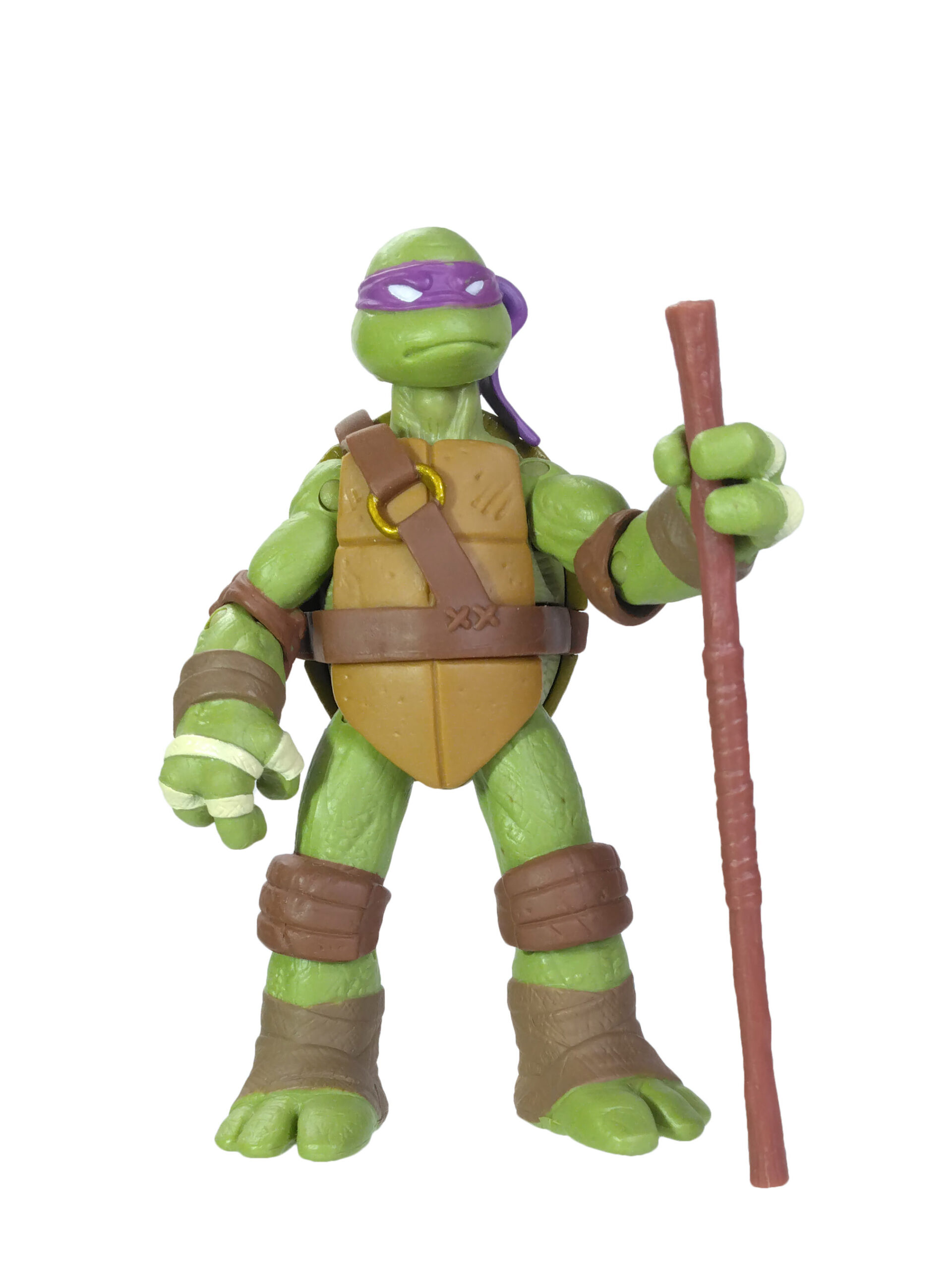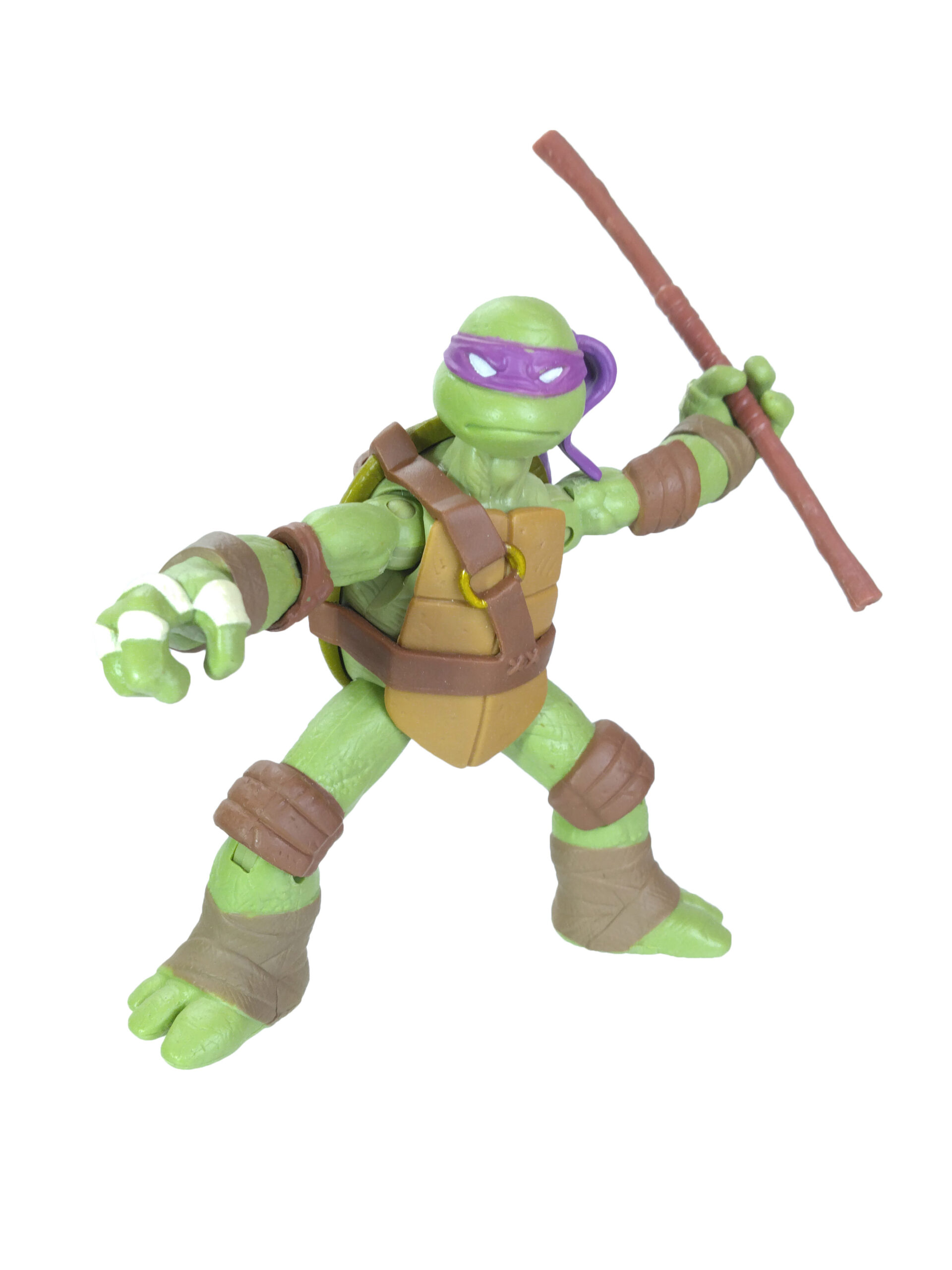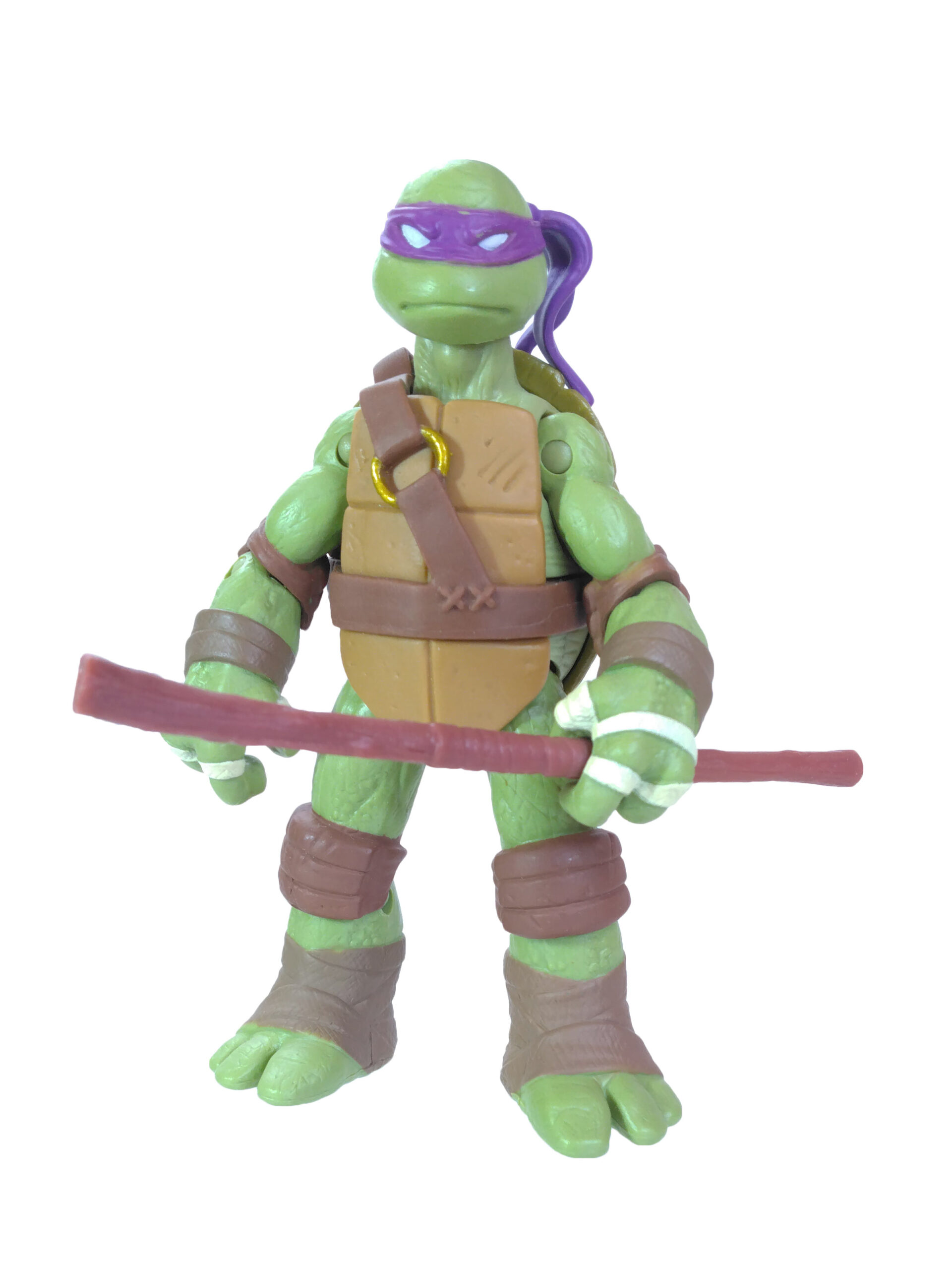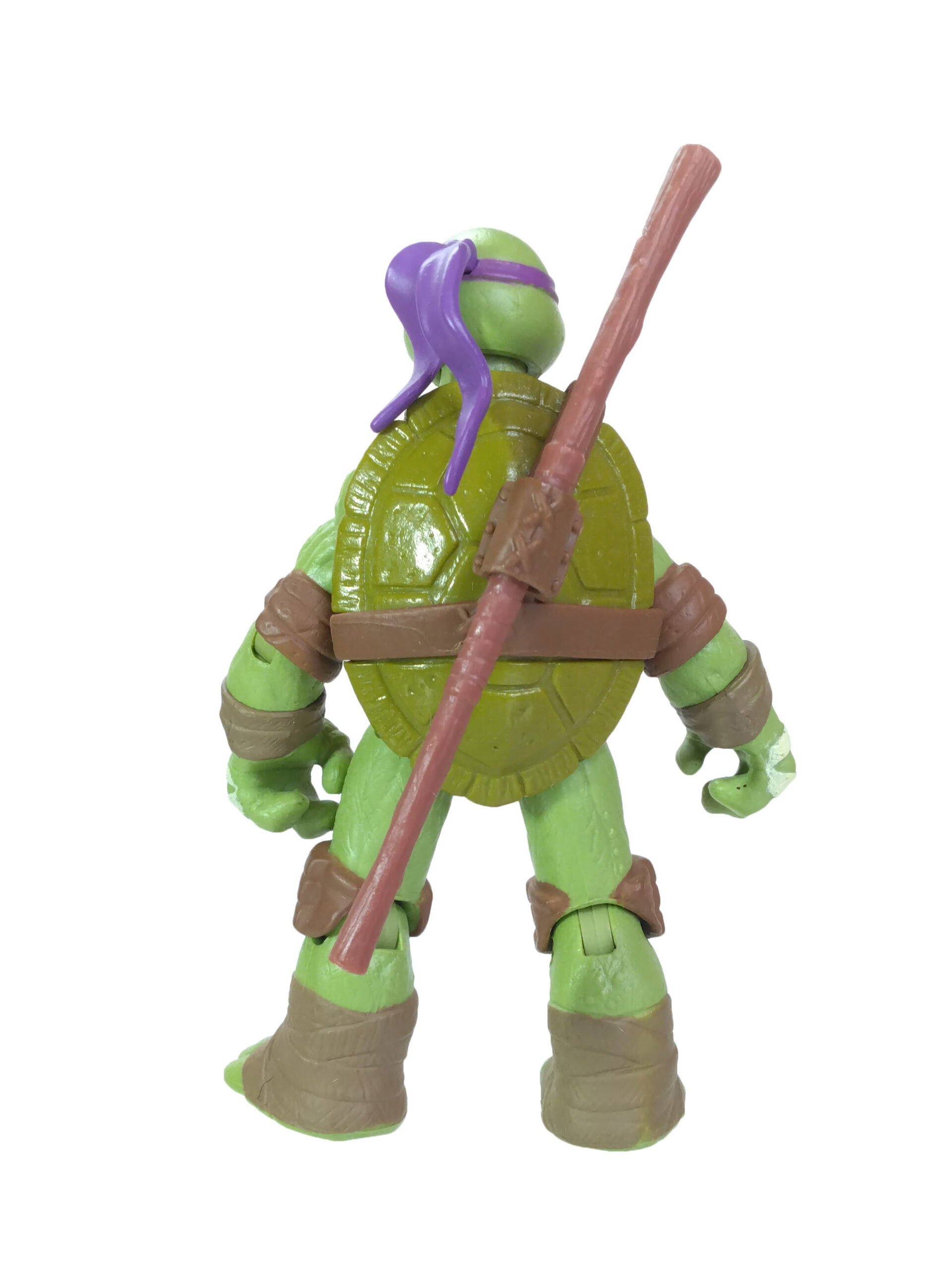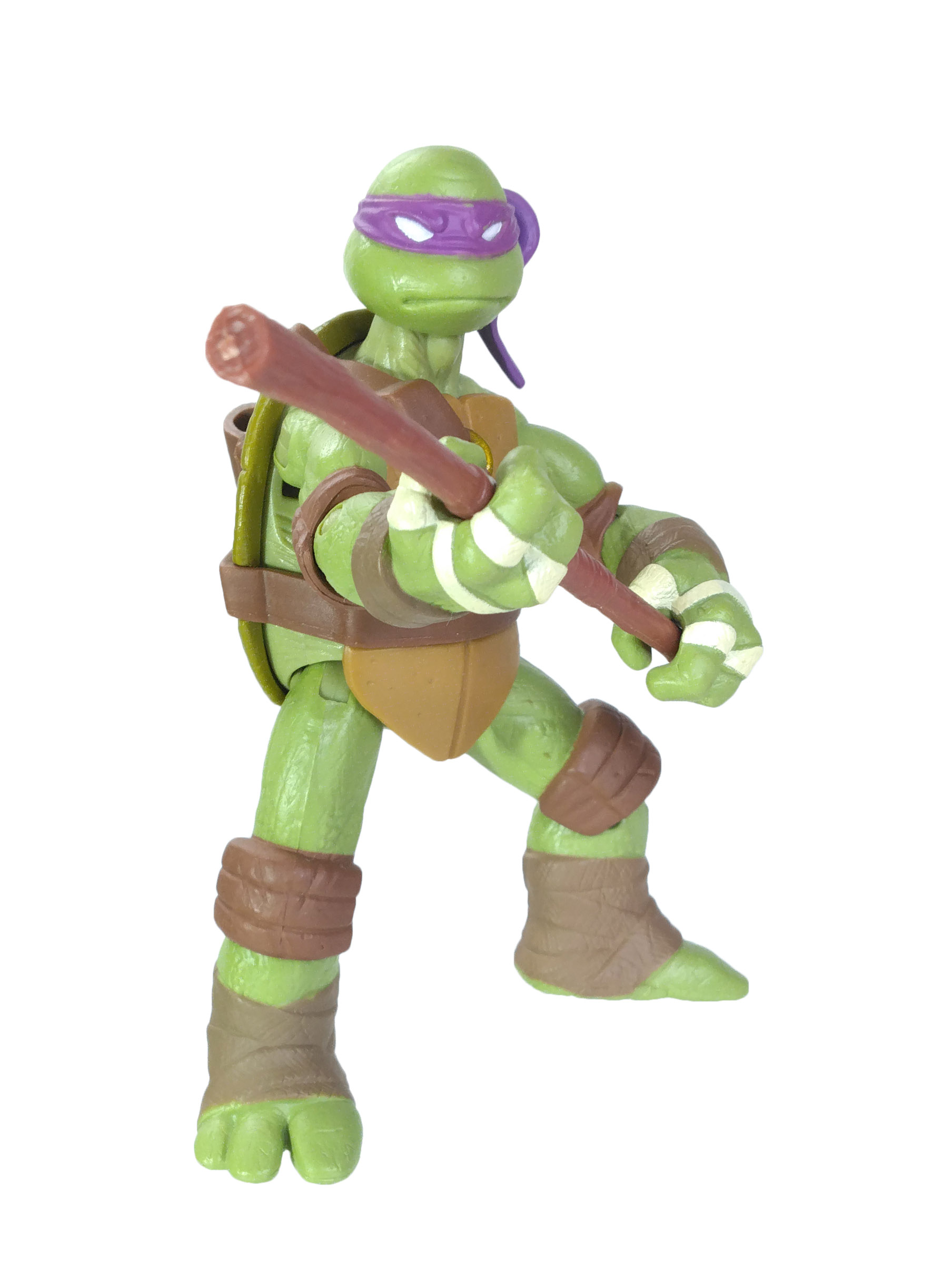 Comme toujours, les quatre tortues possèdent un vert différent. Pour cette gamme, le vert de Donatello est le plus terne. Son bandeau est violet (avec assez souvent des bavures), du blanc pour les yeux, d’un blanc cassé pour les dents et les bandelettes des mains, du brun pour les coudières et les genouillères et un brun plus foncé pour les bandelettes des bras et des pieds. Notez au passage que les couleurs des bandelettes varient en fonction de la tortue.