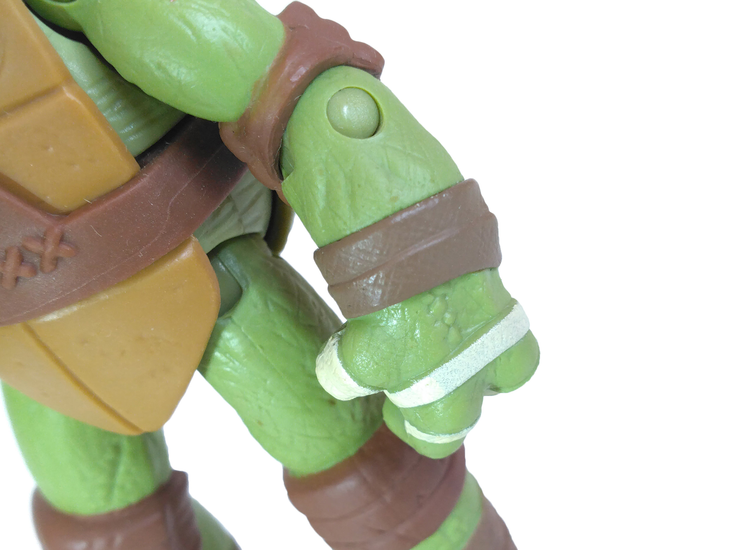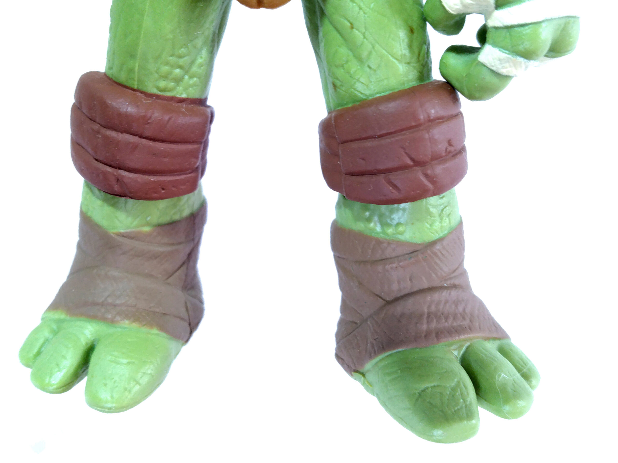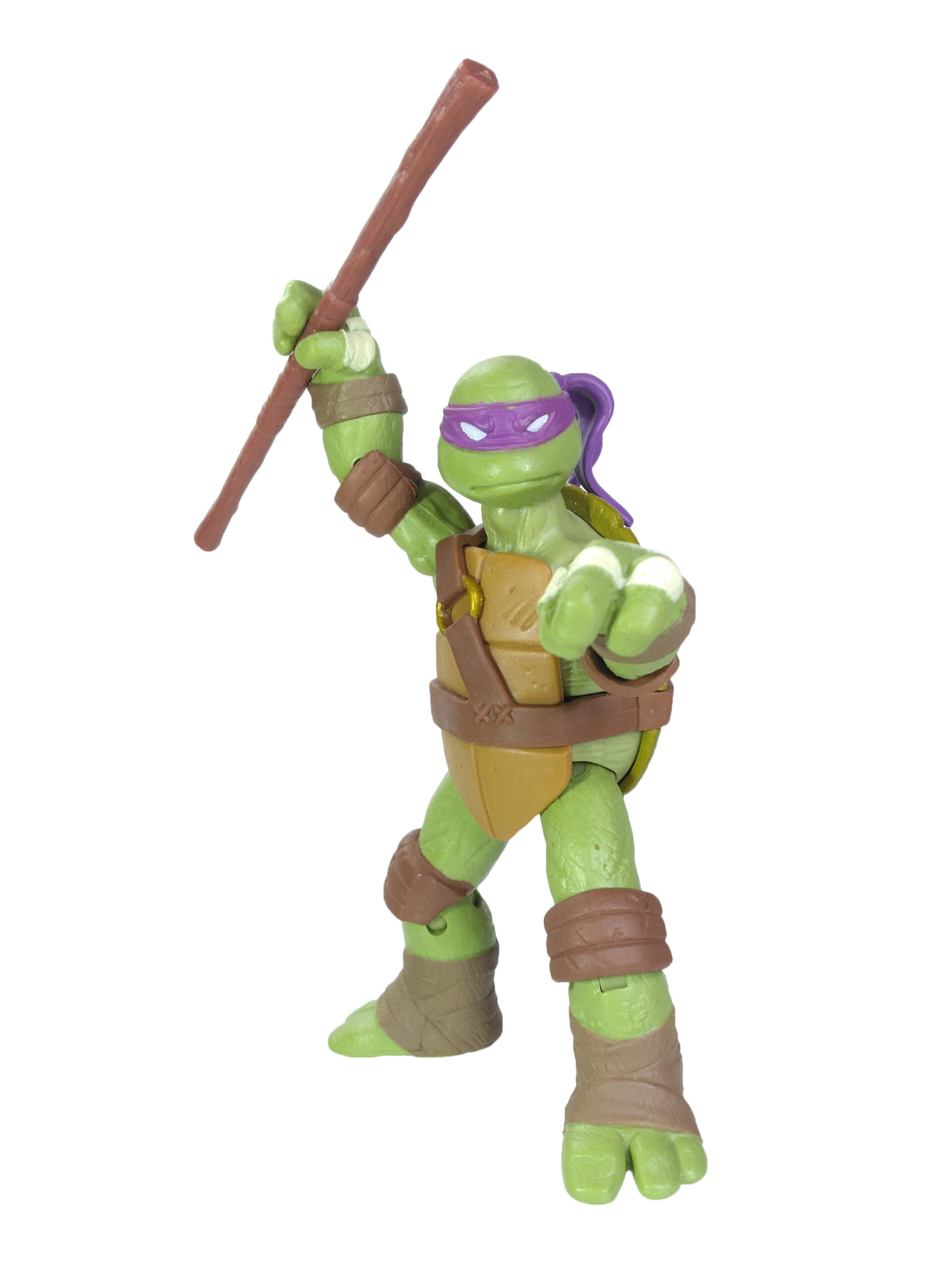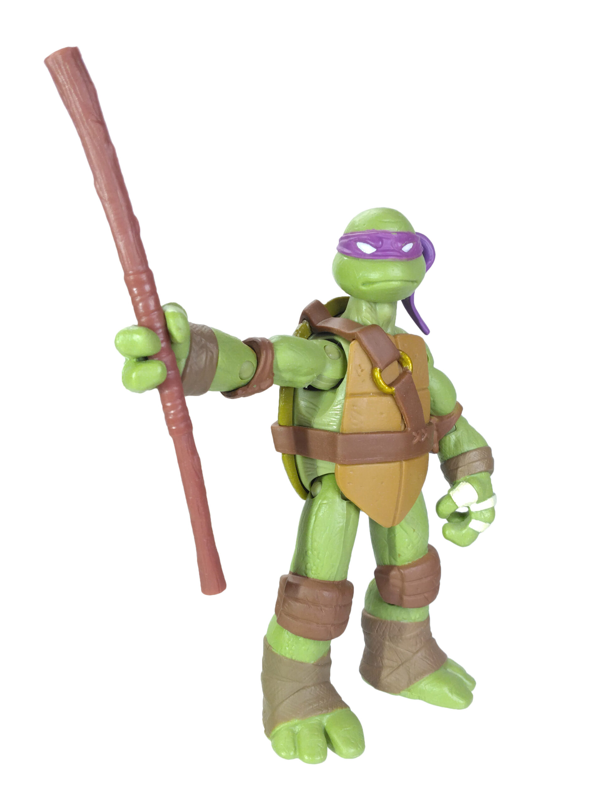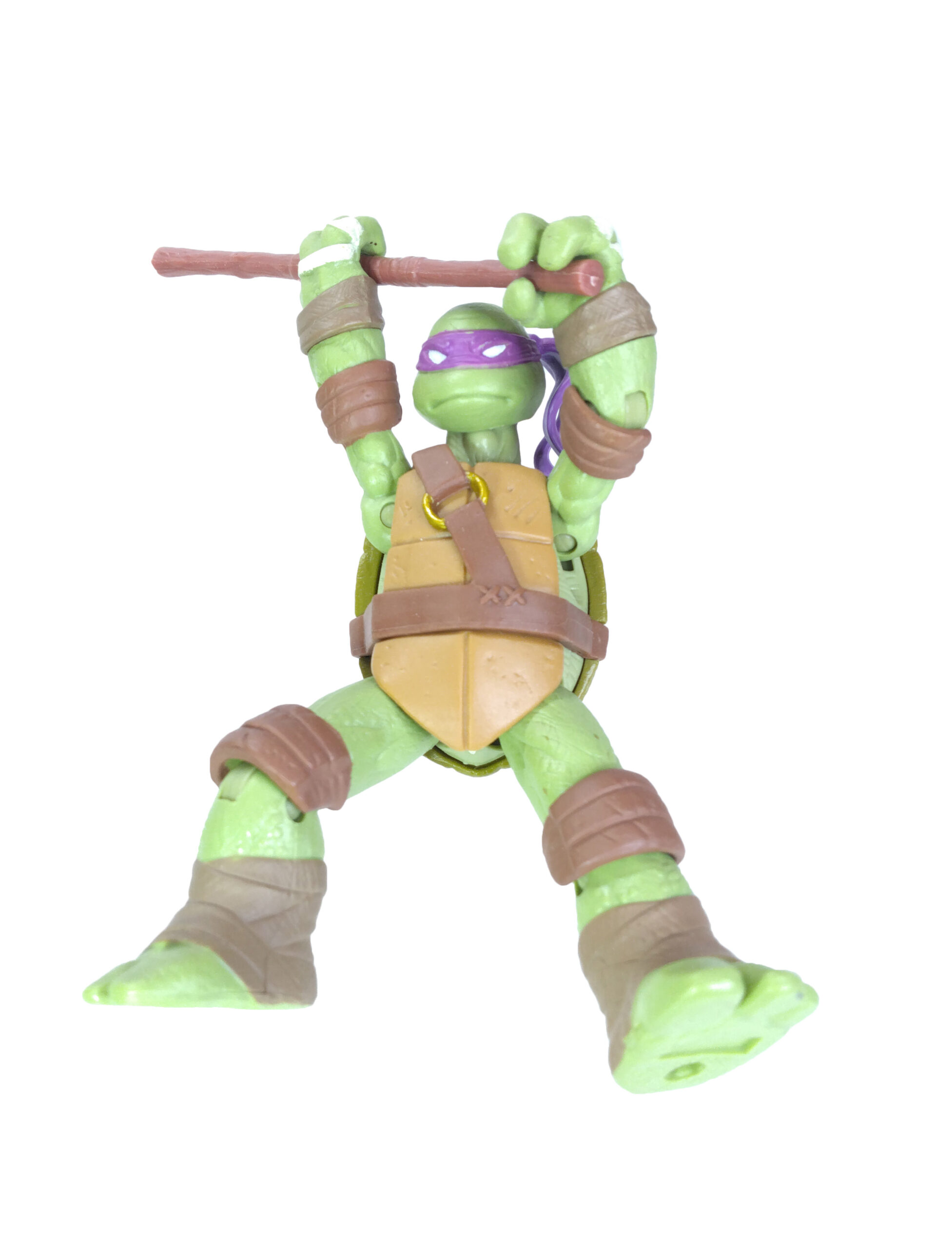 Comme toujours, les quatre tortues possèdent un vert différent. Pour cette gamme, le vert de Donatello est le plus terne. Son bandeau est violet (avec assez souvent des bavures), du blanc pour les yeux, d’un blanc cassé pour les dents et les bandelettes des mains, du brun pour les coudières et les genouillères et un brun plus foncé pour les bandelettes des bras et des pieds. Notez au passage que les couleurs des bandelettes varient en fonction de la tortue.