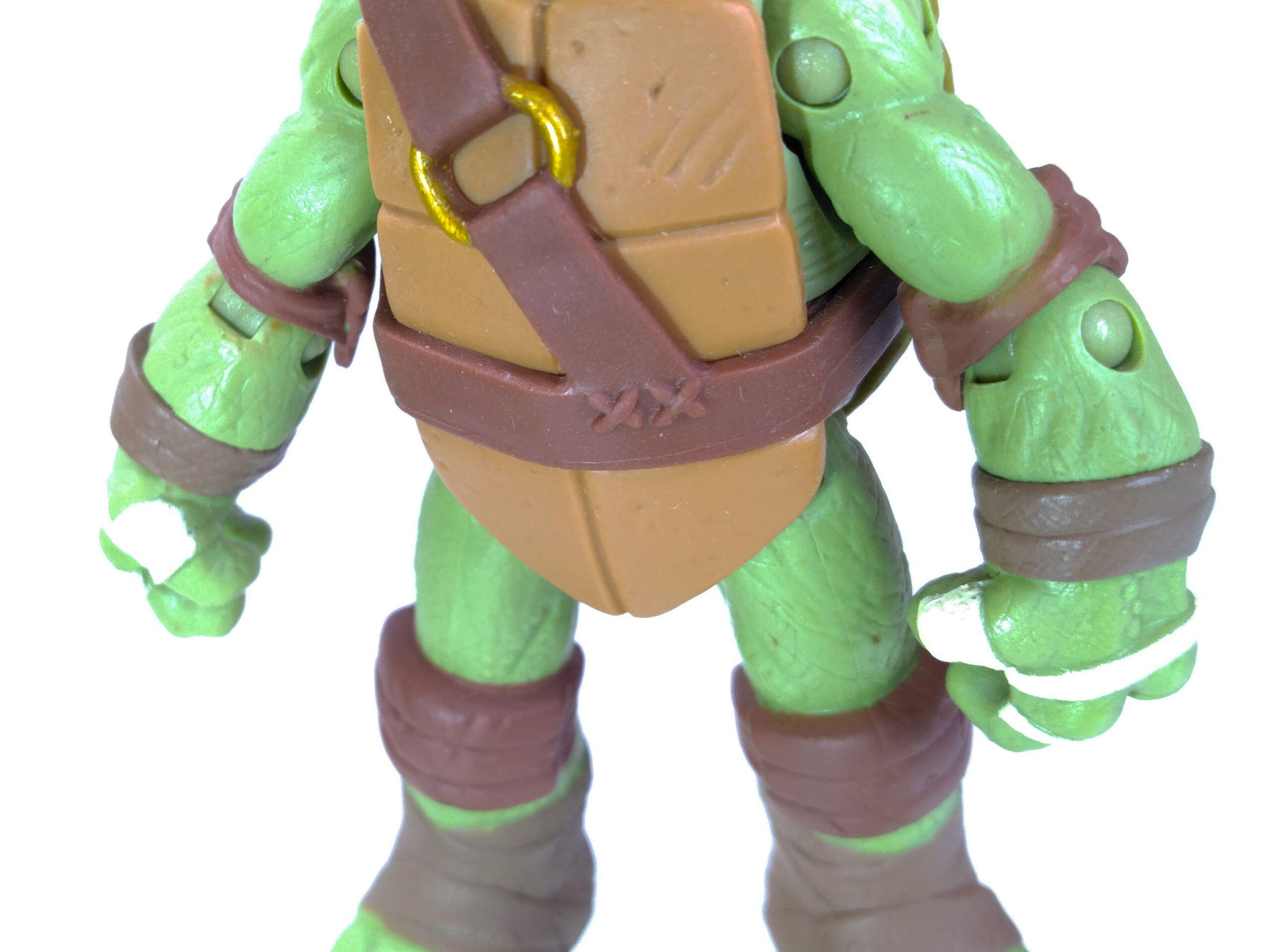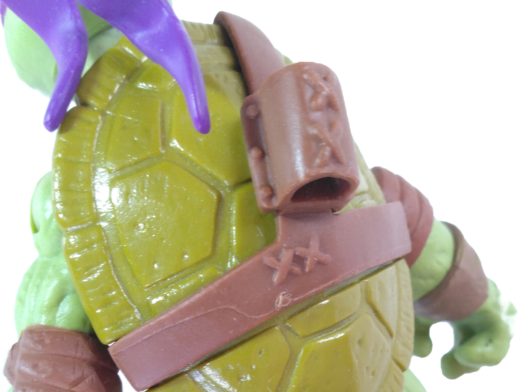 Notre personnage possède un mélange de plastique rigide, pour l’ensemble du corps, et de plastiques souples, au niveau du plastron, qui est une pièce rapportée, ainsi que la ceinture et le bandeau. La ceinture de Donatello est, comme Leonardo, composée d’une ceinture principale et d’une lanière transversale pour tenir son bâton. C’est sur cette dernière que se trouve un fourreau au niveau de la carapace, pour y glisser son arme. Pas besoin de perforation sur la carapace, le fourreau est directement encré sur la ceinture.