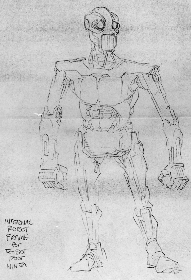 Toutefois, se posait le problème de savoir si les tortues allaient se battre avec leurs armes contre des humains, ou si une solution de « facilité » serait amenée. Des discussions ont certainement été faites entre Playmates Toys et la production du dessin animé dès le début pour répondre à ces questions. Eastman et Laird étaient très proches du fabricant à cette époque et n’hésitaient pas à les aider en proposant des designs pour des personnages, comme les futurs Bebop et Rocksteady. C’est peut-être à ce moment que des esquisses de Laird sont intervenues (Fig. 1 à 3). Sur son blog, l’artiste reconnaît volontiers ne pas se souvenir de l’occasion pour laquelle il les a faites. Mais il ne pense pas avoir jamais désiré intégrer des ninjas Foot robotiques dans les comics. Il se peut qu’il s’agisse donc de travaux préparatoires pour le dessin animé. Ou pour d’éventuelles figurines.