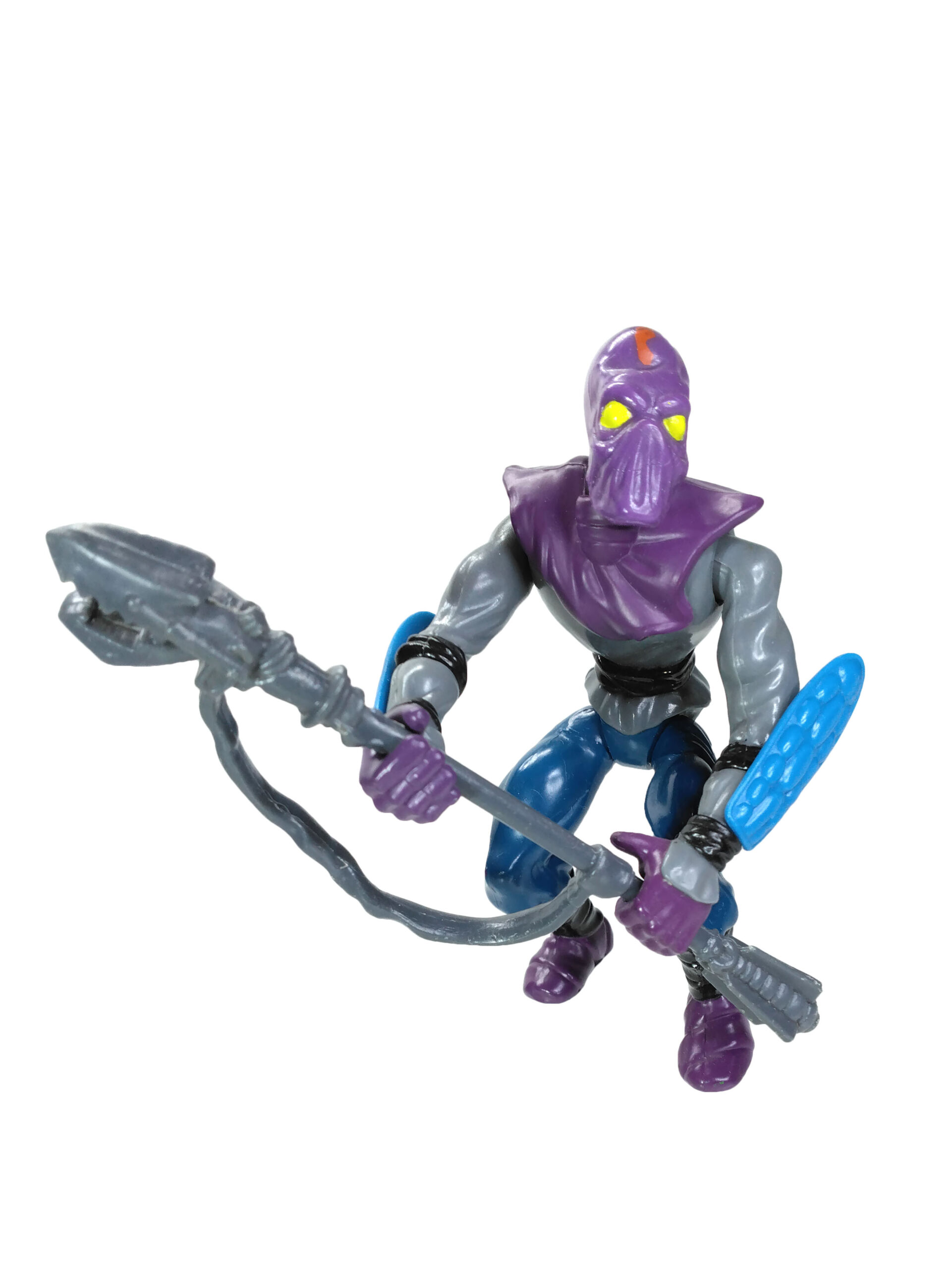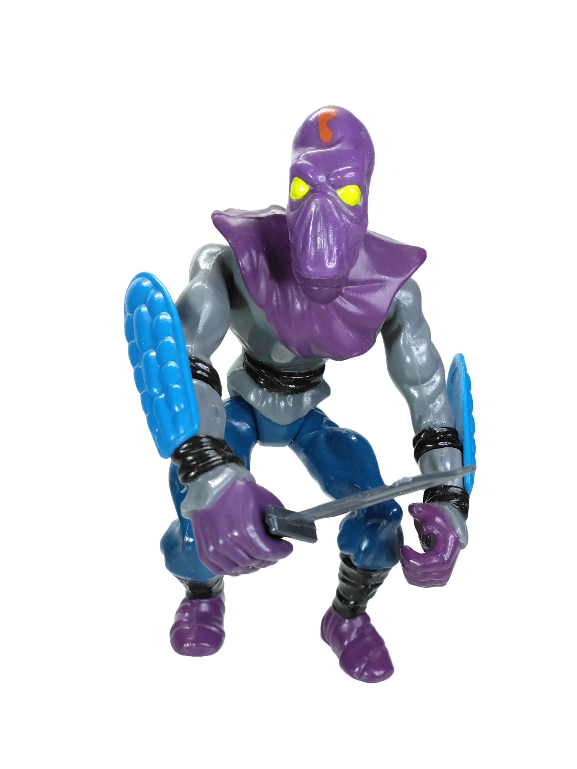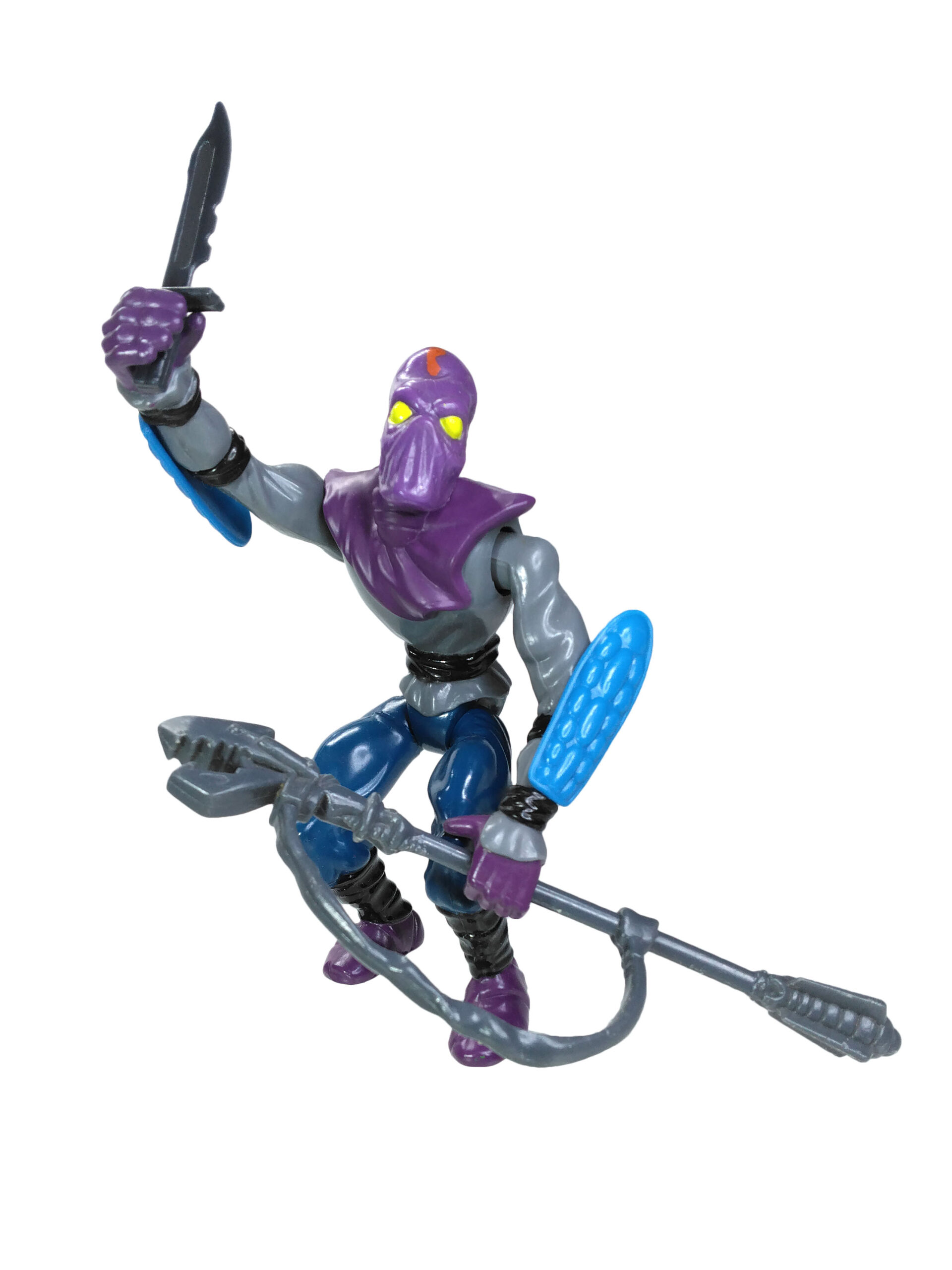 J’ai toujours eu un coup de cœur pour cette figurine. Elle est aussi différente que similaire à d’autres personnages. Son style de couleur est totalement intégré au Foot Clan, avec le gris, le noir, le bleu et surtout le violet. On le rattache ainsi aisément à Shredder, mais aussi aux nombreux accessoires et véhicules qui verront le jour par la suite.
