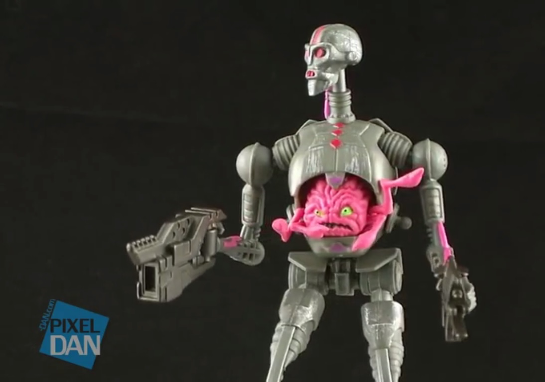 L’exosquelette du Kraang fait plus penser à un robot Terminator, qu’à un robot Utrom, comme on pouvait le voir dans la série animée de 2003 ou le comics original. Son buste comporte un emplacement pour y mettre le Kraang à l’intérieur. La tête est relativement petite et étroite, mais très détaillée. Ses bras et ses jambes sont fins et arqués. Le pied gauche est décollé du sol, ce qui empêche la bonne stabilité du jouet, comme pour le soldat Foot. L’ensemble du corps robotique est haut en détails, composé de différentes plaques de métal. Chose étrange que l’on ne voit pas dans la série : la présence de ce qu’il semble être des tentacules sur les bras et les jambes du robot. Une prise de liberté tout à fait intéressante, rajoutant quelques couleurs à cette figurine.