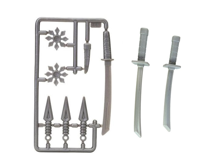 Les autres accessoires sont présentés dans une grappe. Ce n’est pas sans rappeler ce que proposait déjà Playmates Toys en 1988 pour ses premières productions. Vous devrez vous munir d’une pince coupante pour extraire chaque accessoire. Ces grappes sont toutes différentes d’une tortue à l’autre. Pour Leonardo, nous retrouvons deux shurikens, trois kunais, un couteau et un sabre supplémentaire.