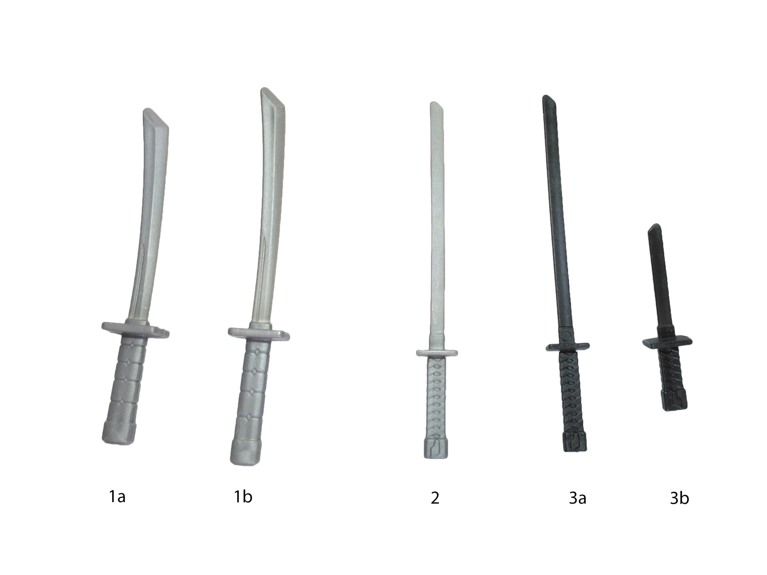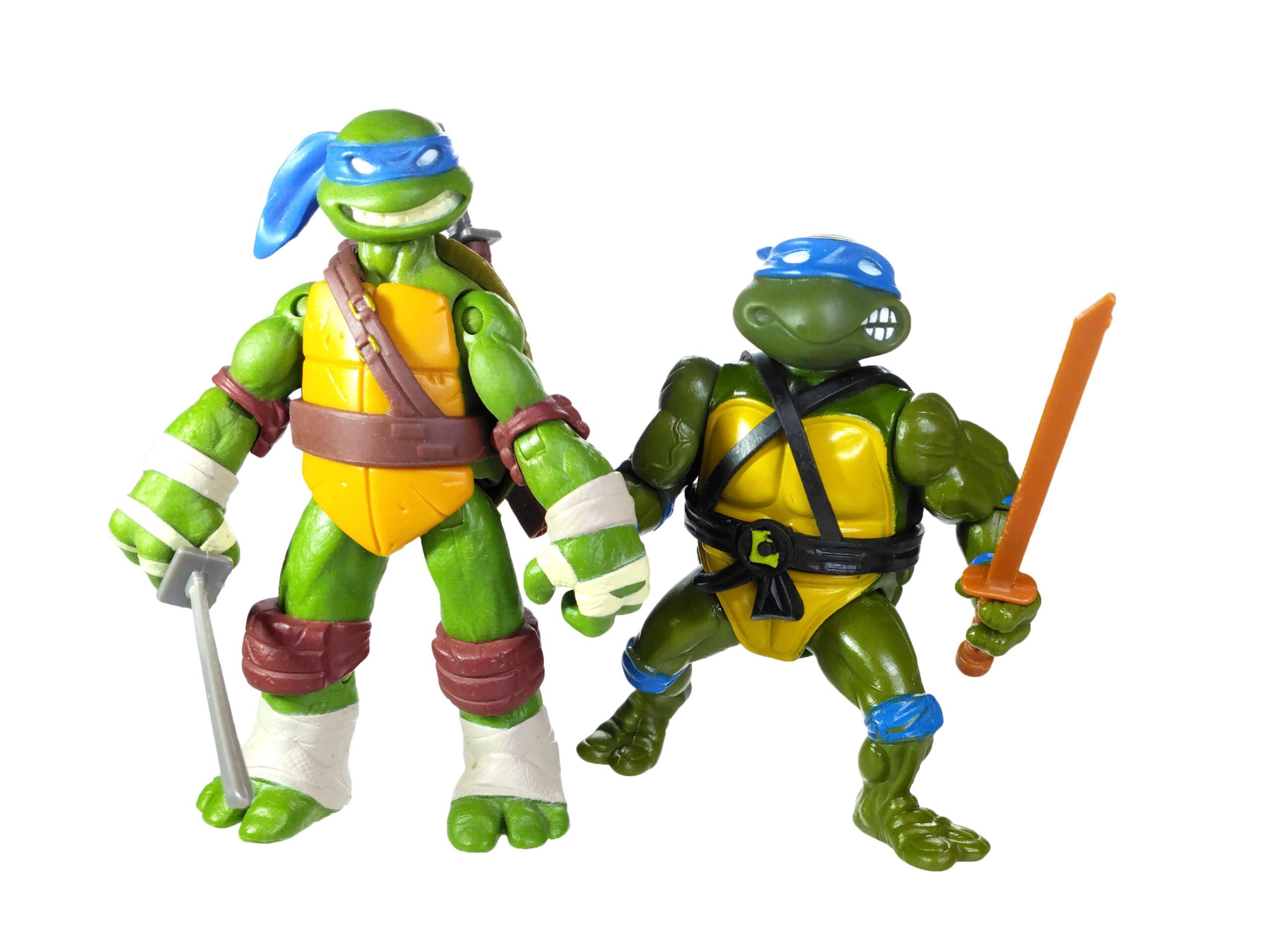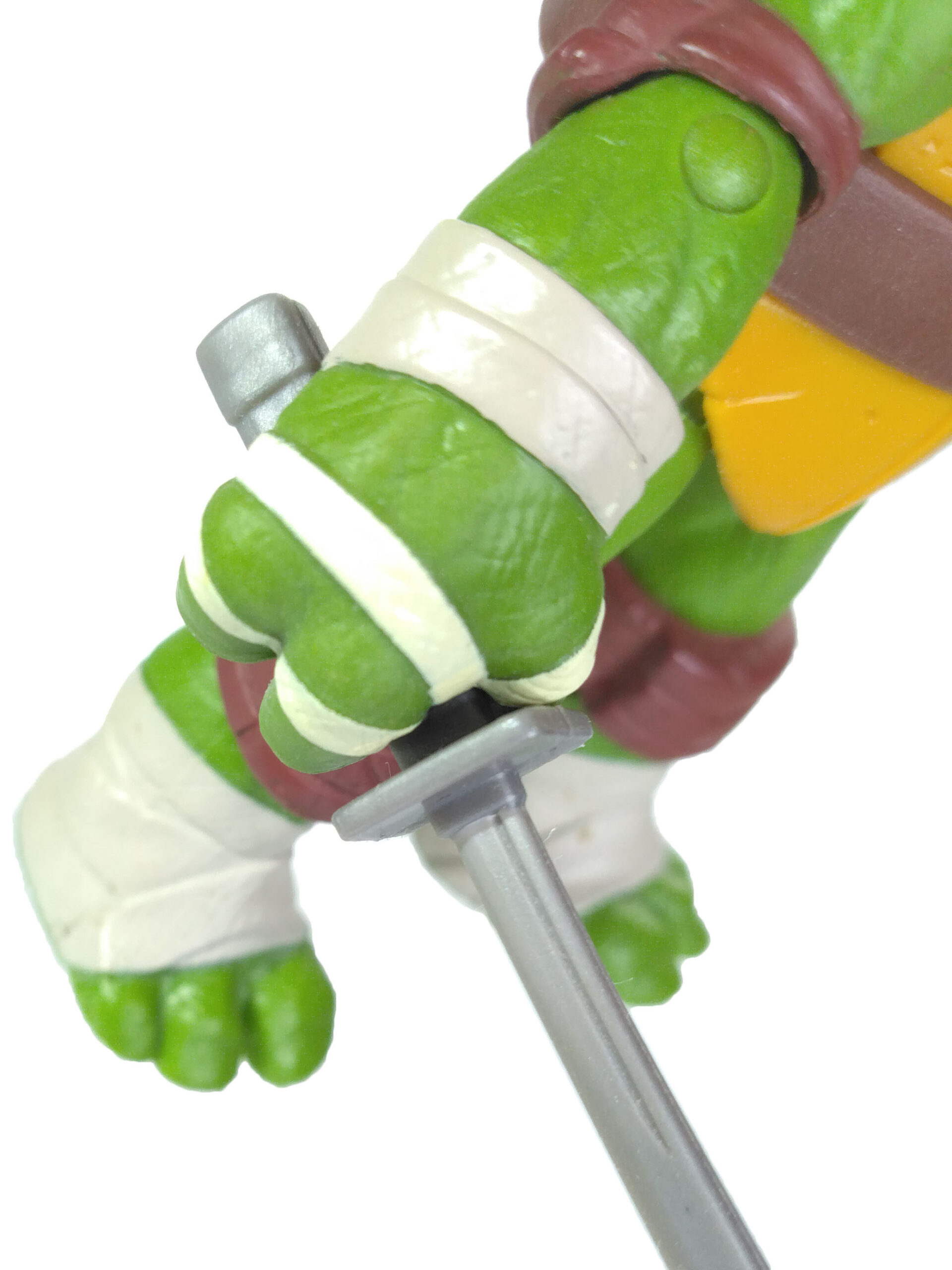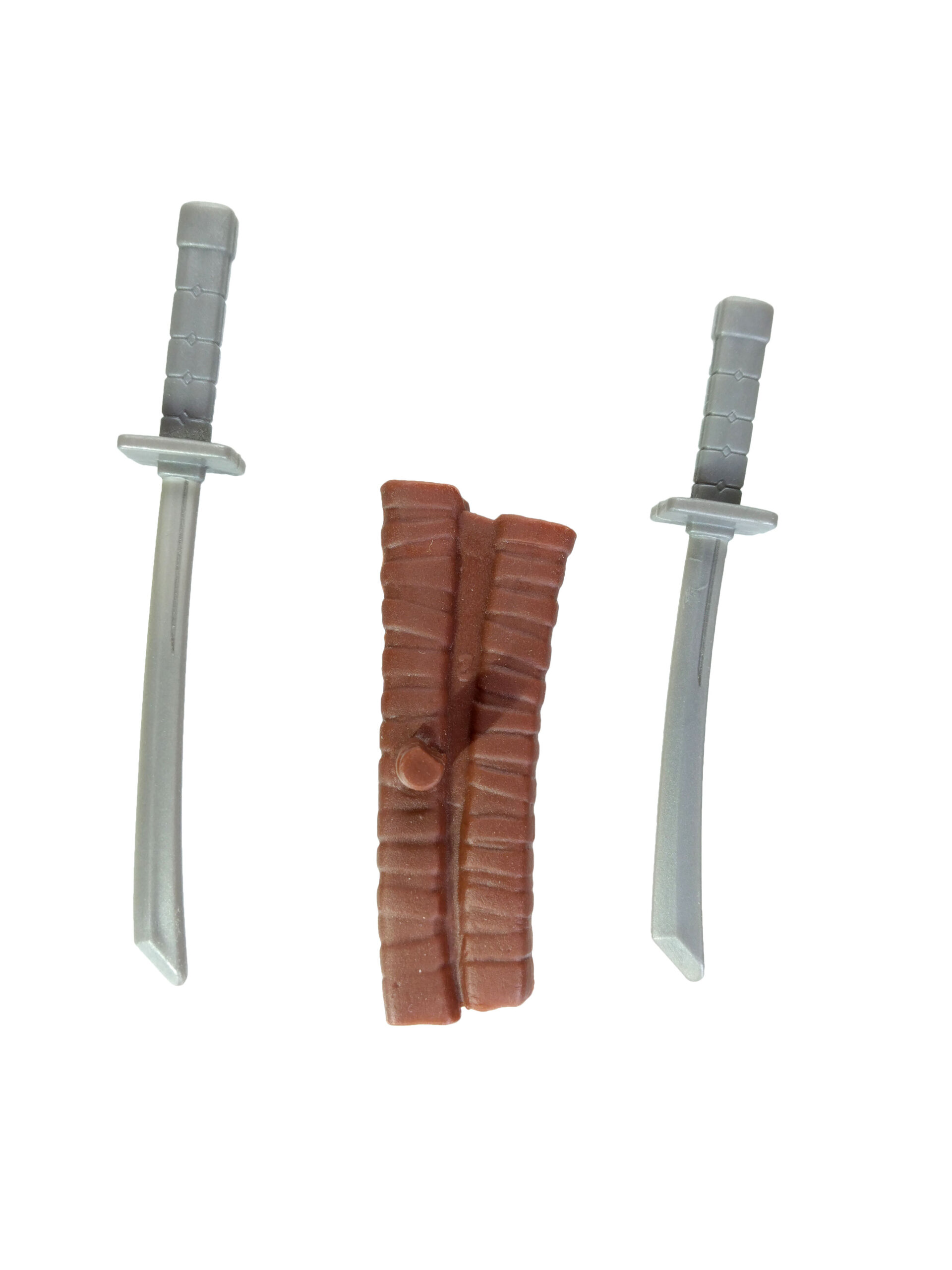 Les sabres de la tortue ne sont pas identiques. Nous en avons un plus grand que l’autre. Et c’est un détail très intéressant, puisque c’est une grande première ! Dans le dessin animé, les sabres de la tortue sont effectivement différents – bien que cela ne soit jamais abordé. L’idée était de représenter un daisho, soit le couple daito (lame longue) et shoto (petite lame). Ils sont réalisés dans un plastique rigide gris métallisé assez fin et donc fragile.