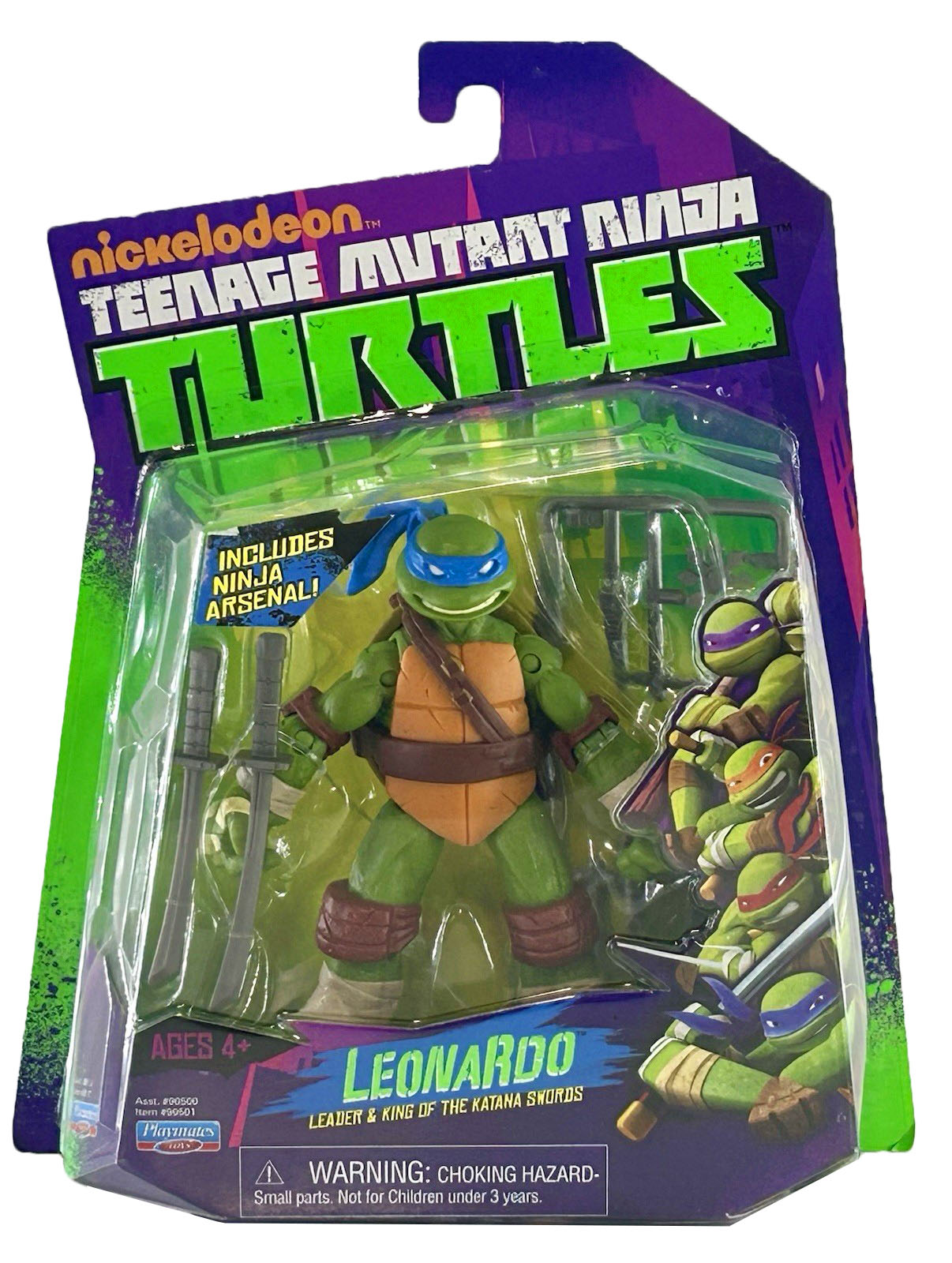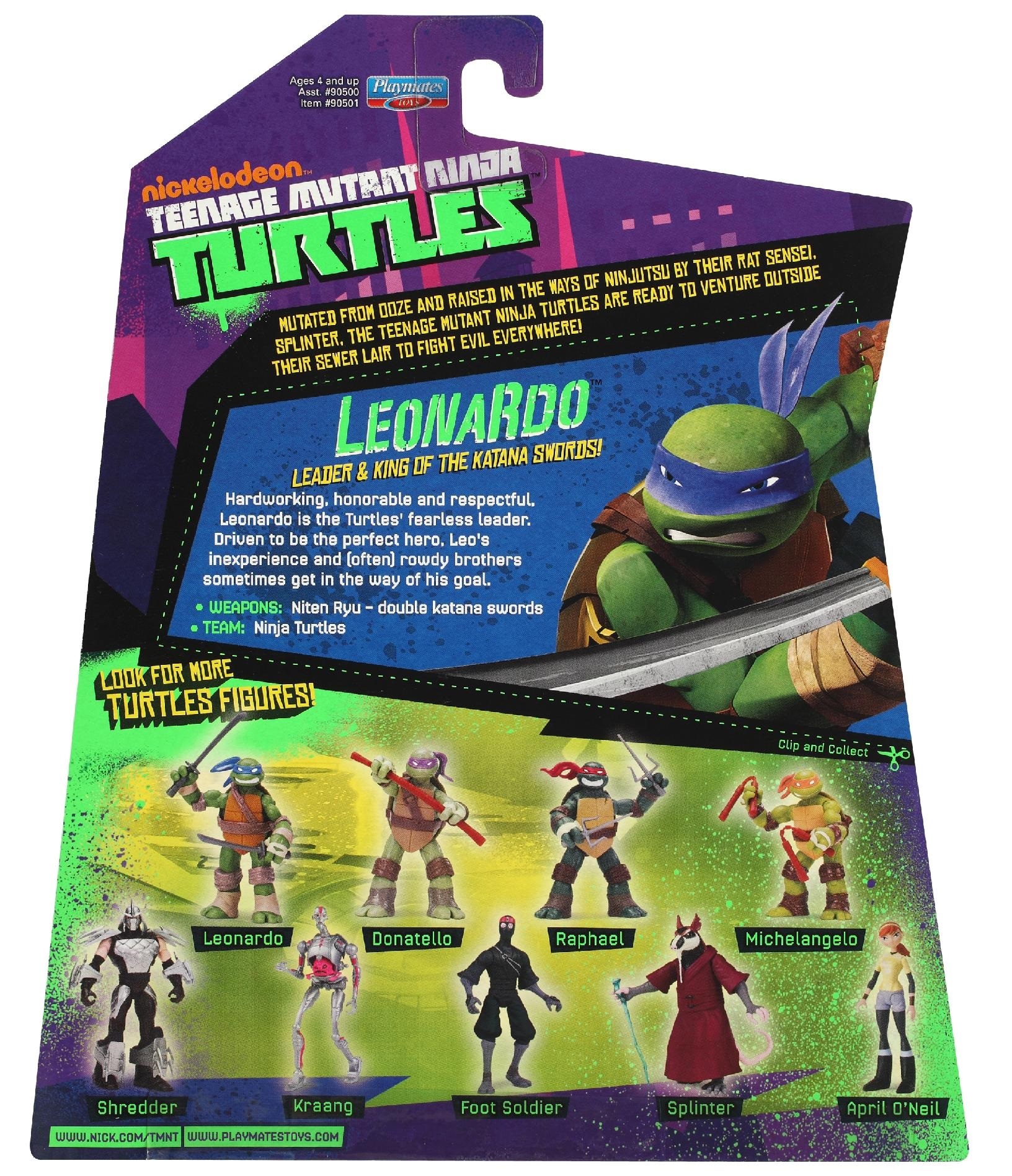 La première édition de Leonardo est sortie en septembre 2012 aux États-Unis. Le blister est de forme originale, pas tout à fait rectangulaire. De couleur violette comme le ton général de la série sur ses premières années, la bulle en plastique possède à l’avant un sticker collé qui rappelle que la figurine possède de nombreux accessoires. Du côté arrière, nous retrouvons les neuf figurines de la première wave annoncées.