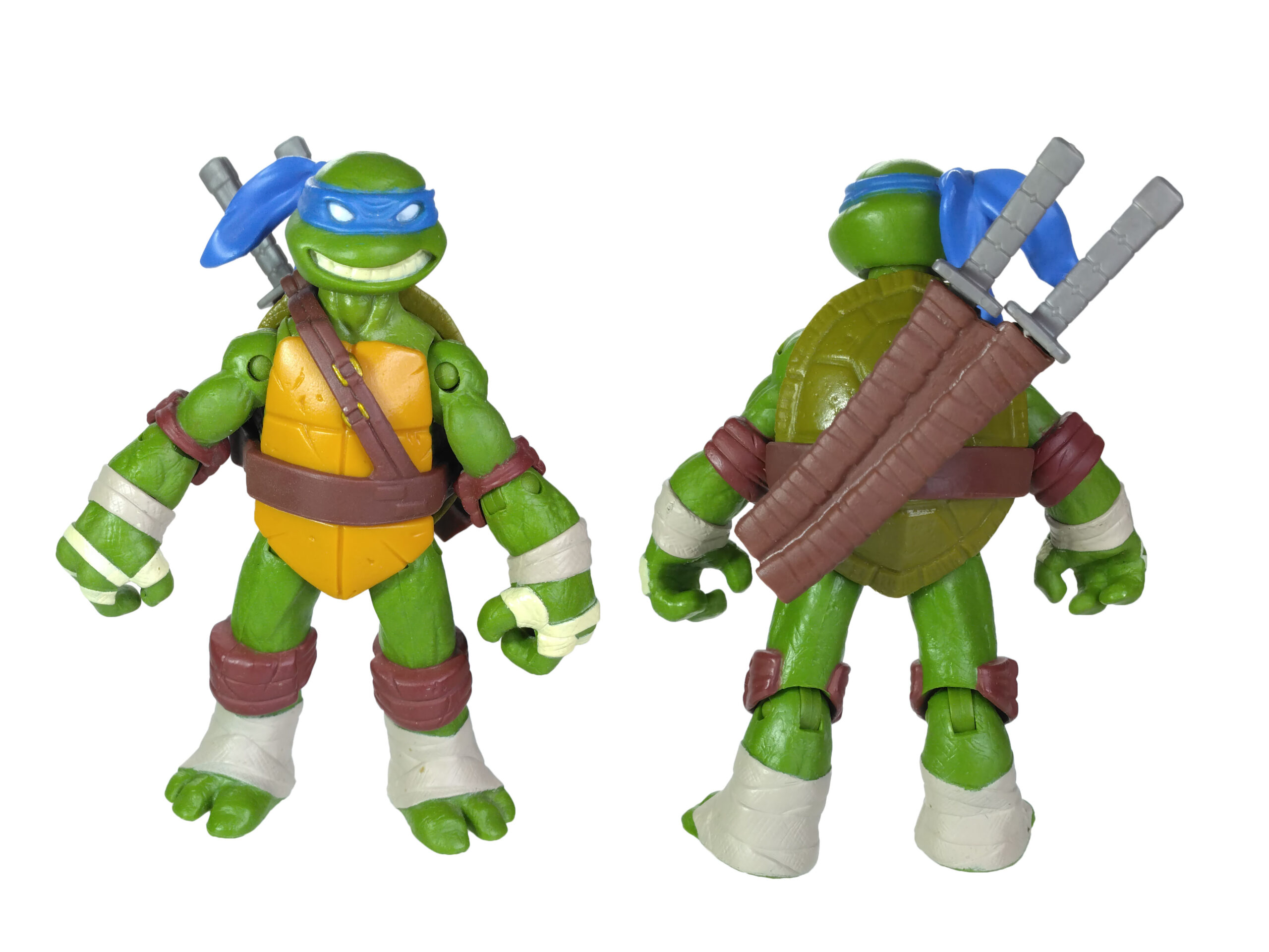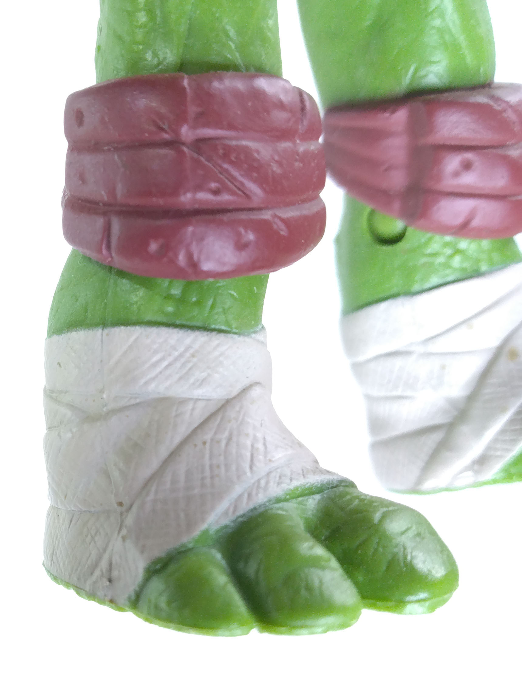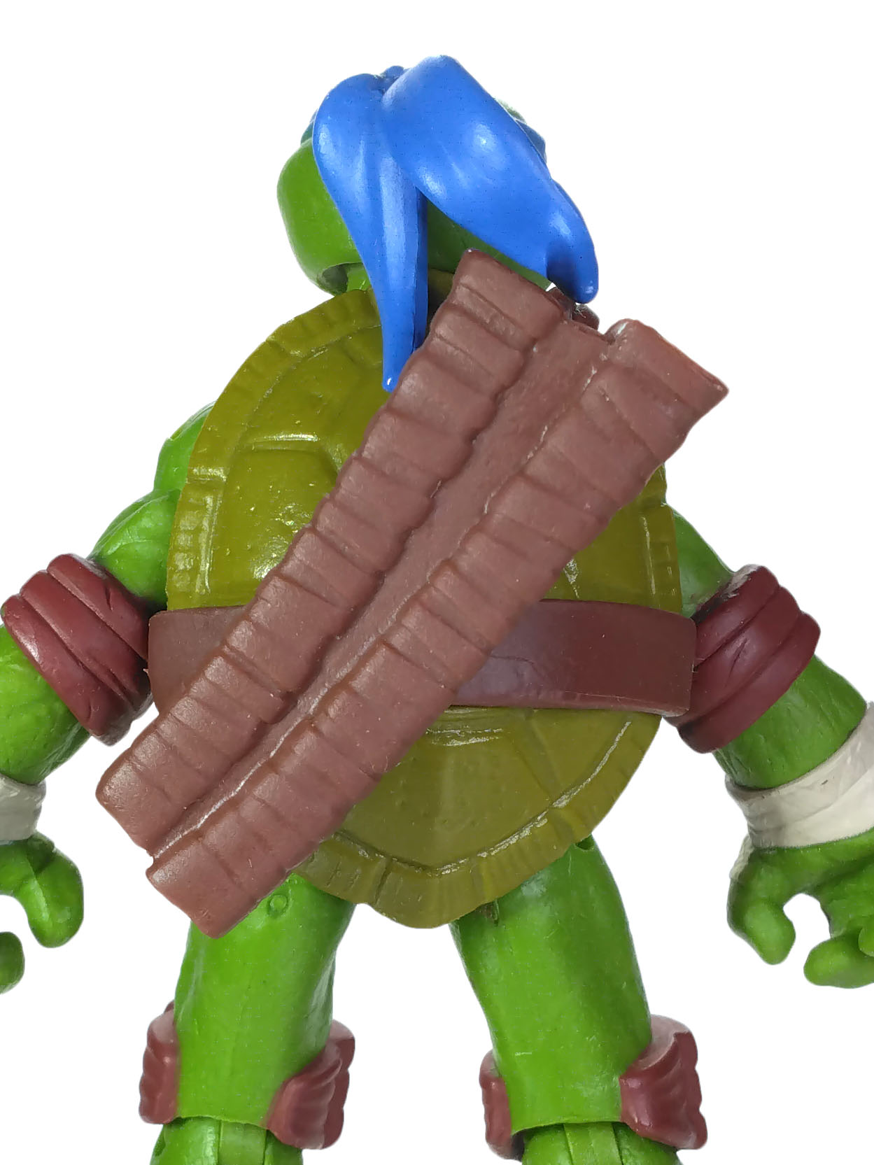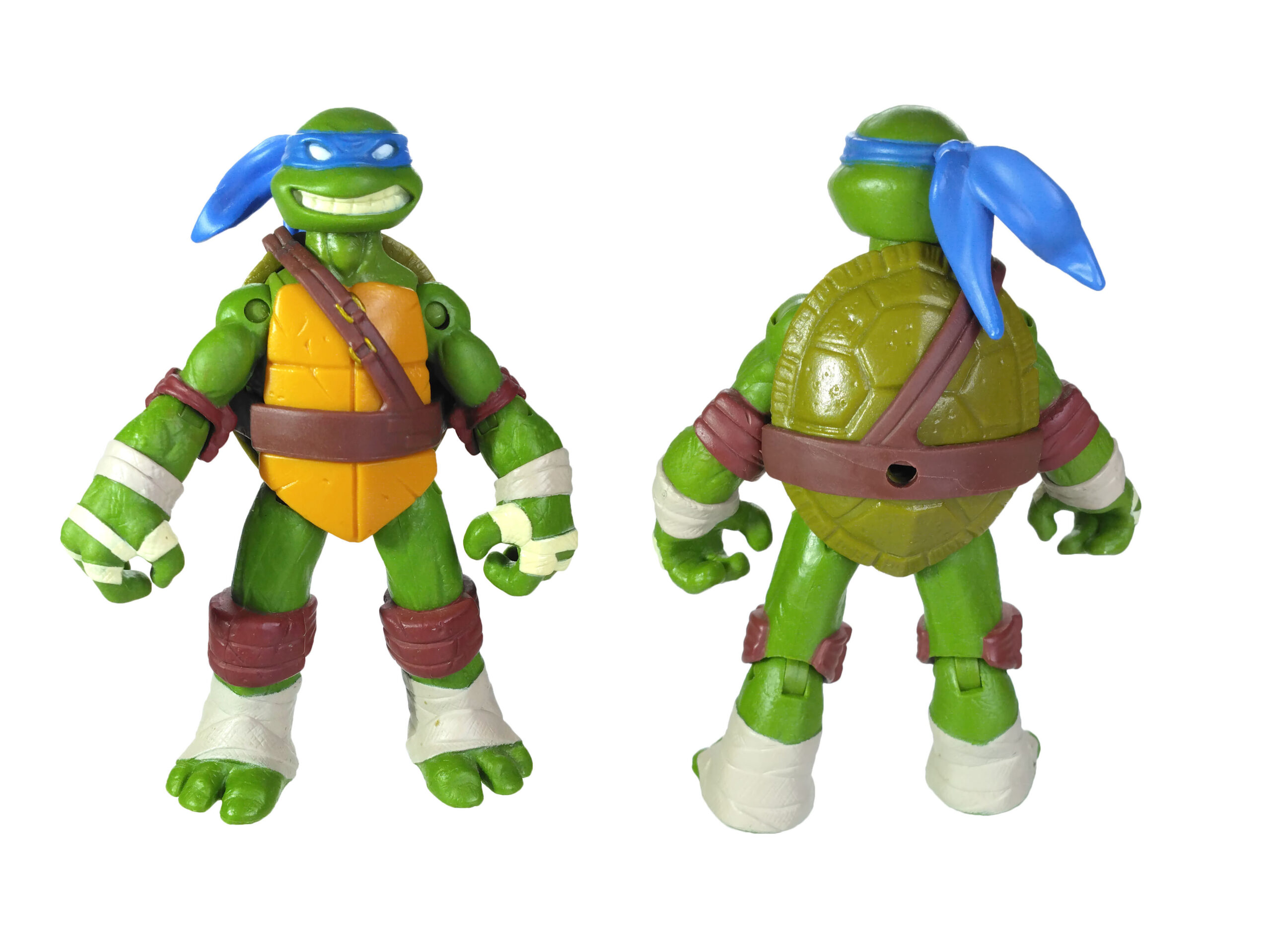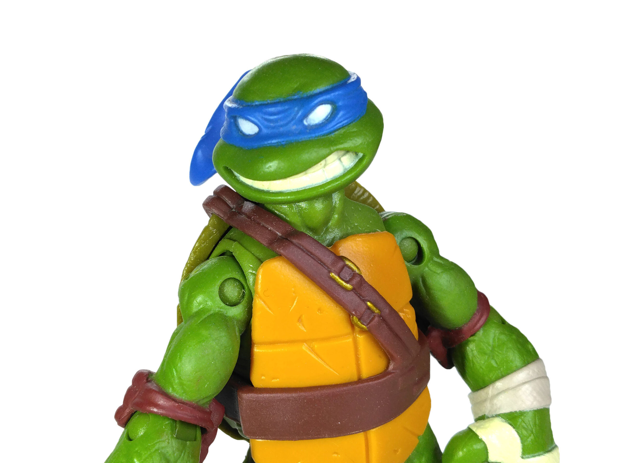 La peinture de cette figurine est relativement simpliste, mais ô combien efficace. Le plastique de la figurine est moulé dans une teinte verte sur laquelle sont rajoutées les autres peintures. Il est question du bleu pour le bandeau (avec assez souvent des bavures), du blanc pour les yeux, d’un blanc cassé pour les dents et les bandelettes, du brun pour les coudières et les genouillères. Notez au passage que les couleurs des bandelettes varient en fonction de la tortue. Leonardo est le seul à n’en posséder que des blanches.