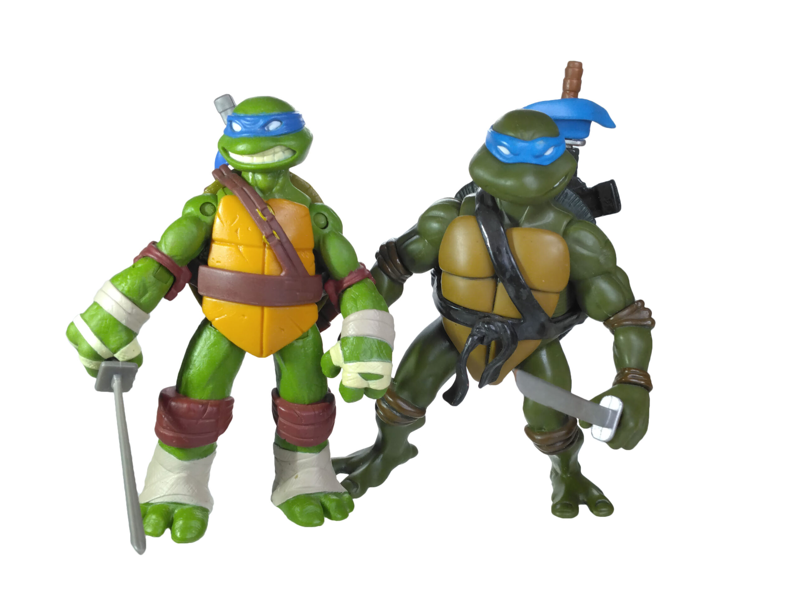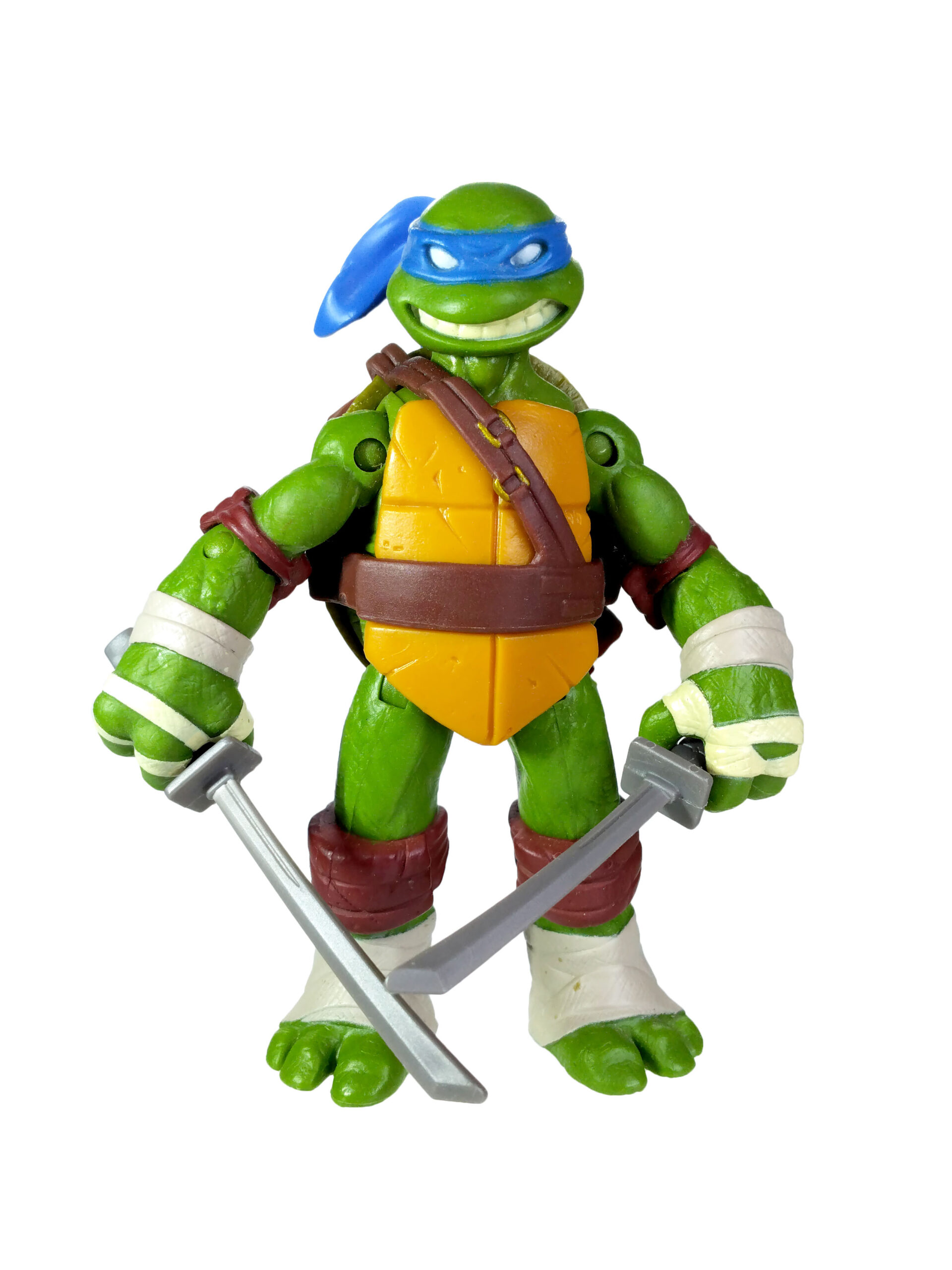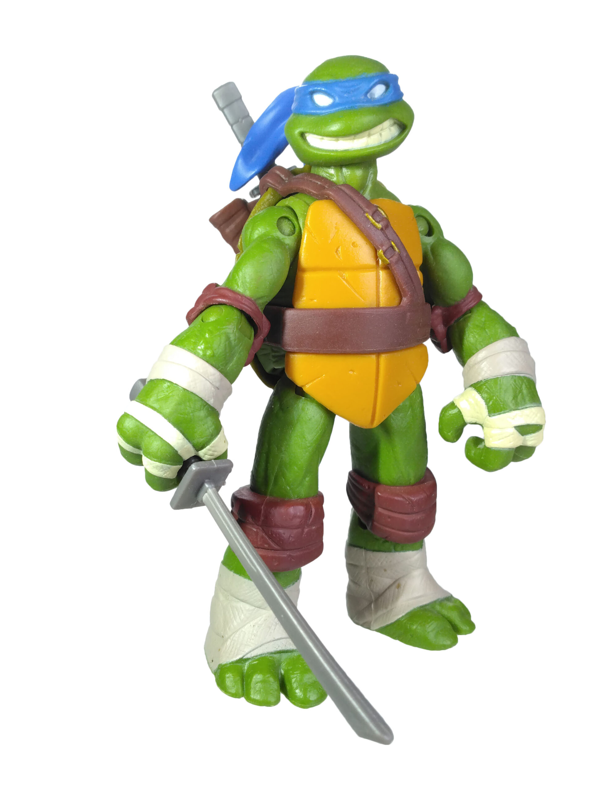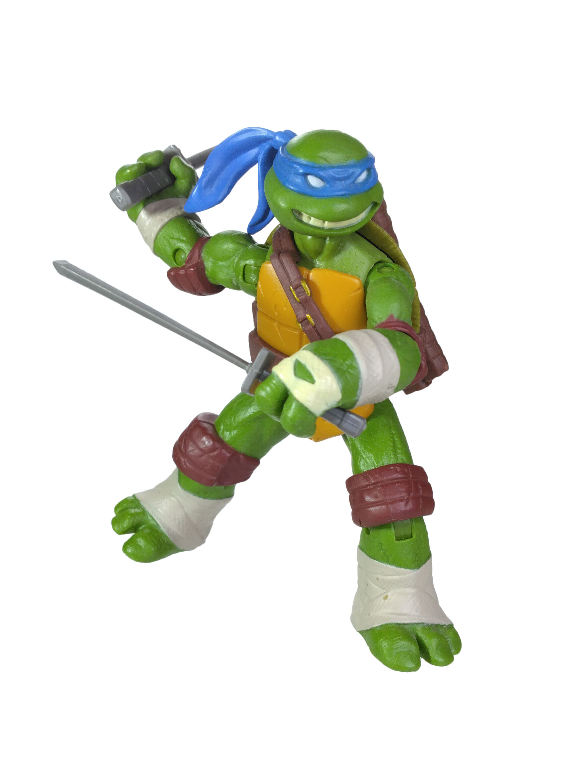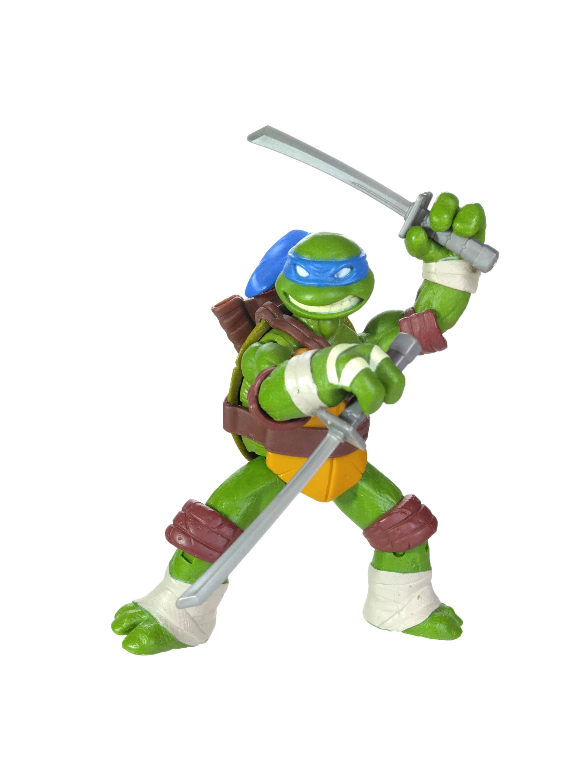 La peinture de cette figurine est relativement simpliste, mais ô combien efficace. Le plastique de la figurine est moulé dans une teinte verte sur laquelle sont rajoutées les autres peintures. Il est question du bleu pour le bandeau (avec assez souvent des bavures), du blanc pour les yeux, d’un blanc cassé pour les dents et les bandelettes, du brun pour les coudières et les genouillères. Notez au passage que les couleurs des bandelettes varient en fonction de la tortue. Leonardo est le seul à n’en posséder que des blanches.