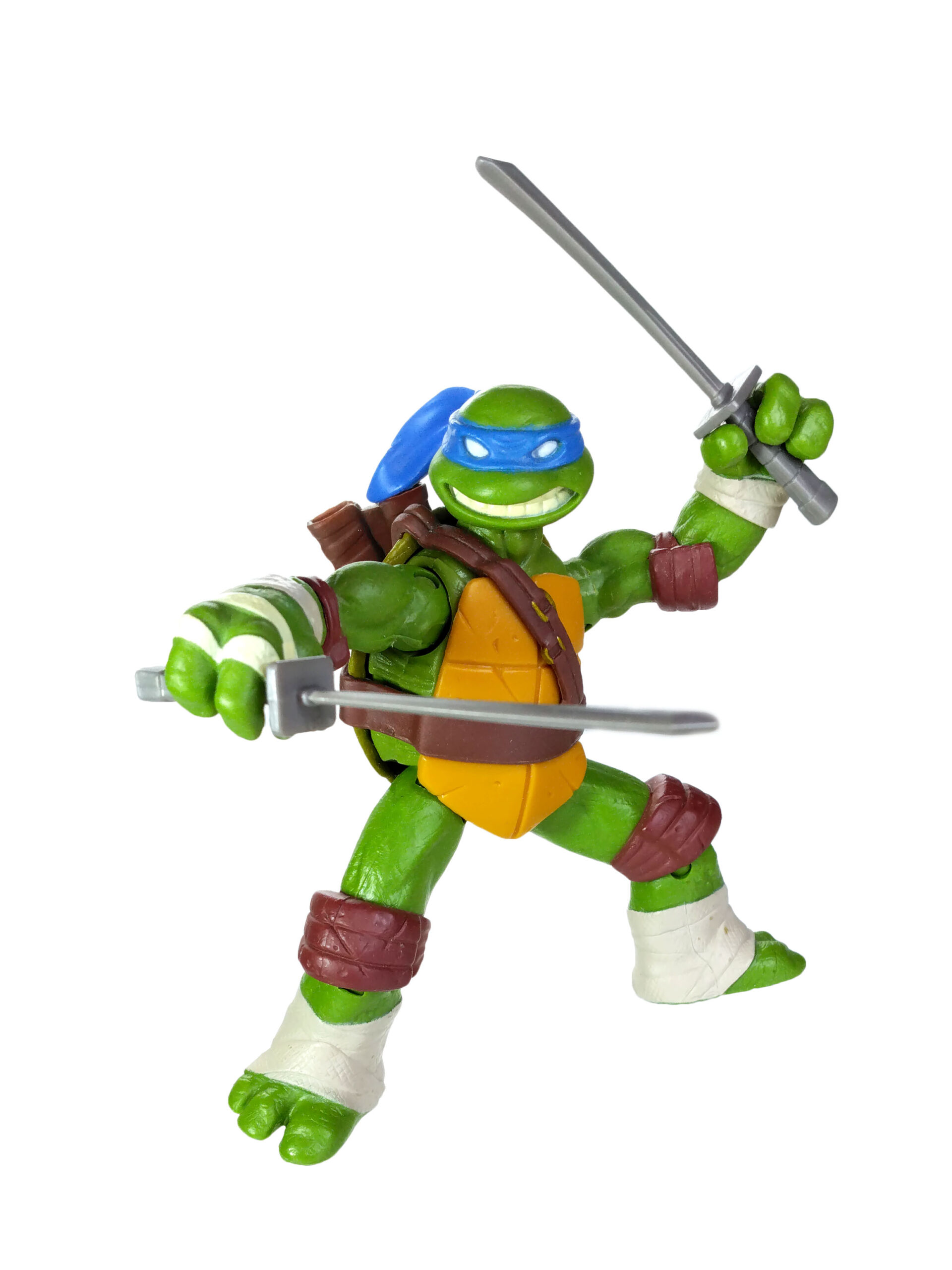 Les articulations sont excellente permettant de très nombreuses positions pour Leonardo, d’autant qu’il dispose d’une large gamme d’accessoires, tous très bien finis. En réalité le seul détail qui pourrait lui être reproché serait la peinture, qui reste très basique, mais finalement complète, surtout pour des enfants. Les armes quant à elles ne sont pas peintes, mais est-ce réellement un problème ? Le côté métallique est mis en avant sur les armes évitant des couleurs mal appropriées, comme le noir ou le brun.