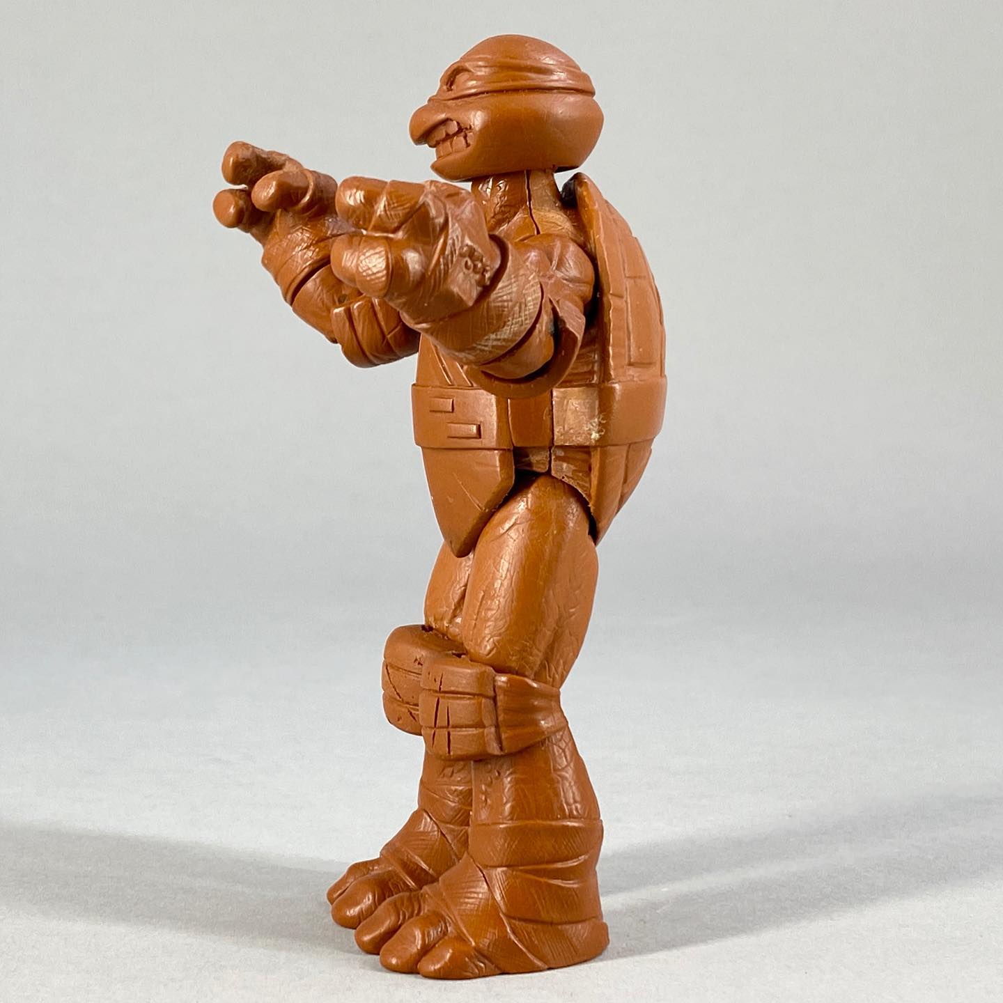 Bras et jambes sont entièrement articulés grâce au binôme vis/demi-disques. C’est particulièrement appréciable au niveau des avant-bras, puisque les poignets sont eux aussi munis d’une vis. C’est parfait pour orienter les armes. Une recette que Playmates ne gardera pas l’année suivante avec l’arrivée des Stealth tech turtles puis des autres gammes qui en découleront (Battle shell turtles par exemple) ; des articulations similaires, mais moins efficaces.