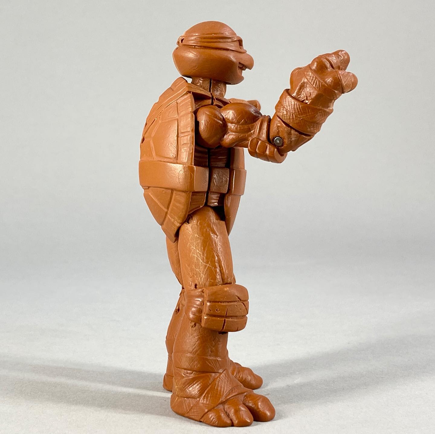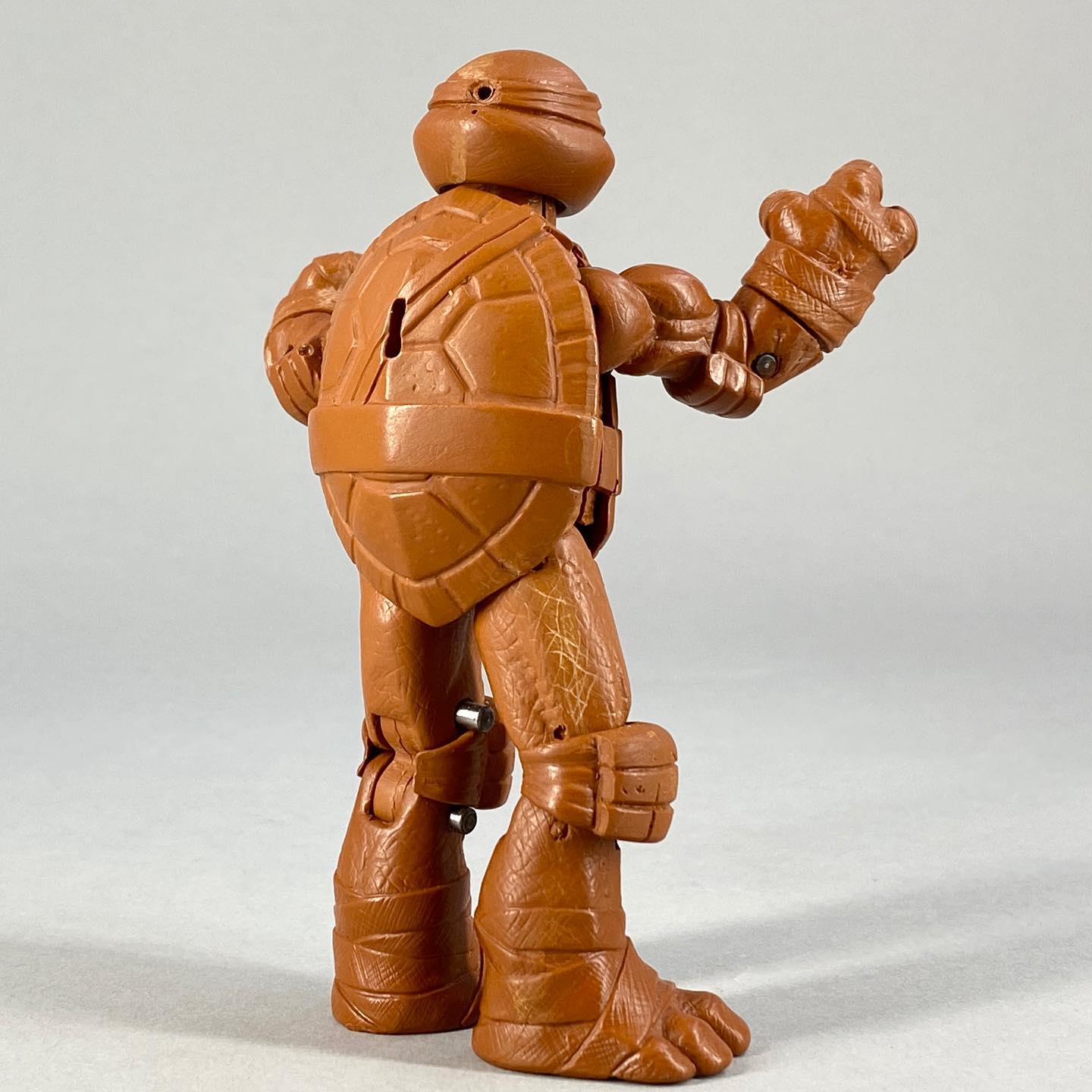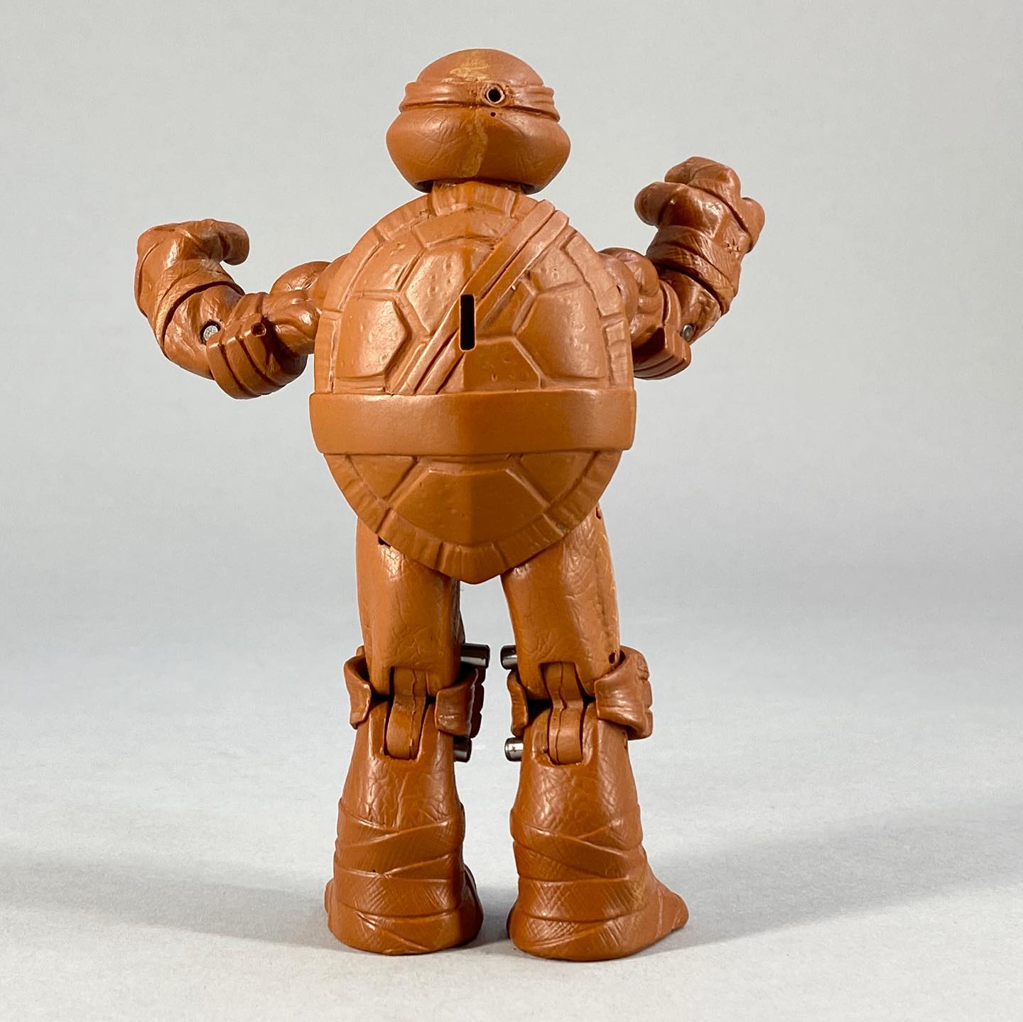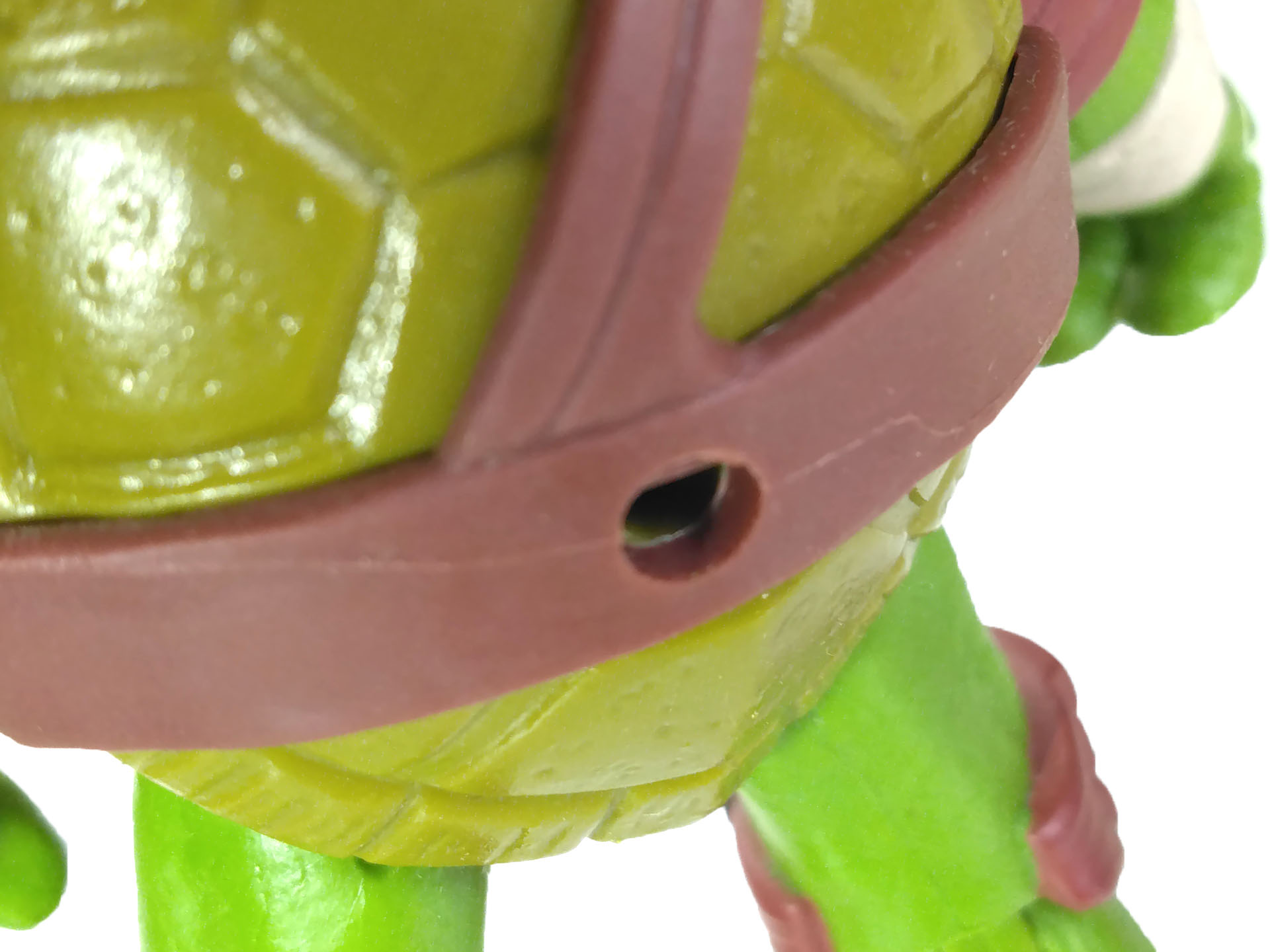 La carapace est réalisée dans un plastique plus rigide que le reste du corps. Elle est finement sculptée, avec de très belles incisions entre les plaques et des petits détails pour matérialiser les égratignures. Au niveau de la carapace se trouve un trou, dans lequel il est possible d’insérer le fourreau du ninja.
