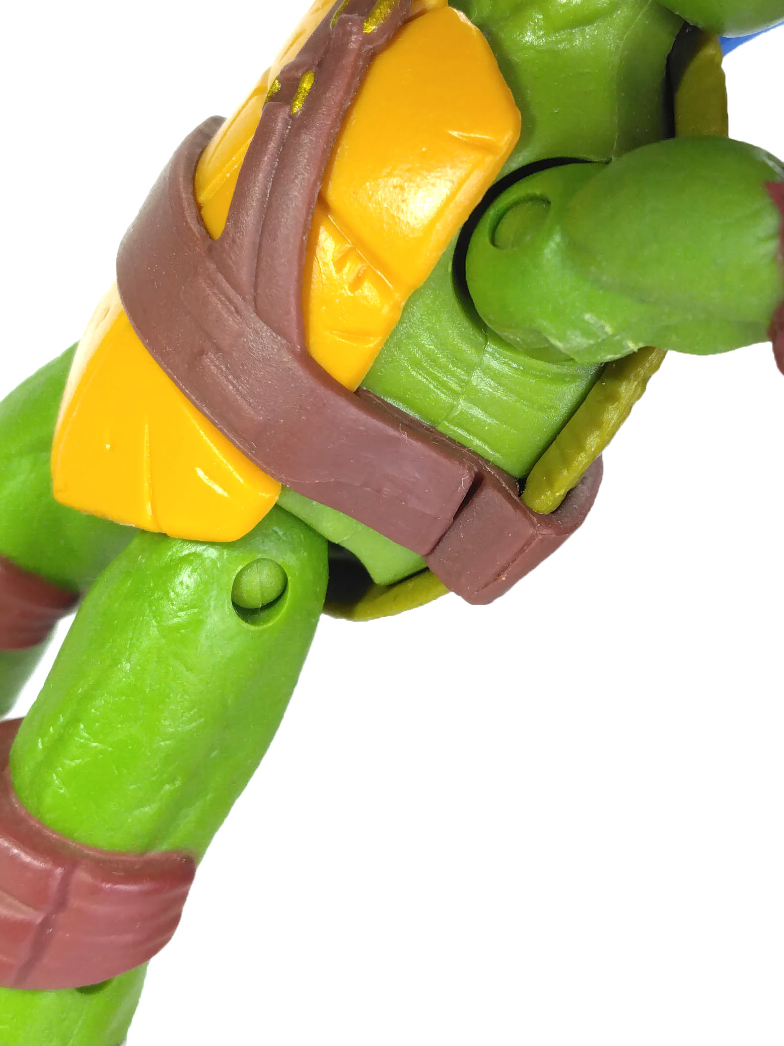 Notre personnage possède un mélange de plastique rigide, pour l’ensemble du corps, et de plastiques souples, au niveau du plastron, qui est une pièce rapportée, ainsi que la ceinture et le bandeau. La ceinture de Leonardo est formée d’une partie principale, horizontale, et de lanières transversales. Contrairement aux figurines précédemment produites par Playmates Toys, pour la première fois, il n’est pas possible de retirer la ceinture du mutant. Elle est collée au niveau du flanc droit du personnage. Vous pouvez forcer le point de colle, mais cela n’a aucun intérêt.