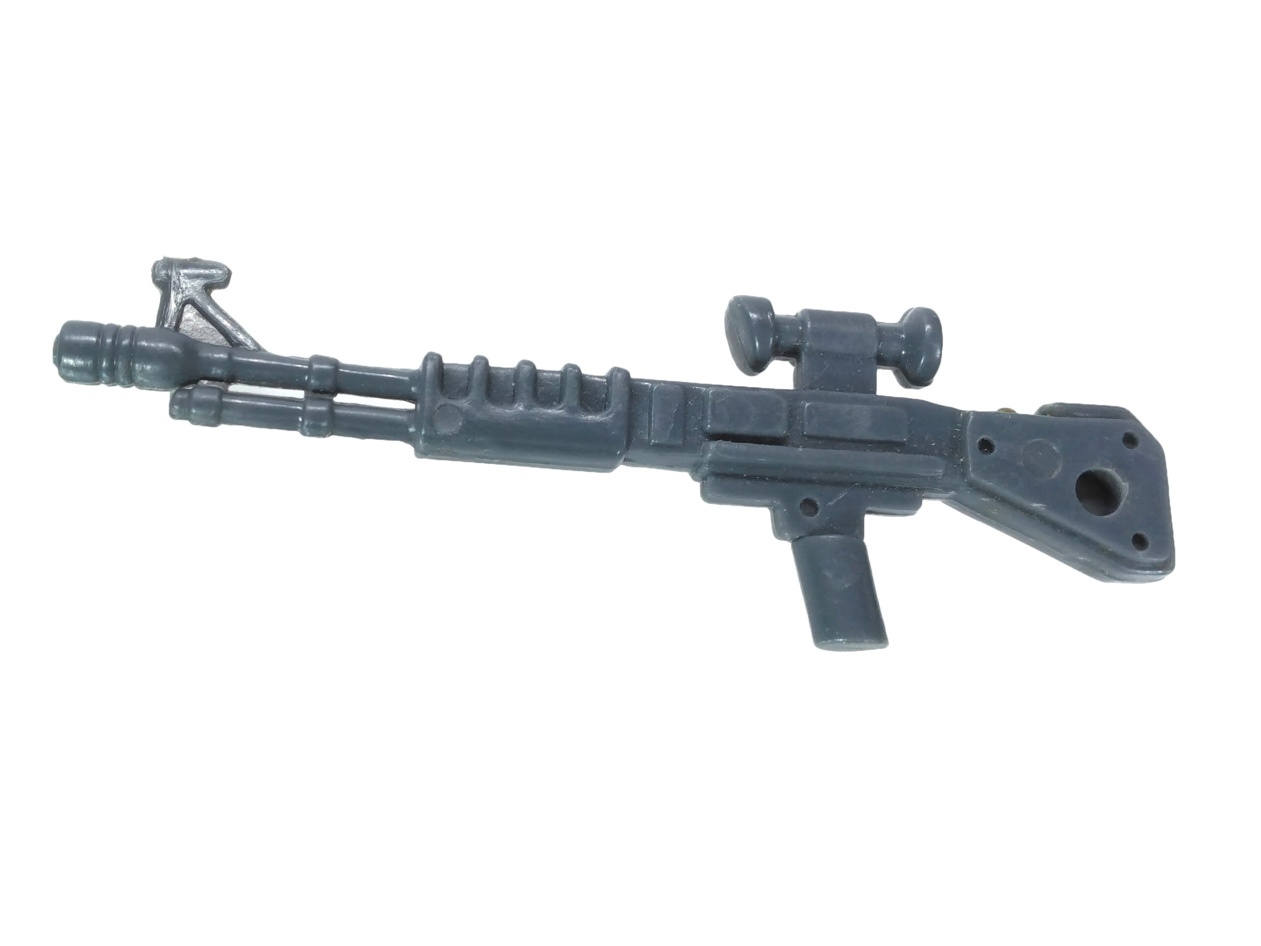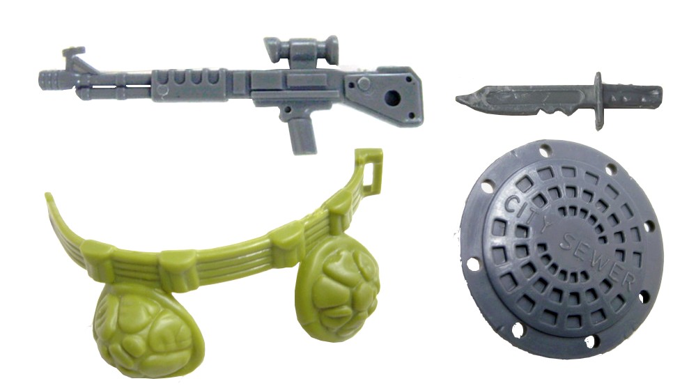 Le fusil de Rocksteady (dit fusil rétro-mutogène) est une arme bien plus réaliste que celle de Bebop. Elle est parsemée de détails, en revanche nous sommes loin des finitions de la perceuse du phacochère. Notre mutant possède également un couteau de combat. Celui-ci est strictement identique à celui du Foot soldier sorti en même temps. Enfin, à l’instar de son acolyte poilu, Rocksteady possède un bouclier, fait à partir d’une plaque d’égout. Celle-ci possède une poignée à l’arrière. L’avant est très finement sculpté, avec même une impression « city sewer » en son centre.