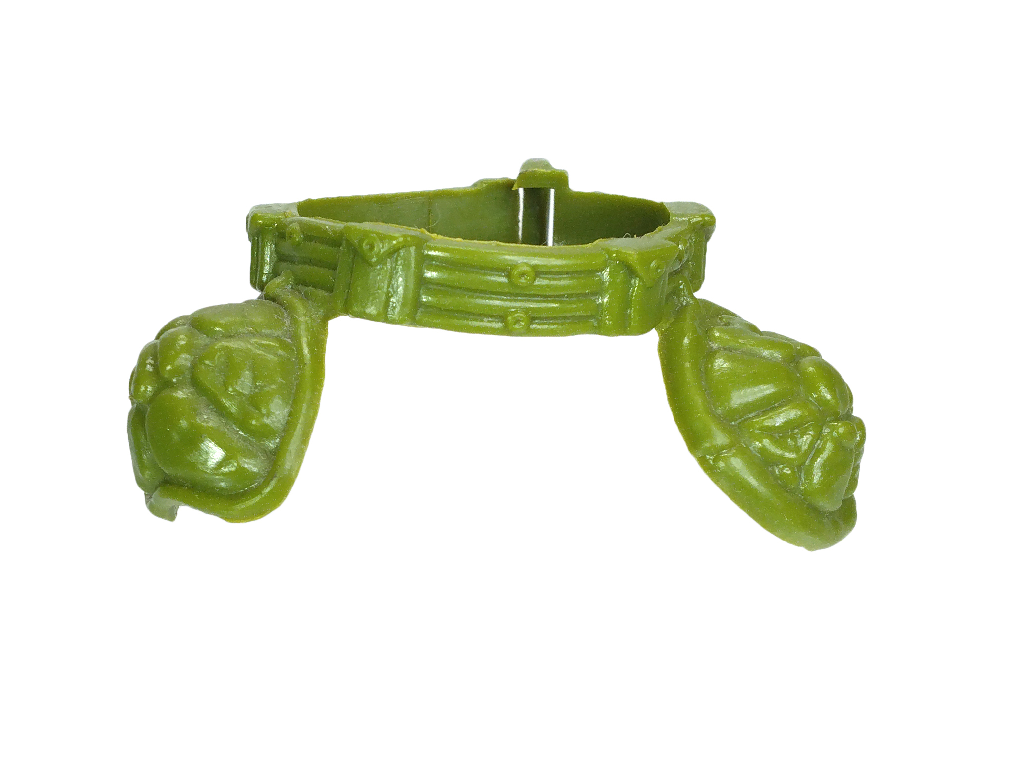 Les parties latérales sont agrémentées de deux carapaces de tortues, décrites dans la fiche bio du personnage comme ses deux trophées de chasse. Curieusement, cette ceinture se referme dans le dos, et non à l’avant du personnage. C’est ainsi qu’elle est fixée en usine. Et il n’est guère possible de la mettre autrement. En effet, les carapaces sont sculptées pour être légèrement plus en avant au niveau de la ceinture.