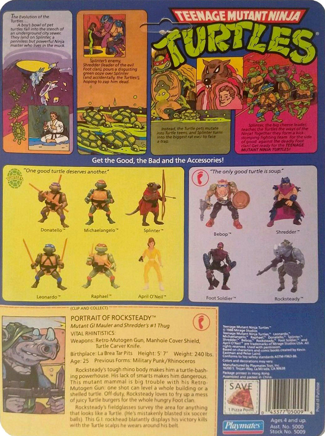 Sur le registre central les dix figurines de la première série sont présentées, divisées entre les six alliés et les quatre ennemis. Là encore, nous voyons le modèle hard copy peint de Rocksteady. Néanmoins, contrairement une fois encore à Bebop, il s’agit de la version achevée du prototype, avec les petites dents, tel qu’on le retrouve dans le livret de Playmates pour le Toy Fair. Le registre inférieur quant à lui est réservé à la carte biographique du personnage (en jaune), que l’on pouvait découper et collectionner, ainsi que les droits de la marque de l’autre côté. On pouvait également retrouver les fameux « Pizza Point », valant un point pour un blister de figurine. Ces points étaient à collecter et à renvoyer à Playmates pour gagner des cadeaux TMNT.