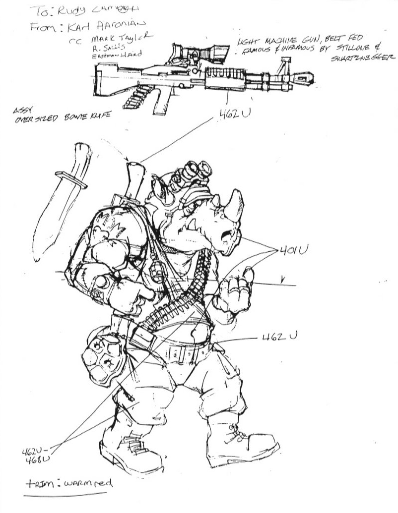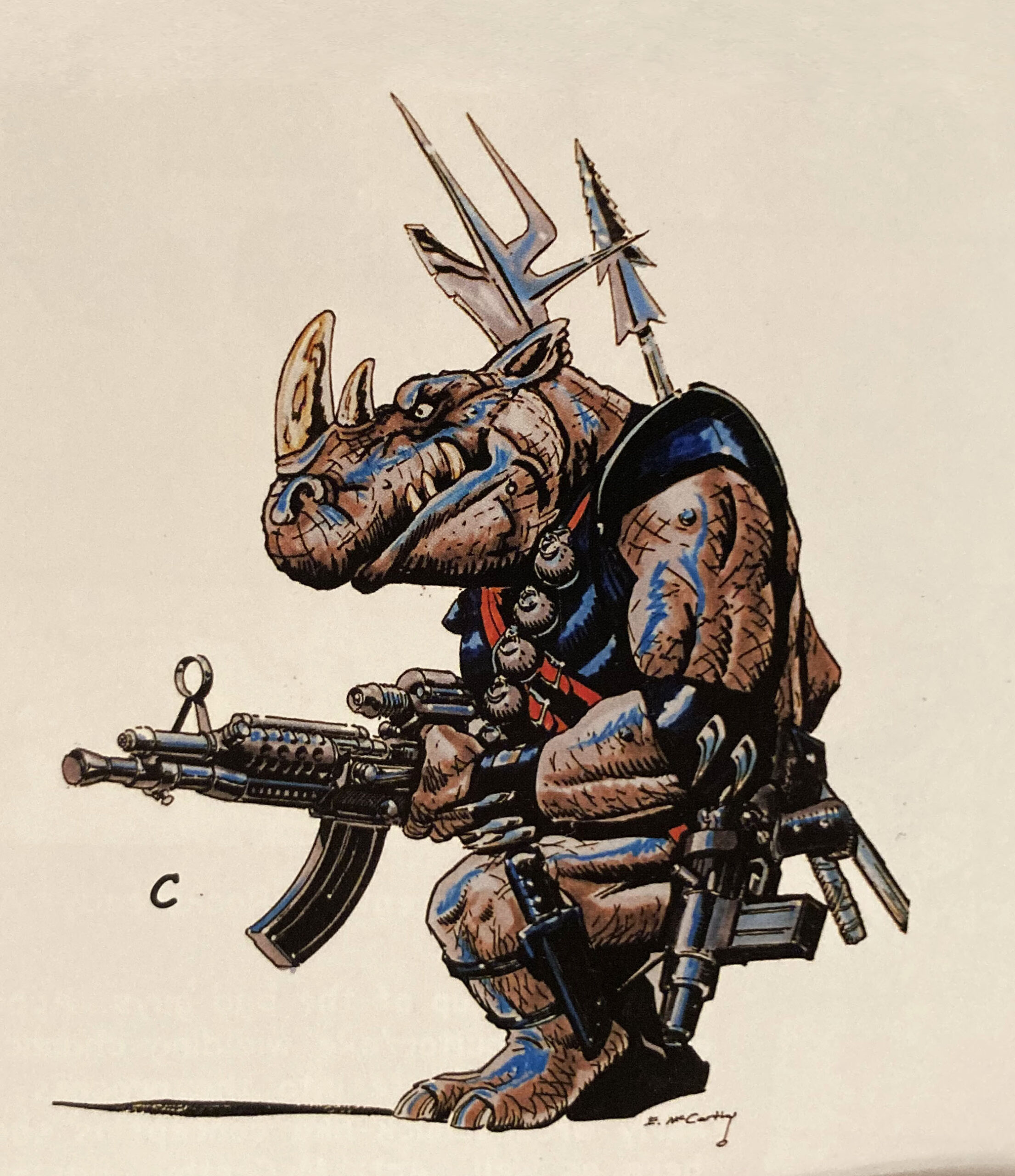 Poursuivant leurs études, l’accent fut mis sur deux des personnages, nommés par David Wise « Bebop et Rocksteady ». De nouveaux concepts étaient proposés par Eastman et Laird. Les cocréateurs des tortues s’orientaient plutôt vers une apparence de punk que de samurais ou de guerriers légendaires. Le phacochère arborait deux ceintures de munitions croisées sur la poitrine. Le rhinocéros obtenait des grenades sur sa veste et tout un stock d’armes lourdes (Fig. 3 à 7). Errol McCarthy se chargeait des dernières modifications dans leur aspect physique.