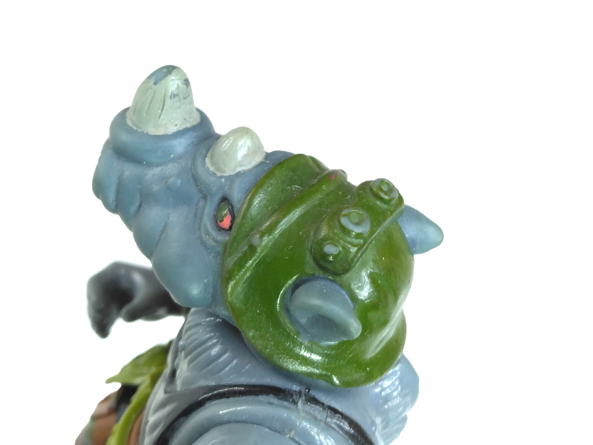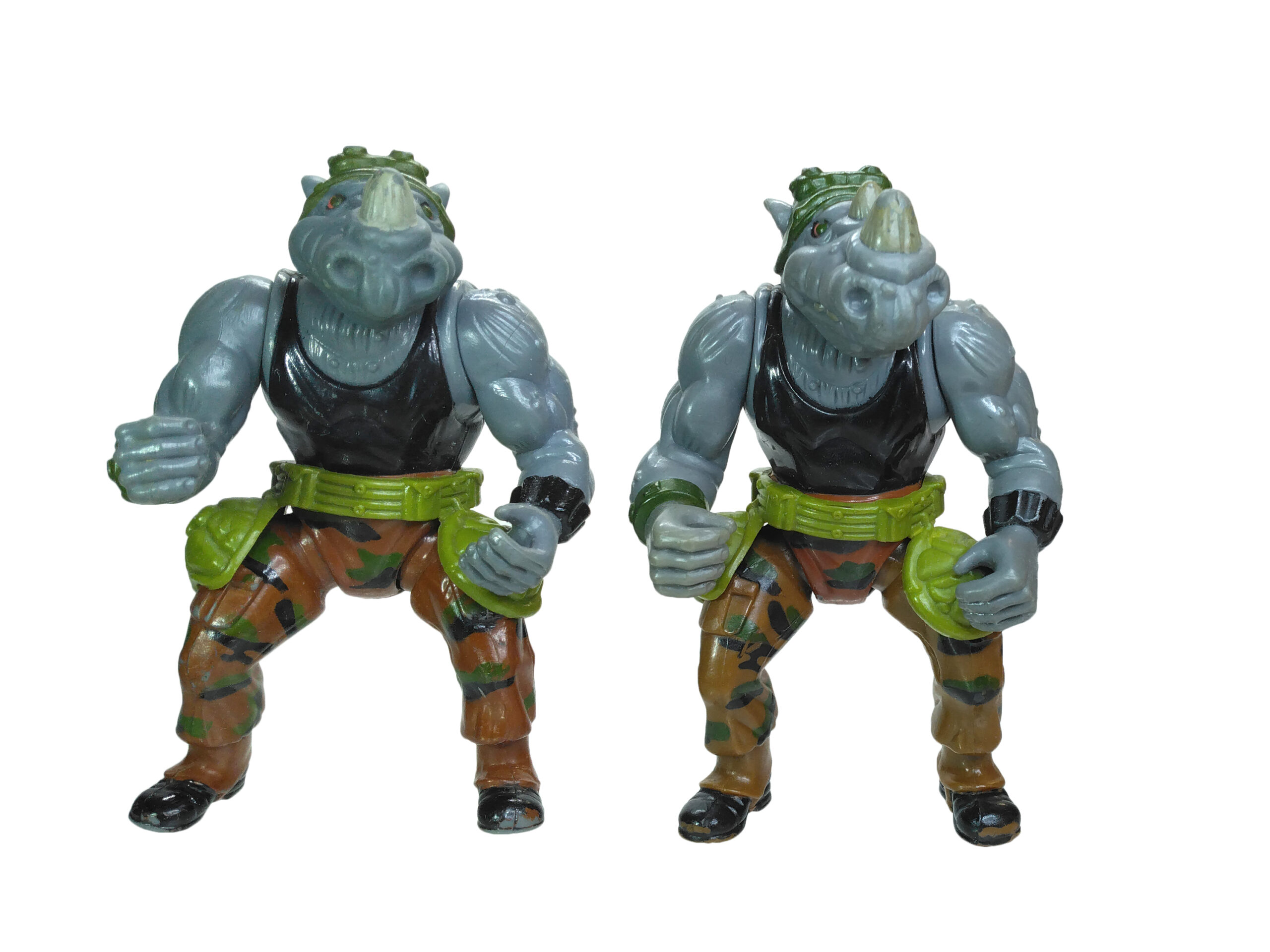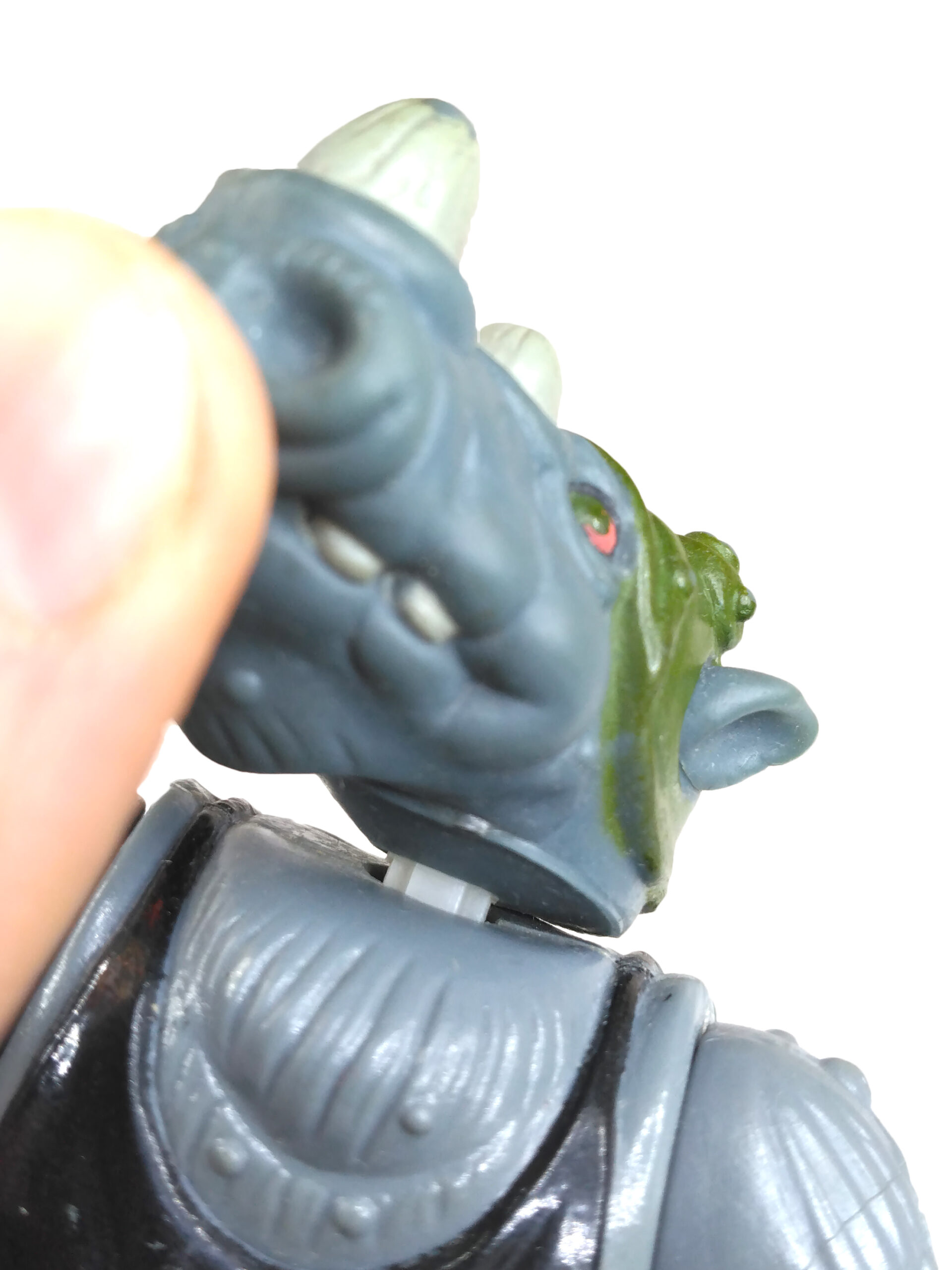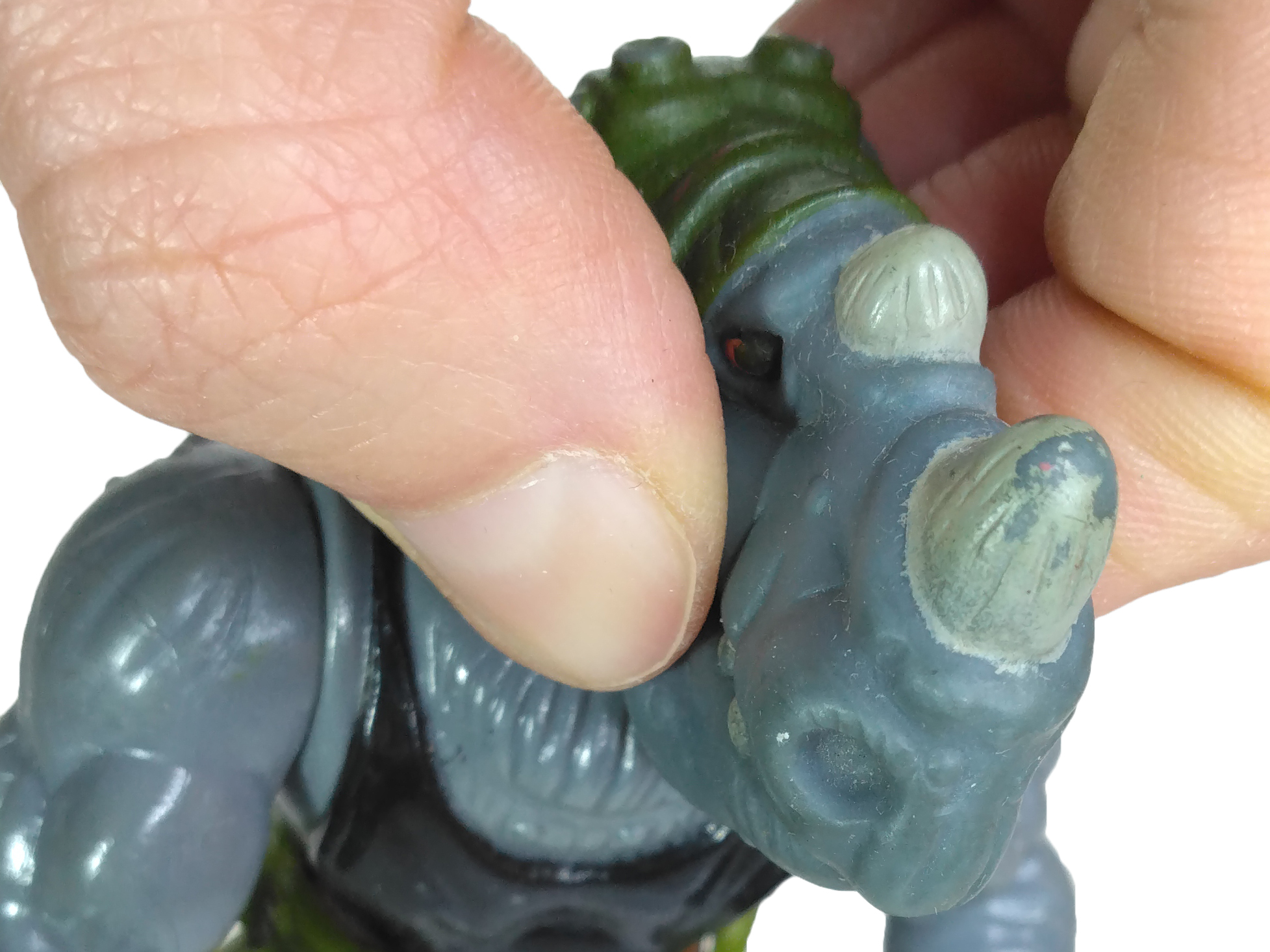 Le rhinocéros est connu dans le milieu de la collection pour avoir une variante de peinture au niveau de son visage. Certaines apparaissent en effet légèrement plus bleutées que d’autres. Cela n’arrive que sur les figurines soft head. Il serait plutôt question de l’altération du plastique mou à travers le temps et des conditions de conservation plutôt que d’une variante à proprement parler. On retrouve ce problème sur les figurines de 1989, donnant par exemple l’impression d’être en caoutchouc (Leatherhead, Genghis Frog). Il n’en est rien. Ce n’est que l’altération du plastique.