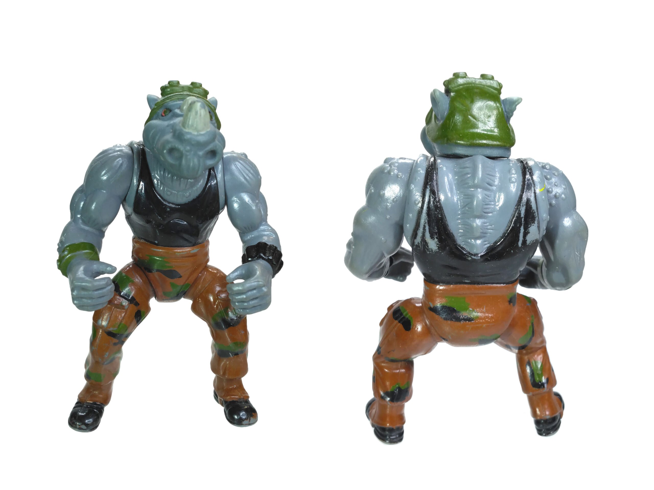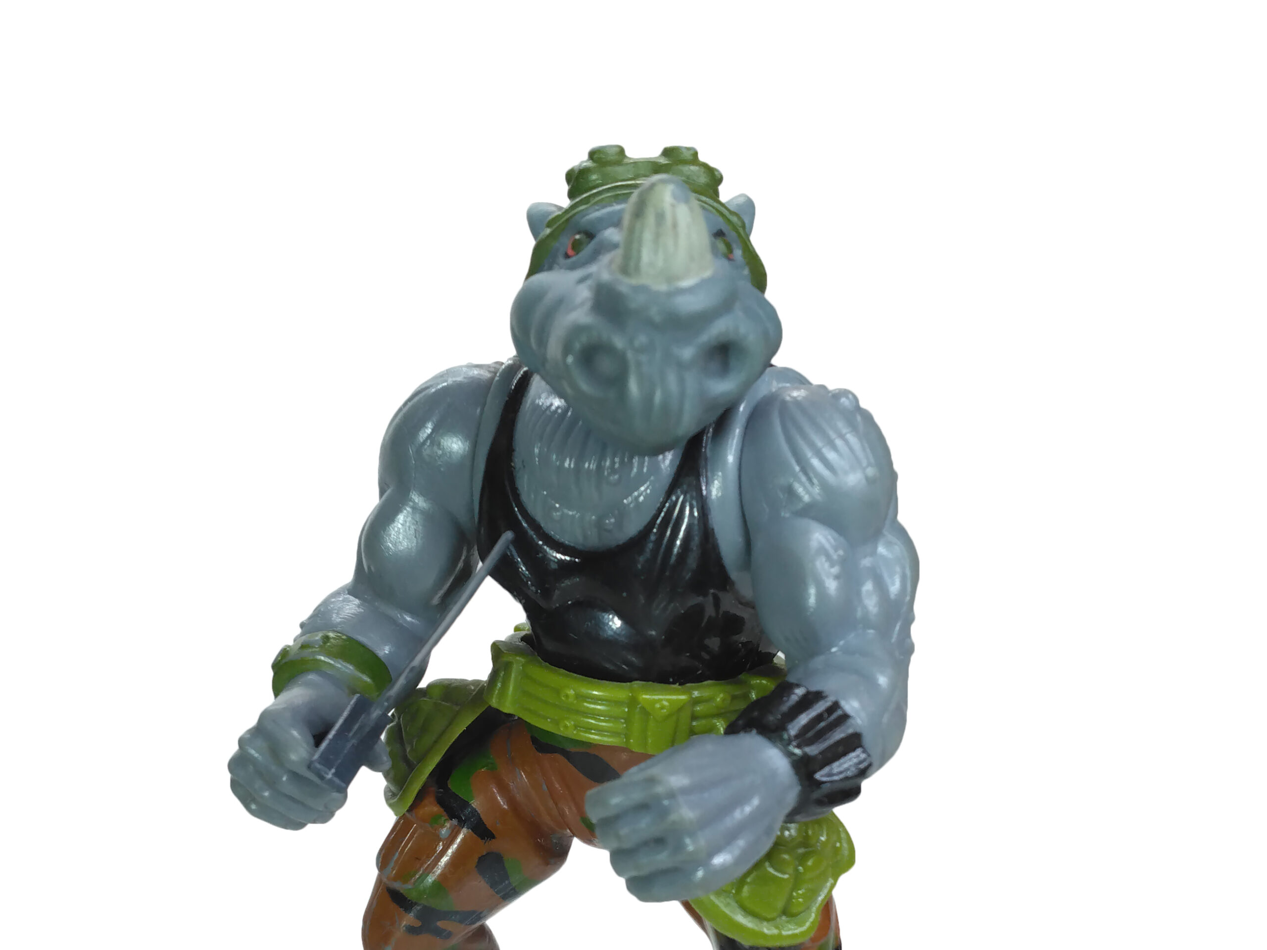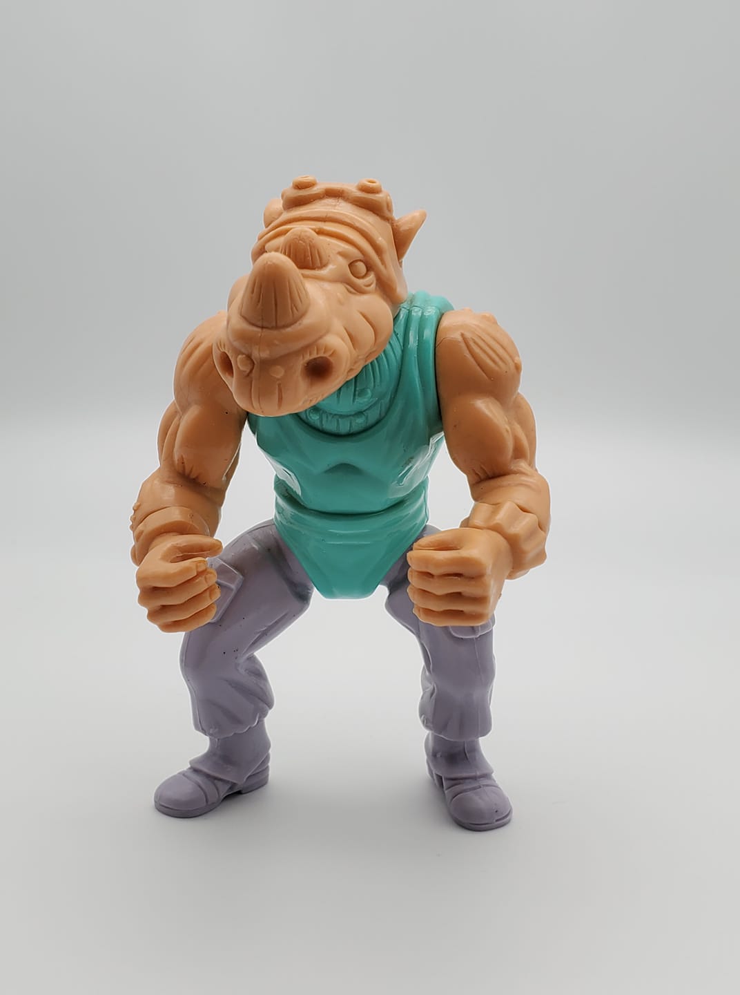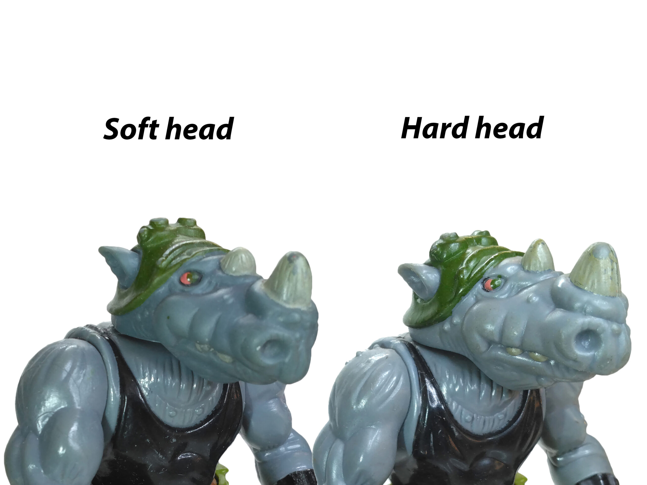Le rhinocéros est connu dans le milieu de la collection pour avoir une variante de peinture au niveau de son visage. Certaines apparaissent en effet légèrement plus bleutées que d’autres. Cela n’arrive que sur les figurines soft head. Il serait plutôt question de l’altération du plastique mou à travers le temps et des conditions de conservation plutôt que d’une variante à proprement parler. On retrouve ce problème sur les figurines de 1989, donnant par exemple l’impression d’être en caoutchouc (Leatherhead, Genghis Frog). Il n’en est rien. Ce n’est que l’altération du plastique.