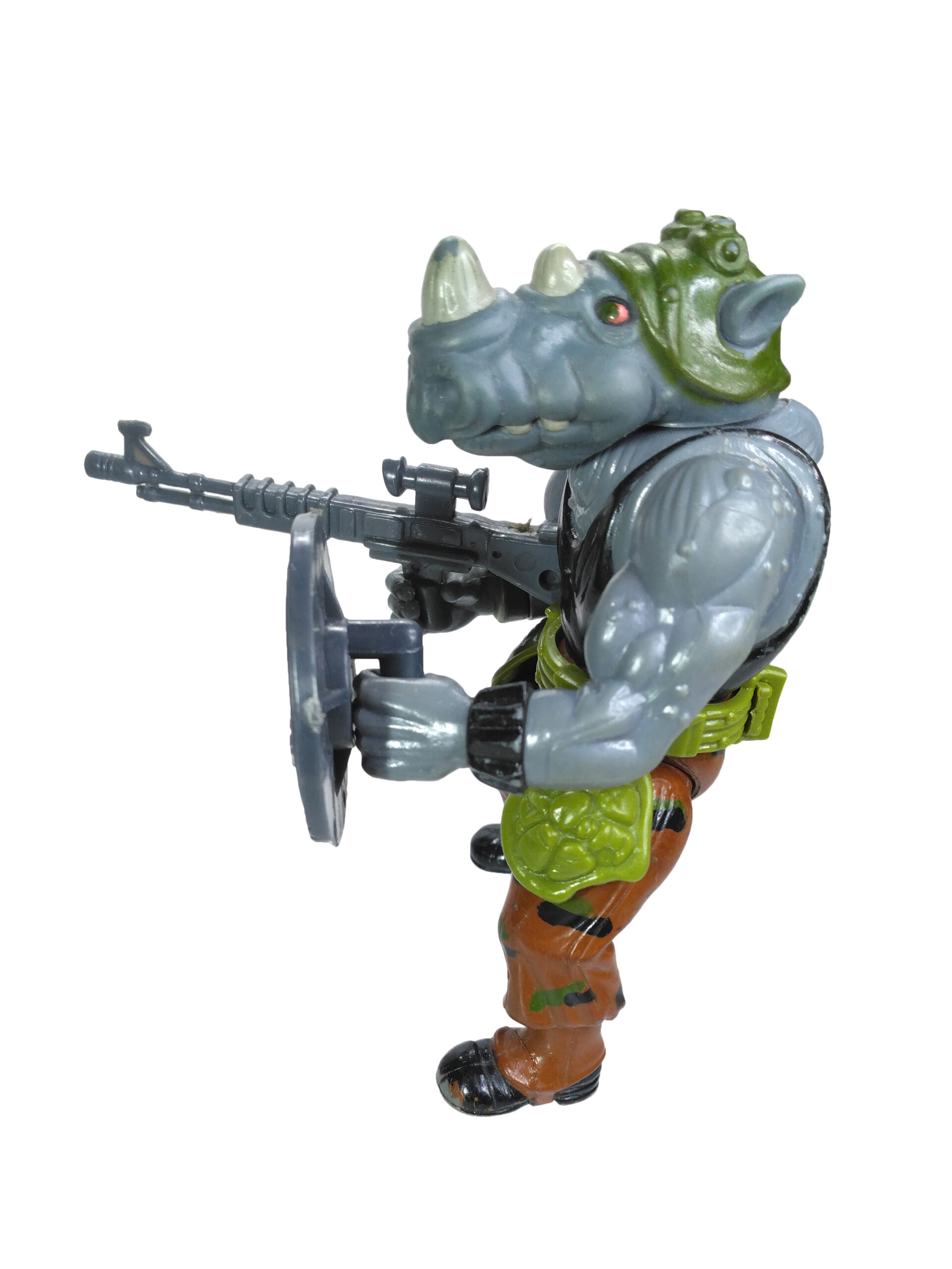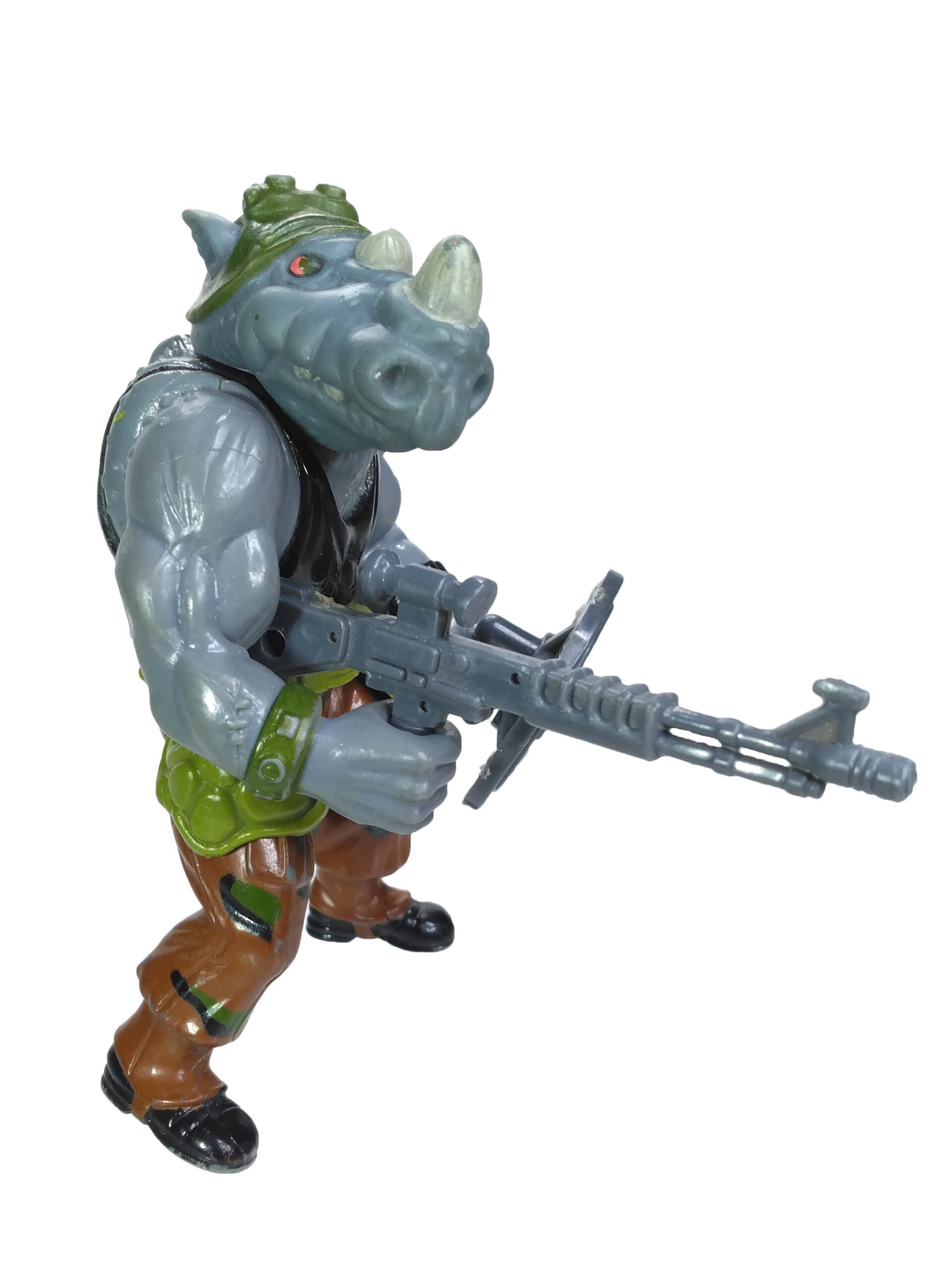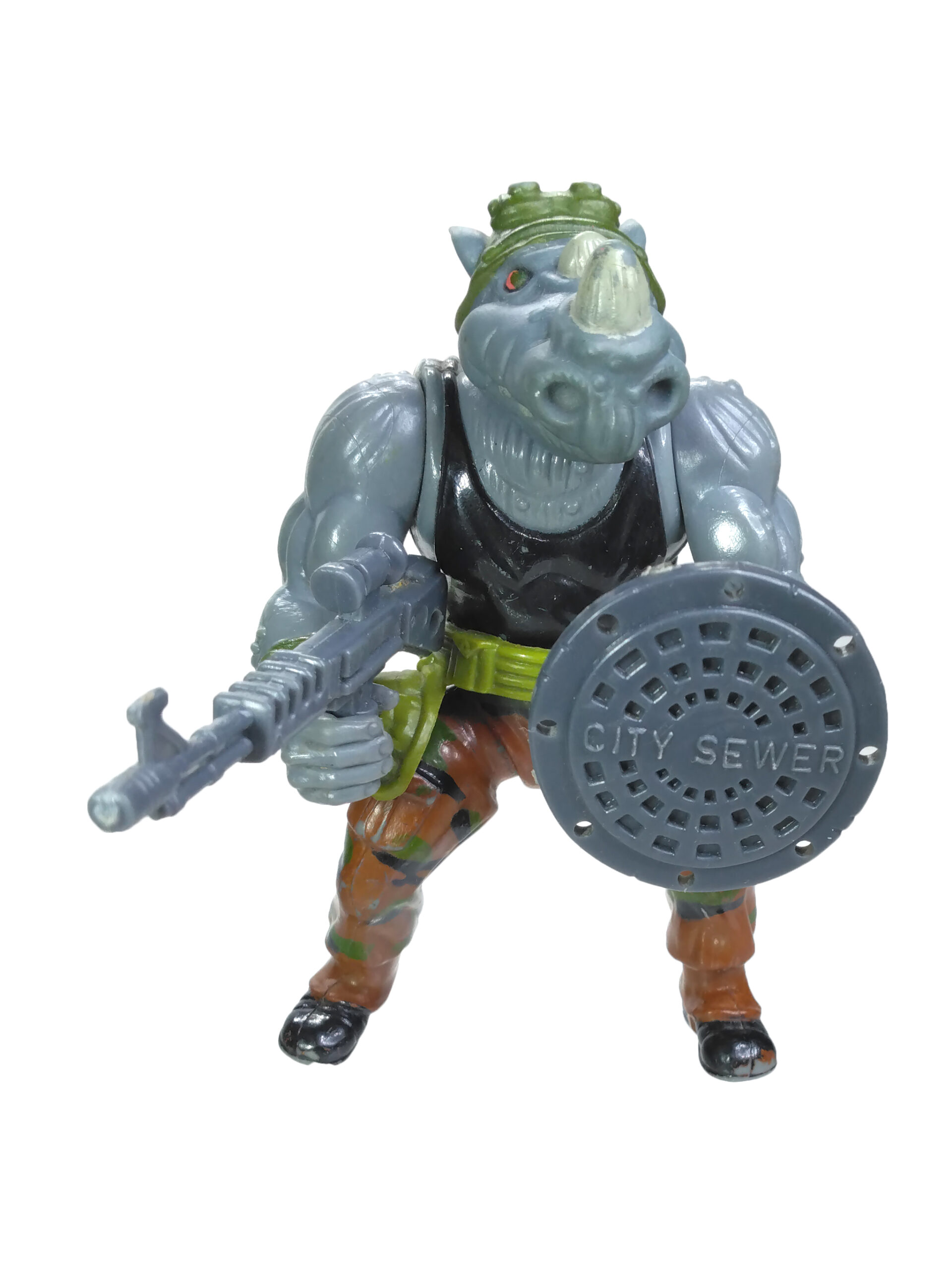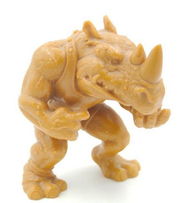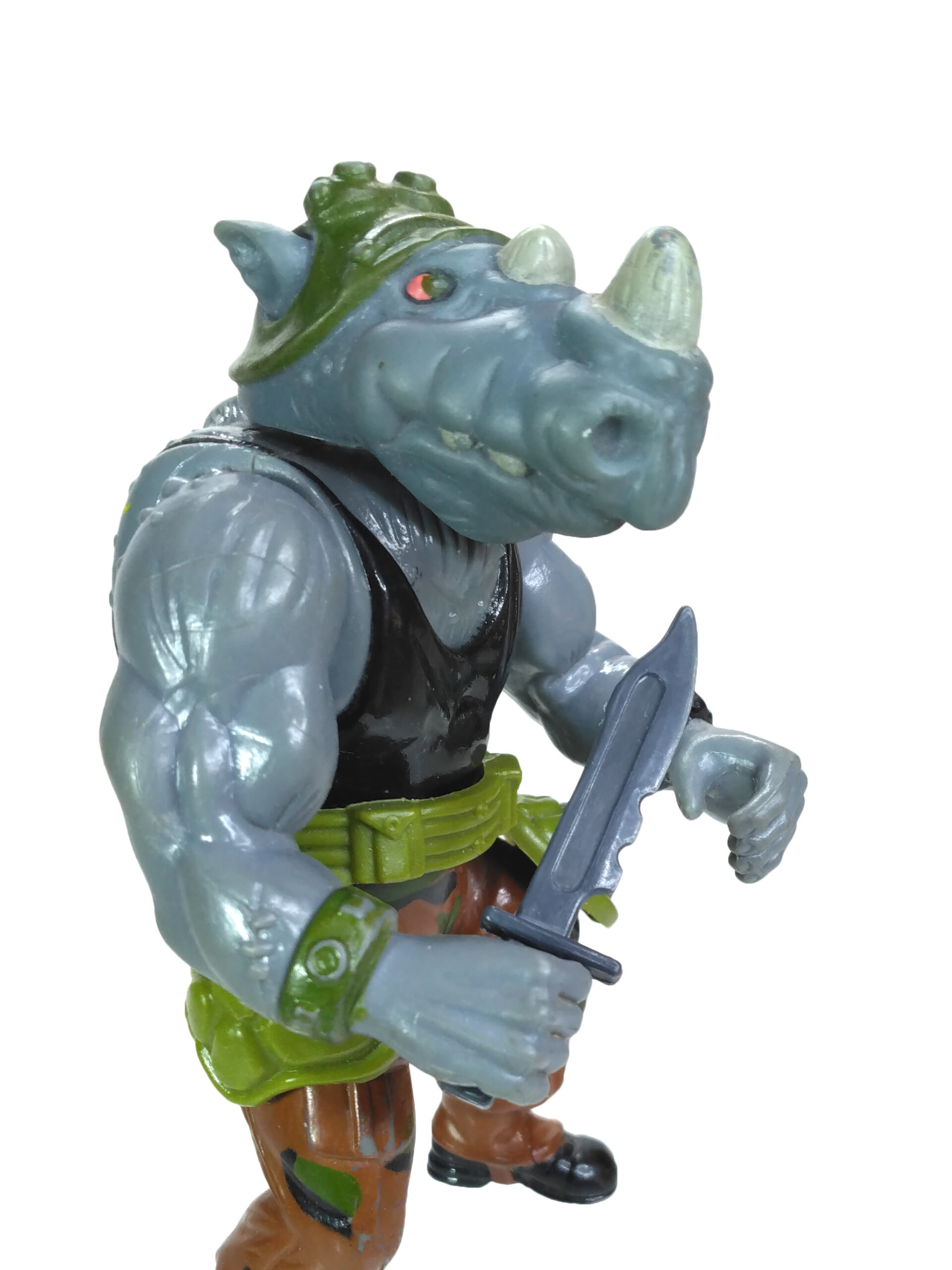 Le rhinocéros est connu dans le milieu de la collection pour avoir une variante de peinture au niveau de son visage. Certaines apparaissent en effet légèrement plus bleutées que d’autres. Cela n’arrive que sur les figurines soft head. Il serait plutôt question de l’altération du plastique mou à travers le temps et des conditions de conservation plutôt que d’une variante à proprement parler. On retrouve ce problème sur les figurines de 1989, donnant par exemple l’impression d’être en caoutchouc (Leatherhead, Genghis Frog). Il n’en est rien. Ce n’est que l’altération du plastique.